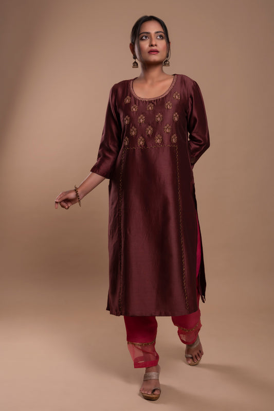 Brown Fine Chanderi Kurta Set