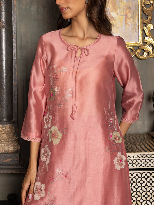 onion pink silk chanderi thread and fabric cutwork work kurta