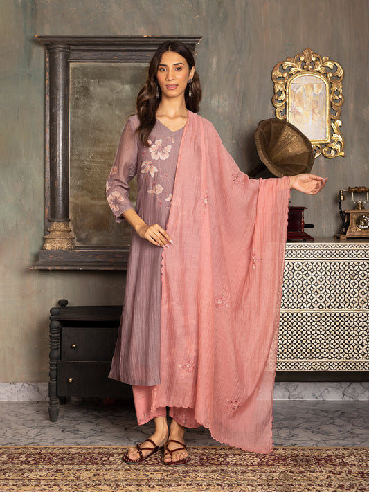 Mauve mul chanderi thread and fabric cutwork kurta set