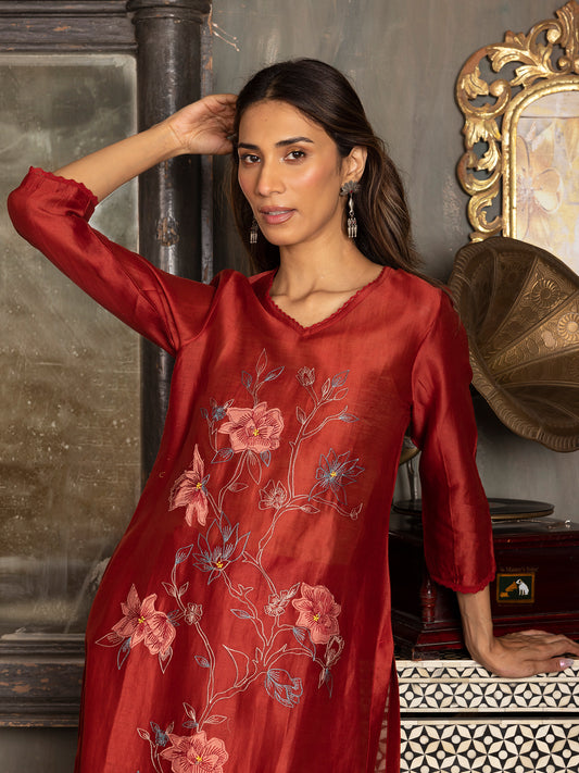 Rani pink mul chanderi thread and fabric cutwork work kurta