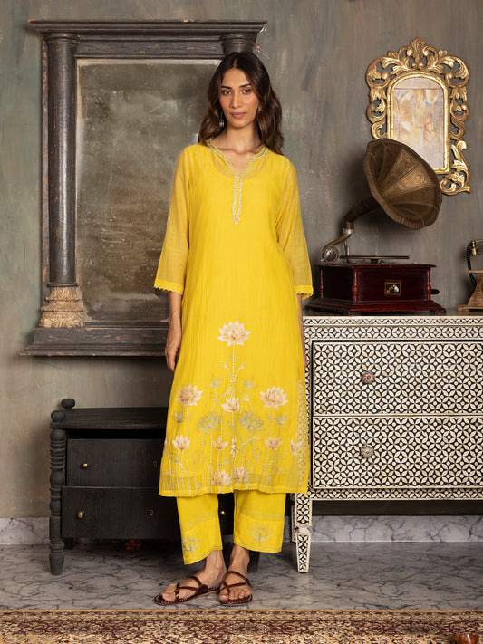 Lemon yellow mul chanderi thread and fabric cutwork work kurta set