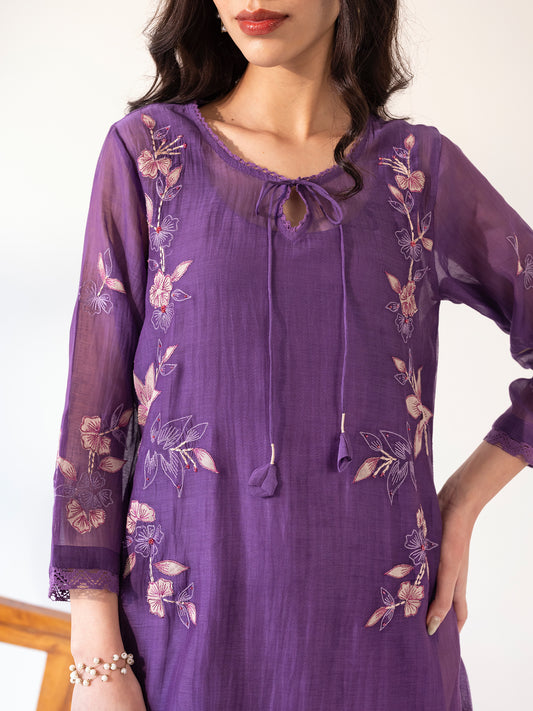 Purple mul chanderi thread and fabric cutwork kurta set