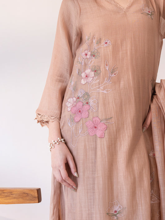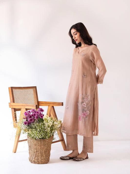 Beige mul chanderi thread and fabric cutwork work kurta set