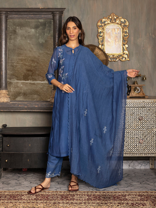 Navy blue mul chanderi thread and fabric cutwork kurta