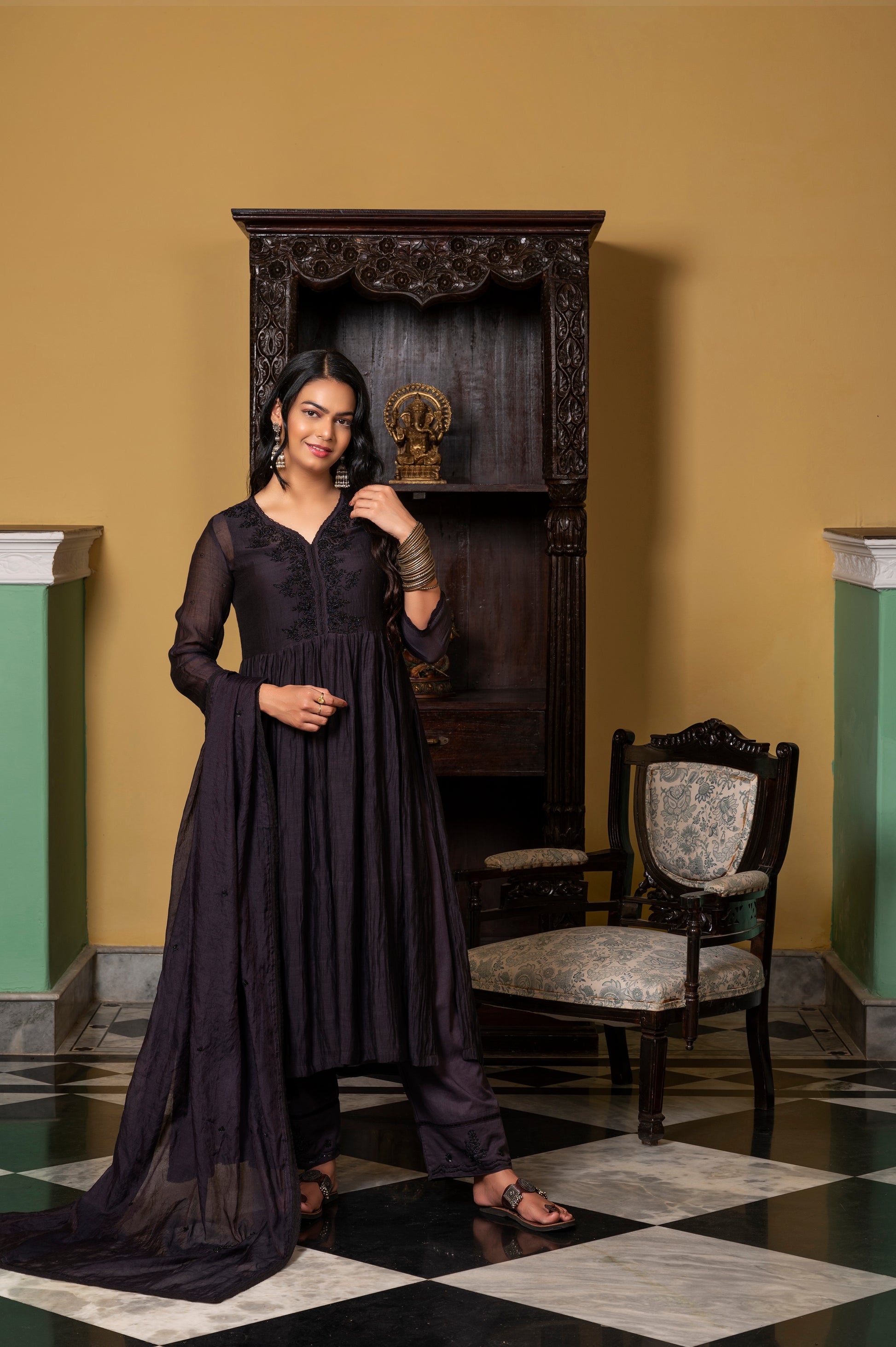 - EMBROIDERY: Beadwork, sequins, and zardozi work. The front yoke of the kurta features floral motifs made of intricate zardozi, sequin, and beadwork around the neckline.