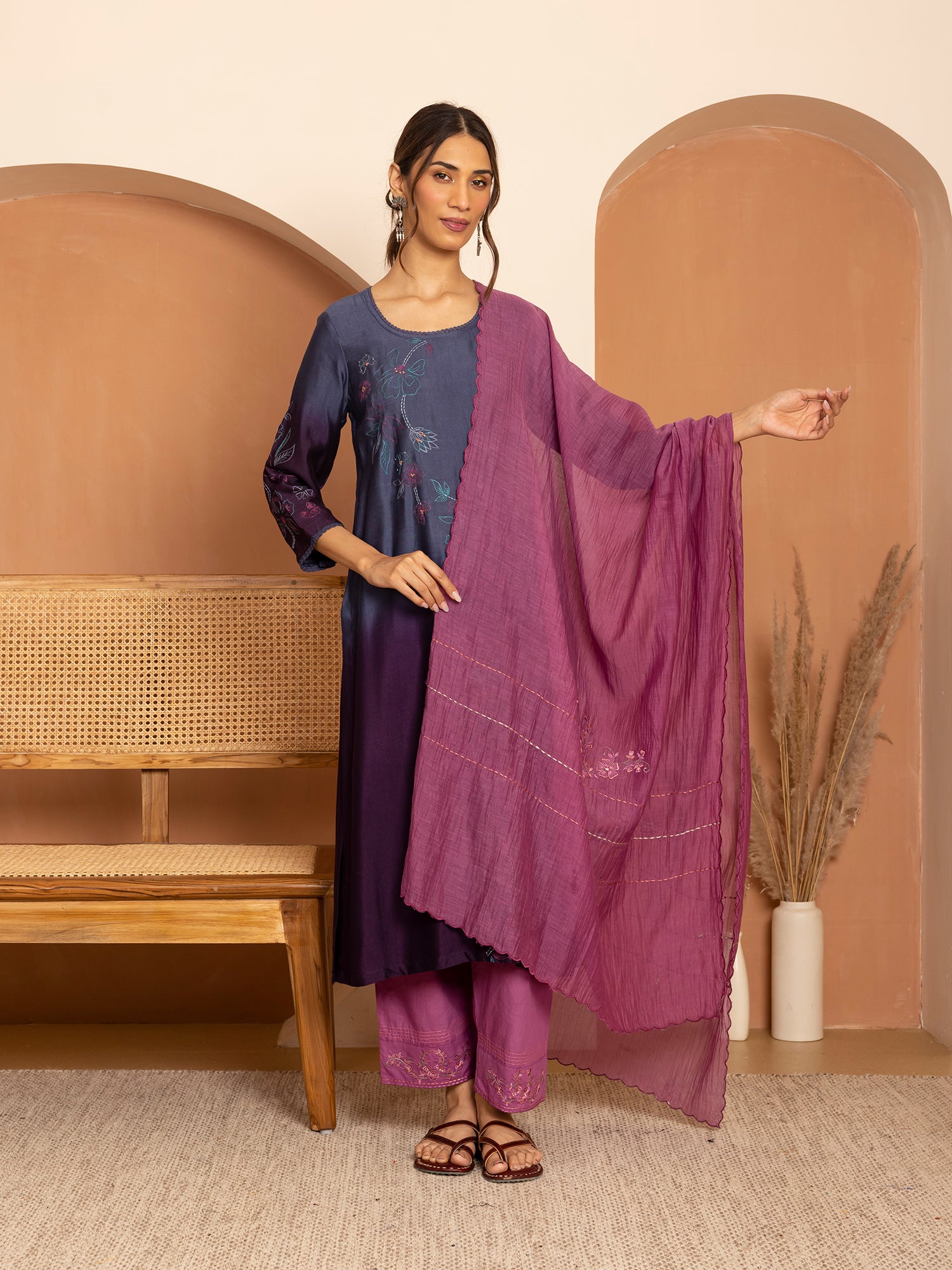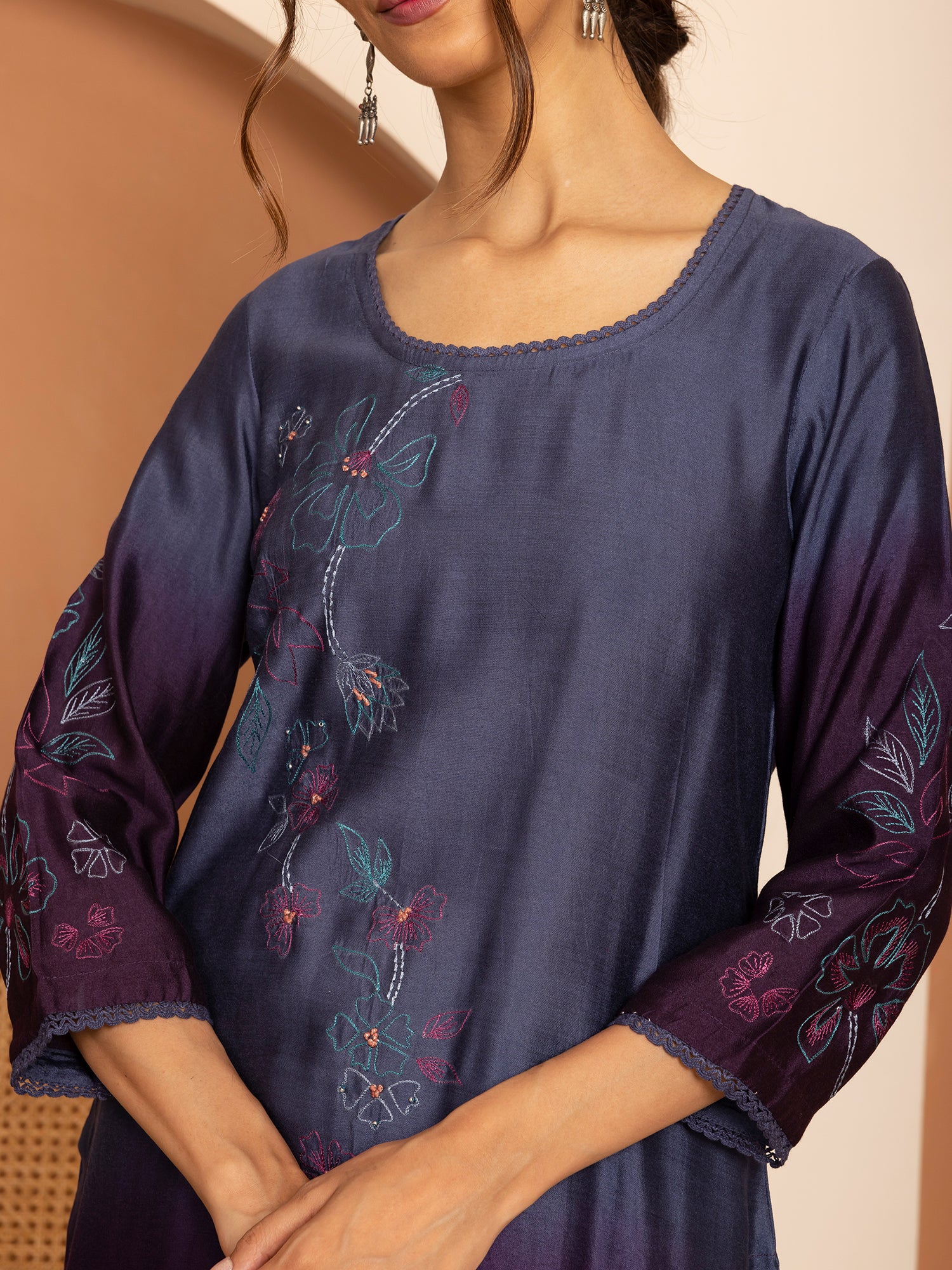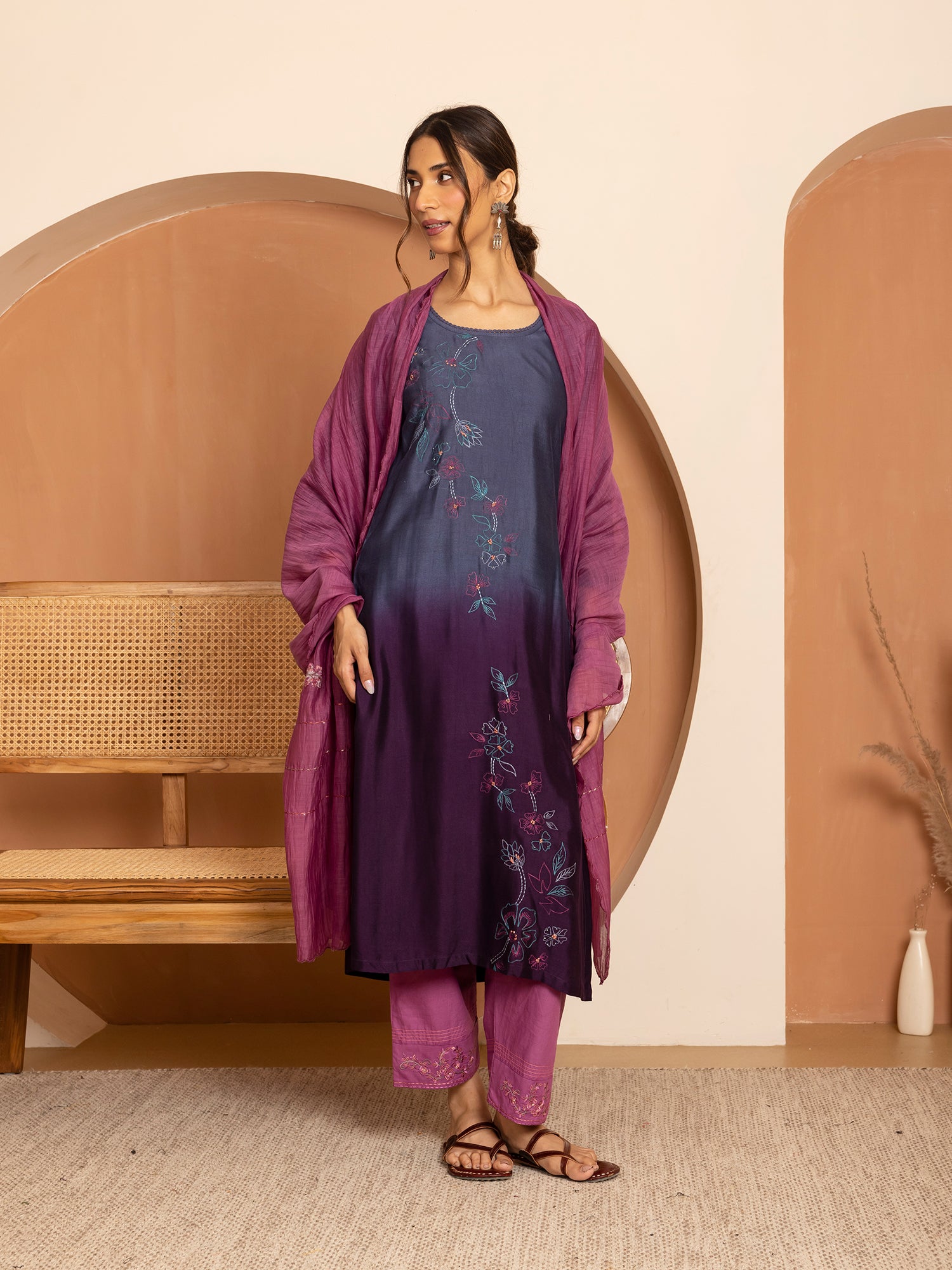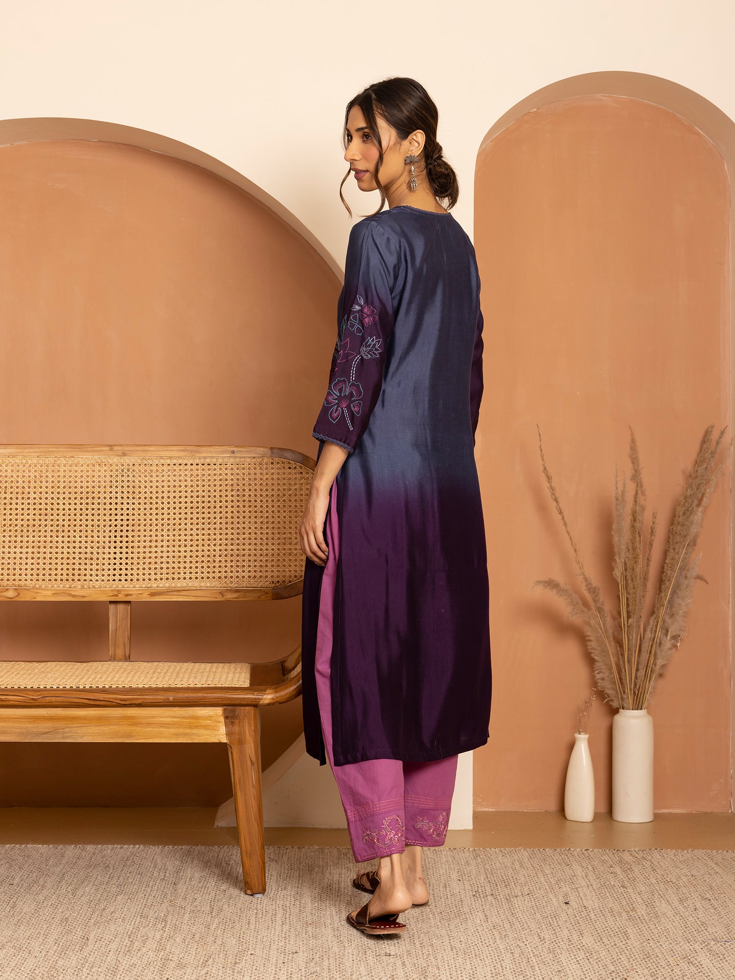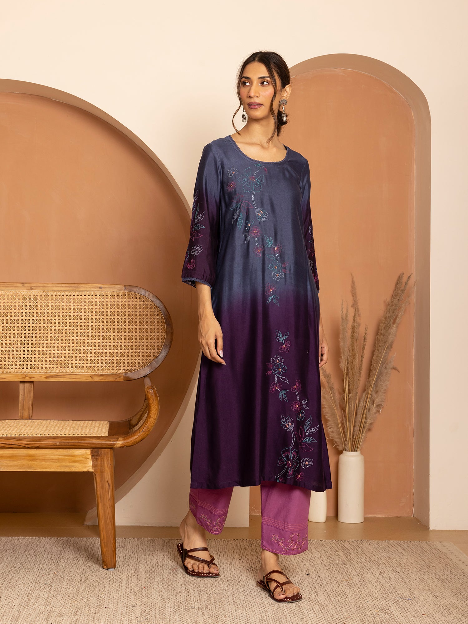 blue and purple ombrey bamboo silk with thread and bead embroidery kurta