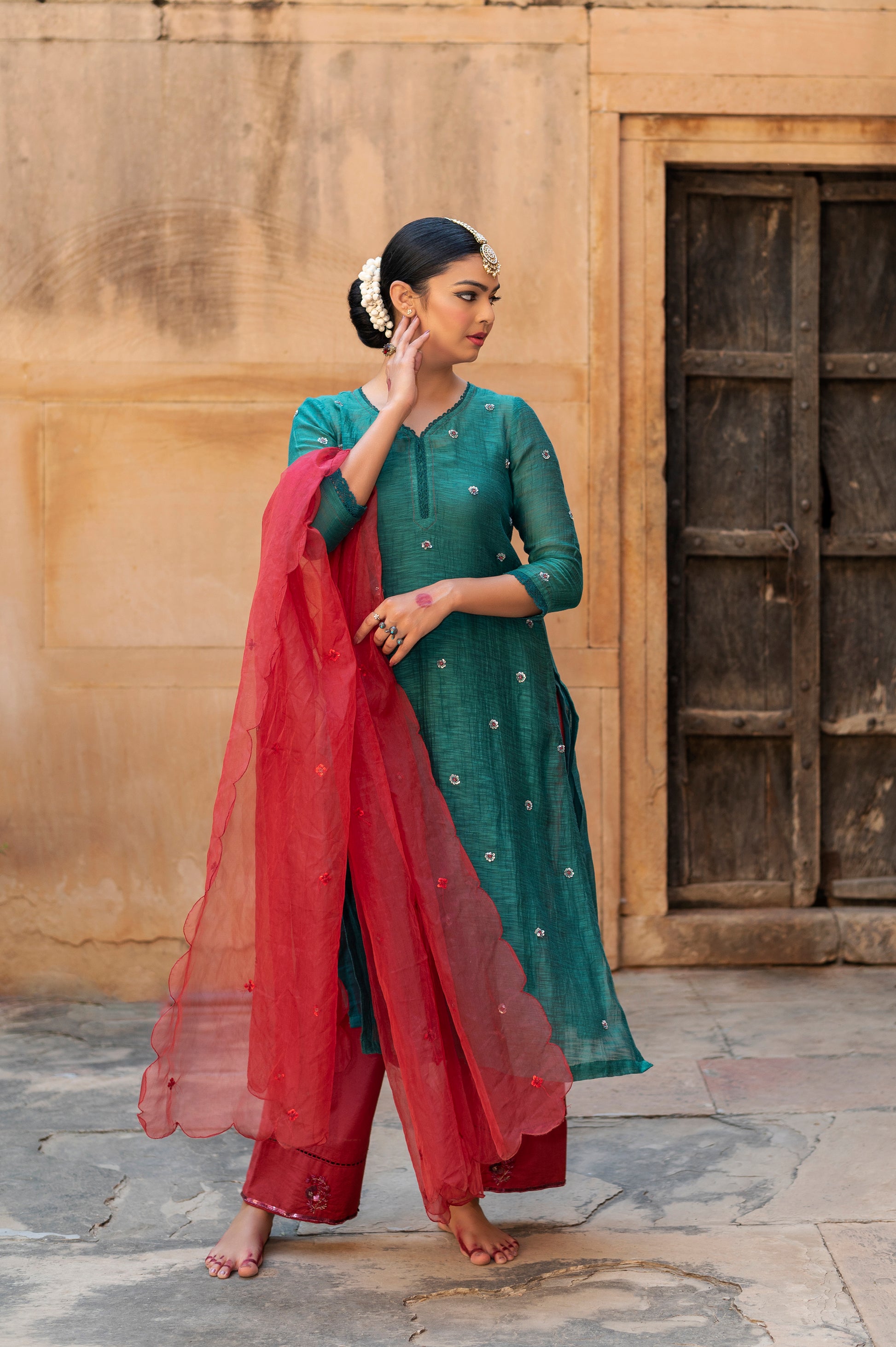 - DETAILS: The silk organza dupatta features scalloping around the edges with motifs made of intricate zardozi and sequins spread evenly.
