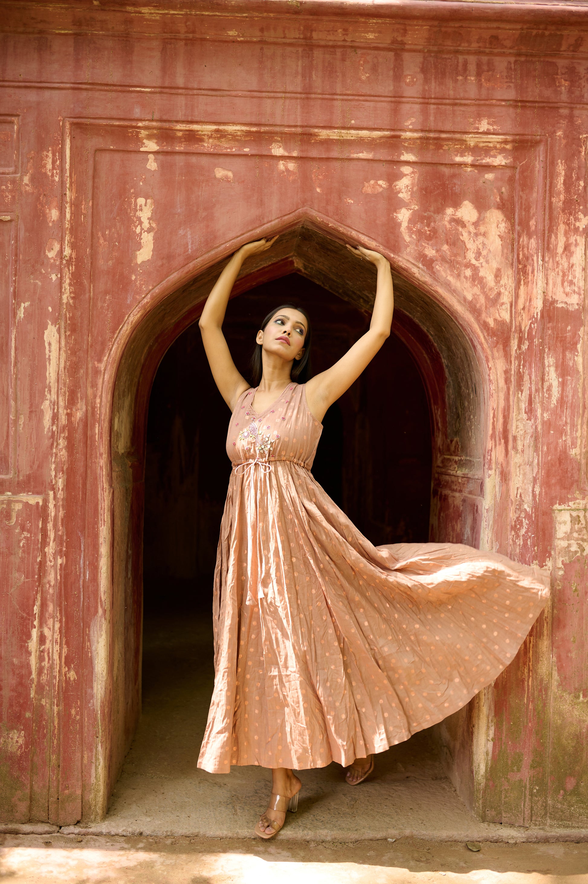 - DETAILS: The front yoke features peacock and floral zardozi embroidery, gathered under bust, waist with a front drawstring in order to adjust the gathers, and attached matching mulmul lining.