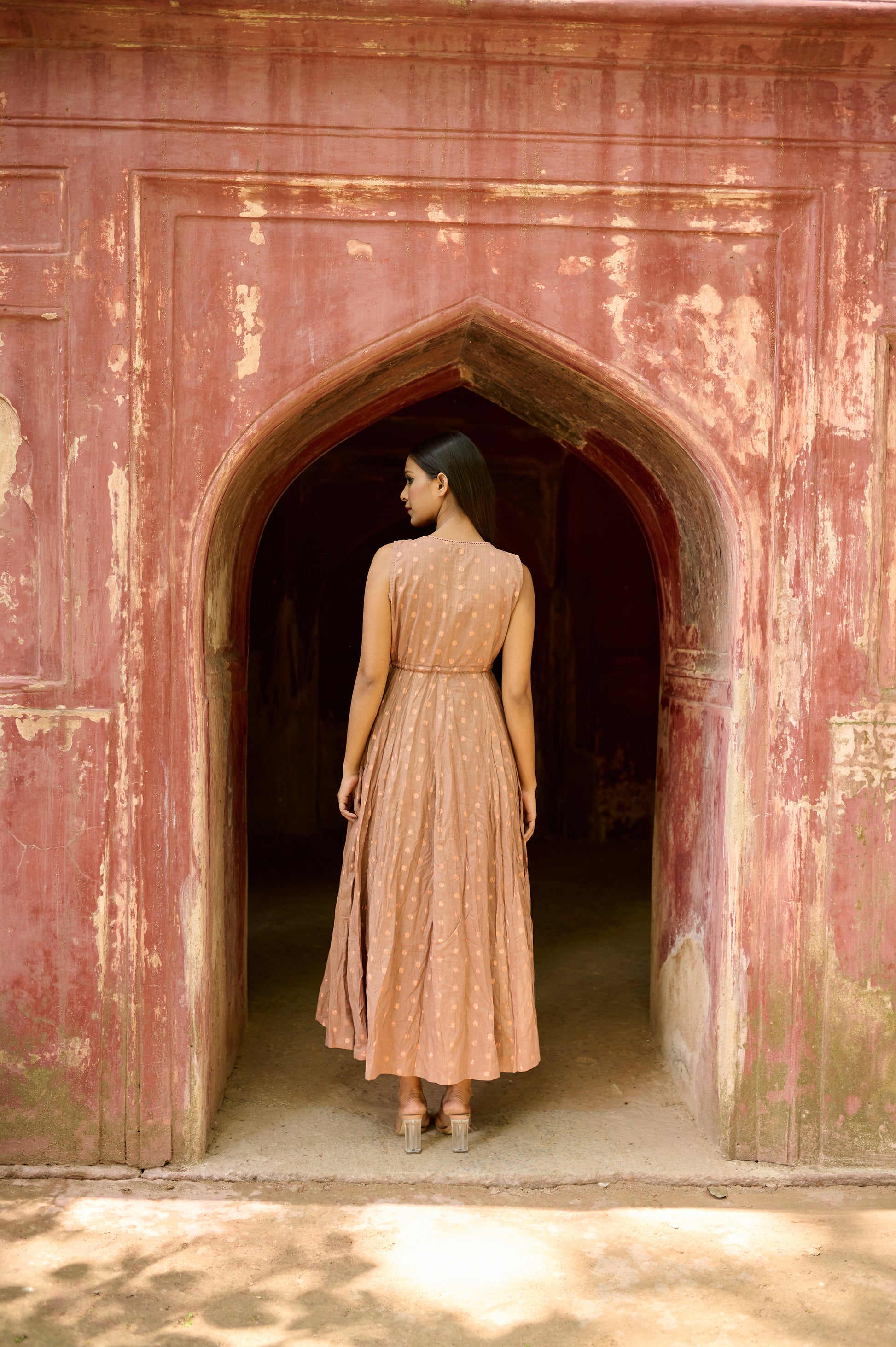 Brown Cotton Jacquard Flared Dress