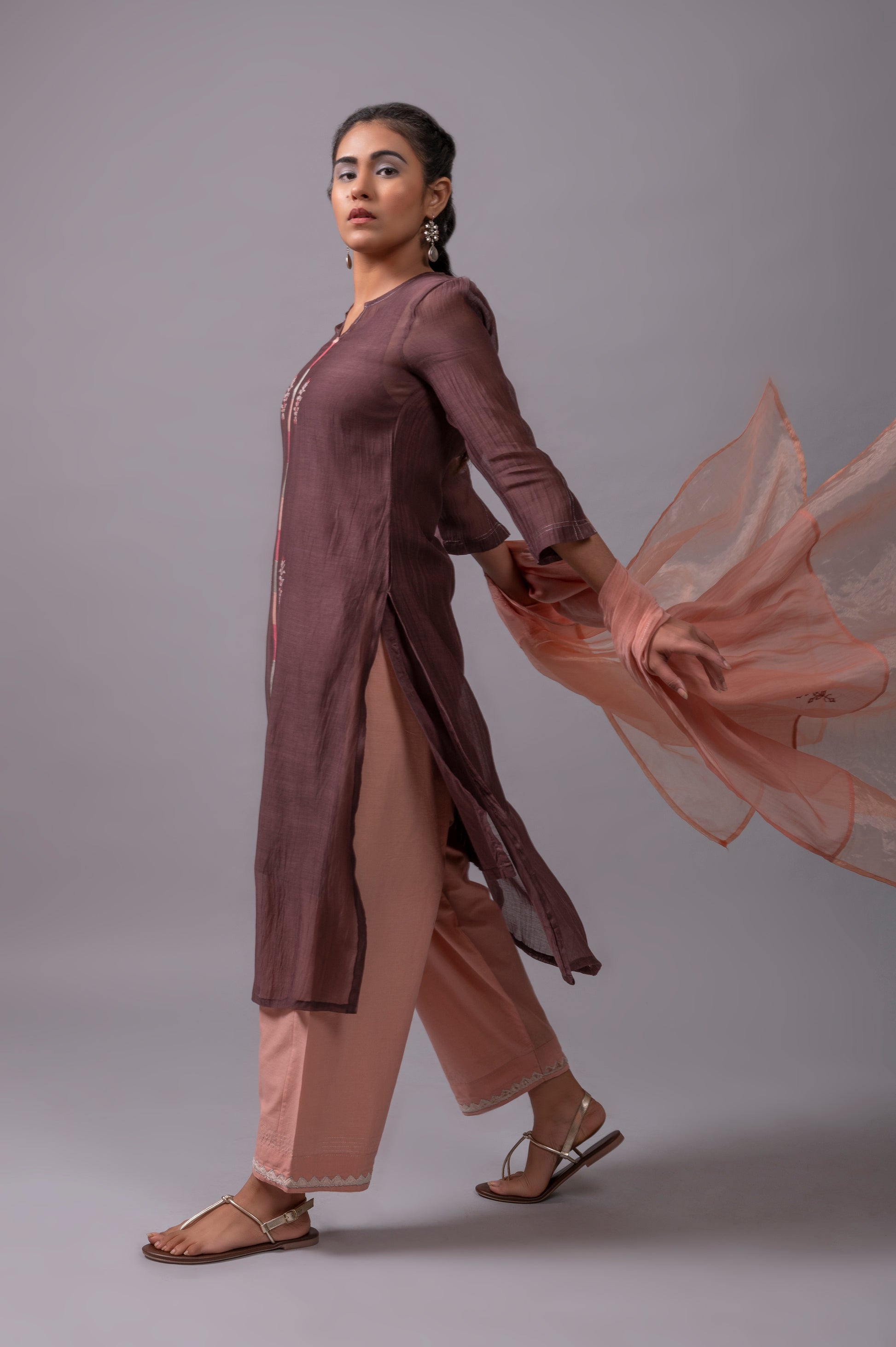 - STYLING TIP: You can style this Brown fine chanderi kurta from Label Yati by pairing it with contrast or a matching bottom and a dupatta and team it with a pair of oxidized chandbalis and silver slip-ons. Go for a dewy makeup and with a simple braided hairstyle.