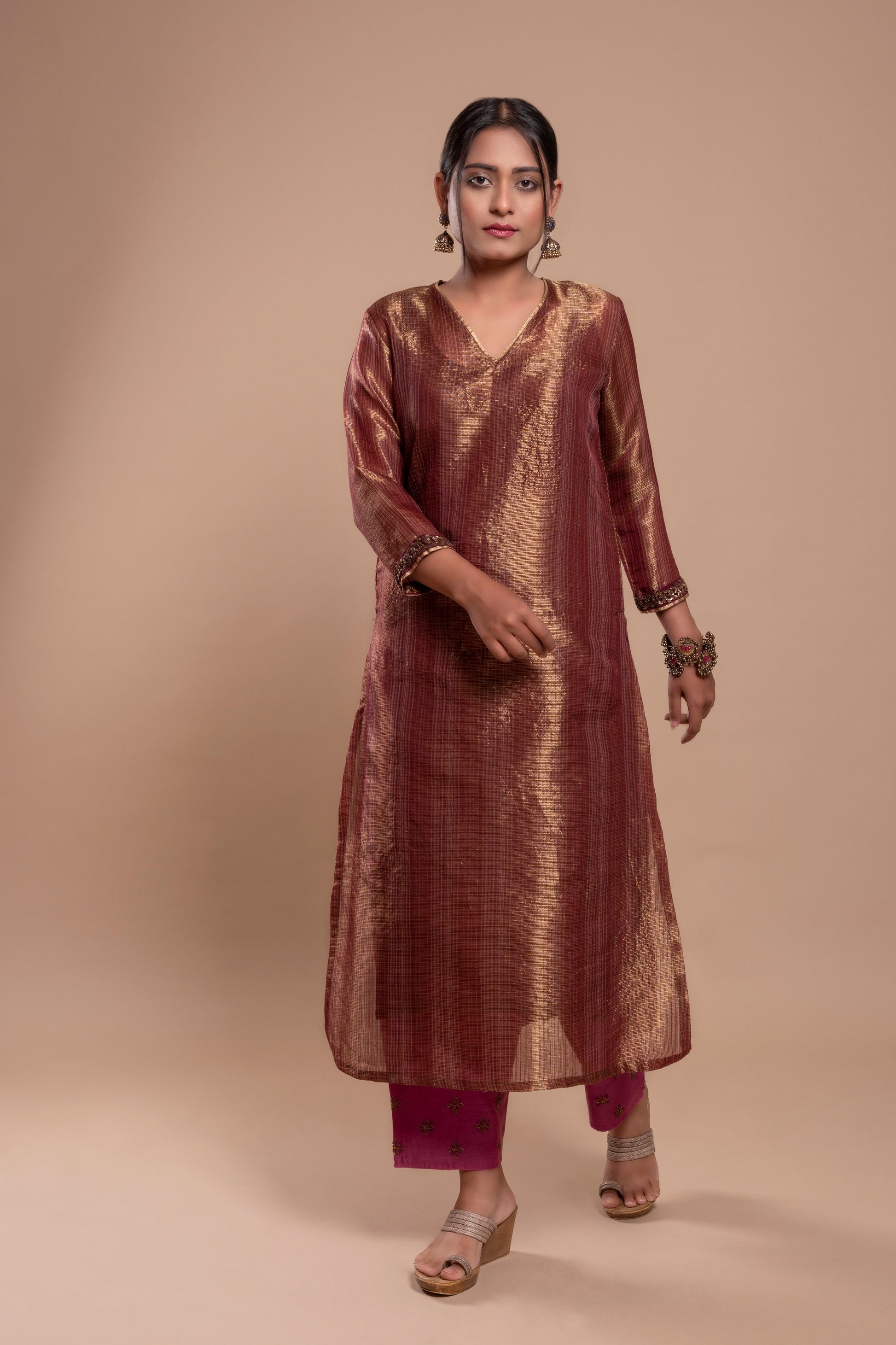 A-line kota tissue kurta with zardozi embroidery on the sleeves along with mulmul slip.