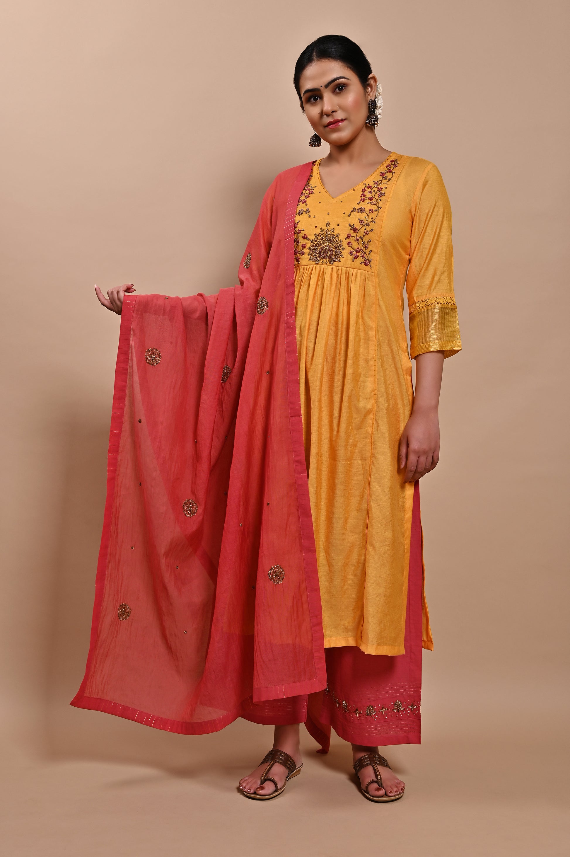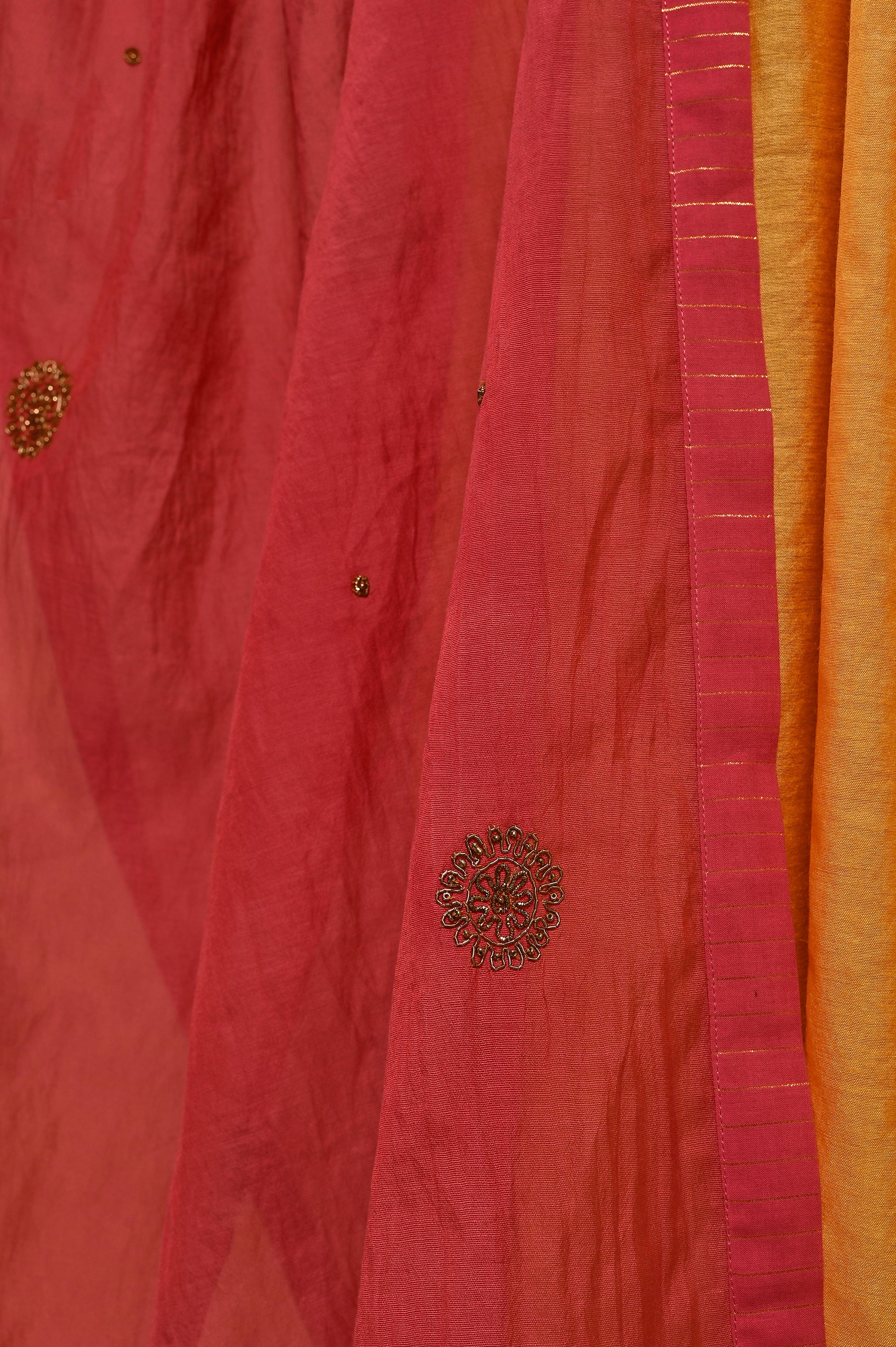 - STYLING TIP: You can style this Carrot Pink Silk Chanderi Zardozi Dupatta from Label Yati by pairing them with a matching suit set and accessorising them with a pair of necklace, jhumkas, and embroidered mojaris.