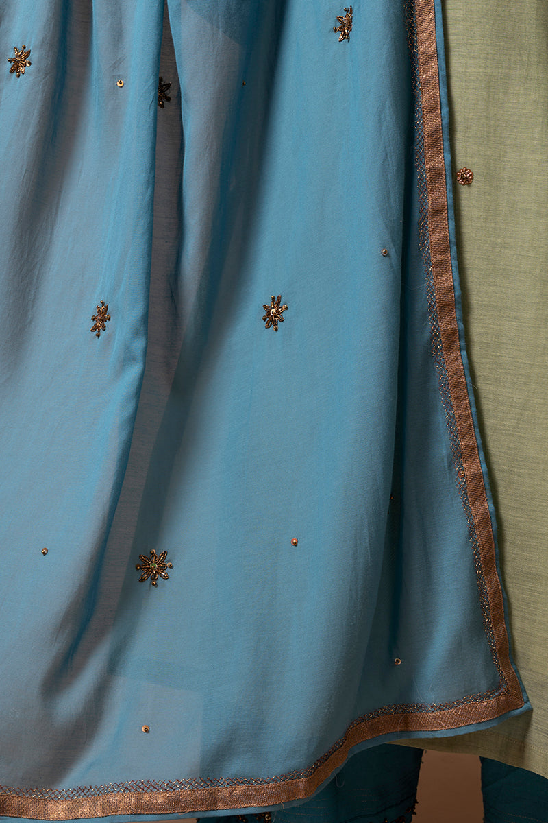 Cotton silk dupatta with zardozi embroidery and zari border.