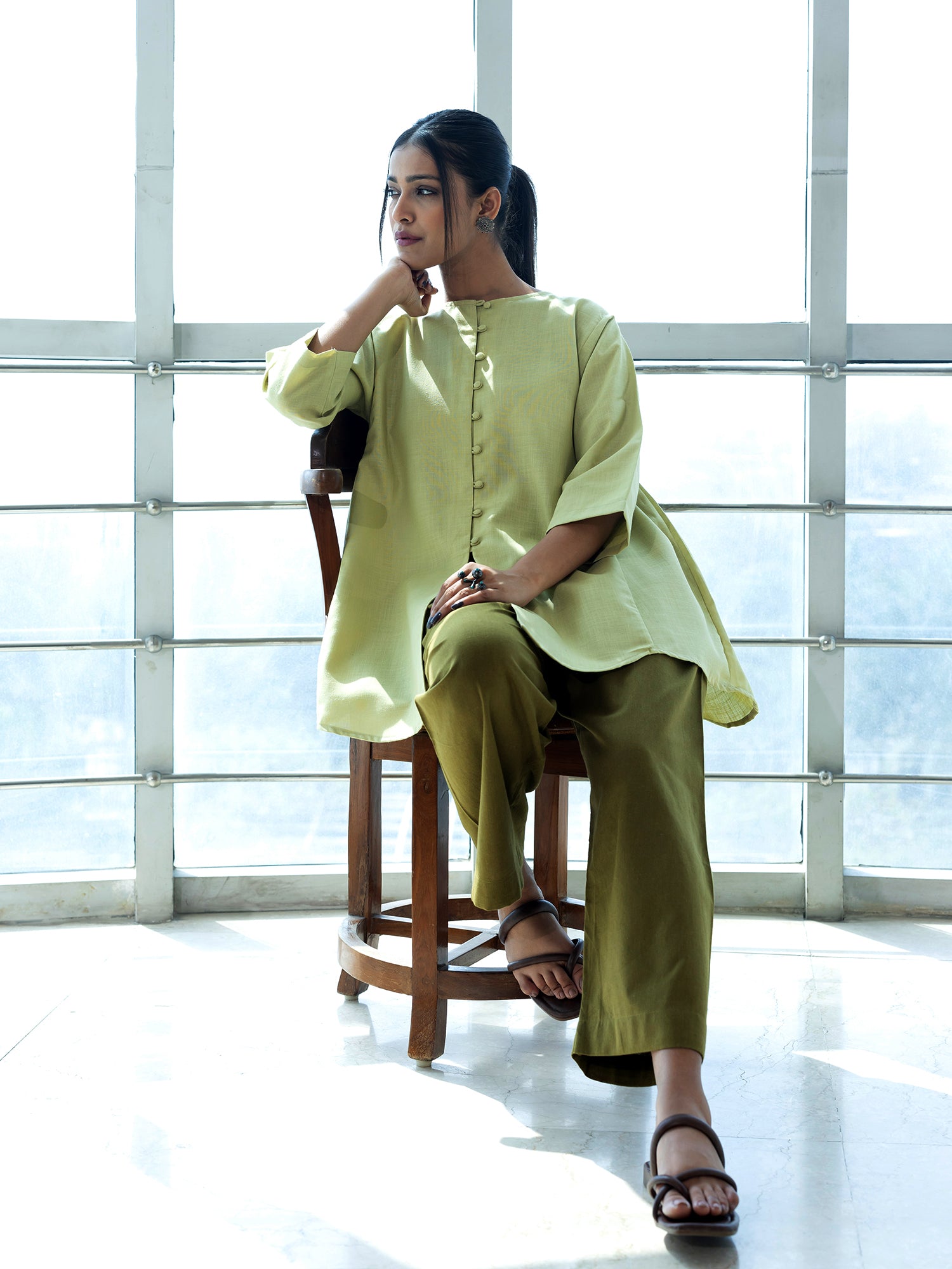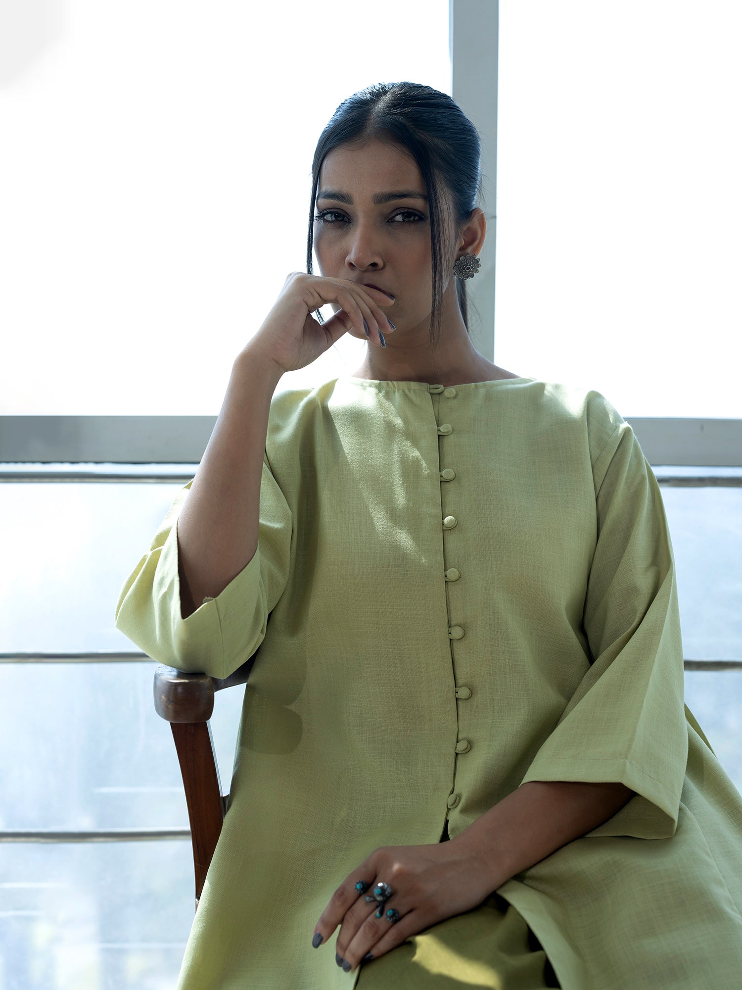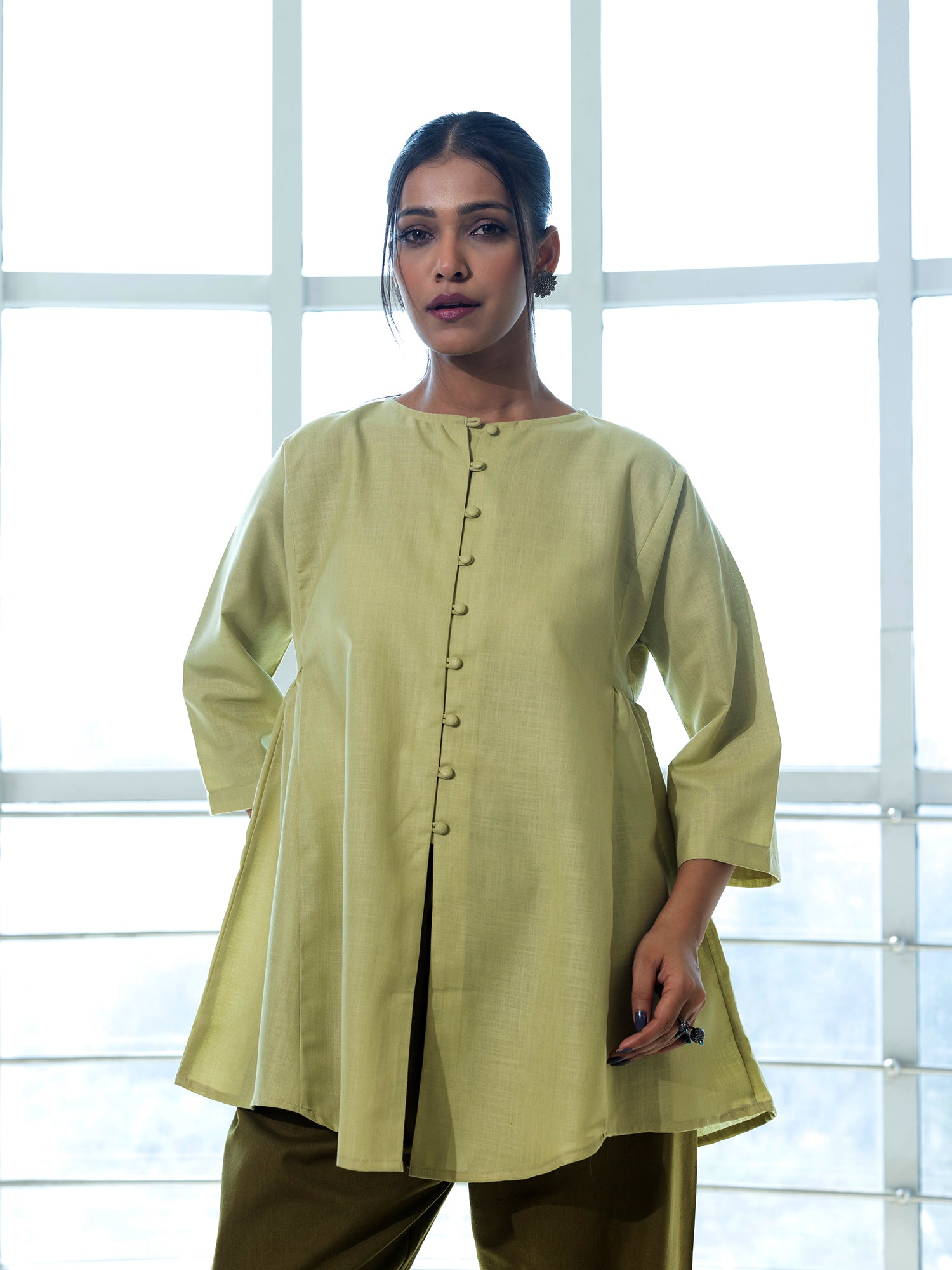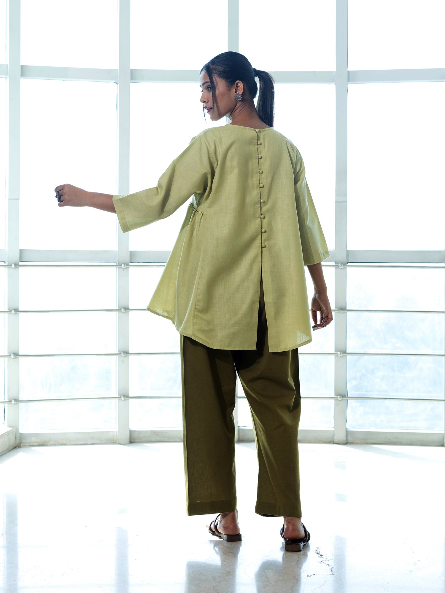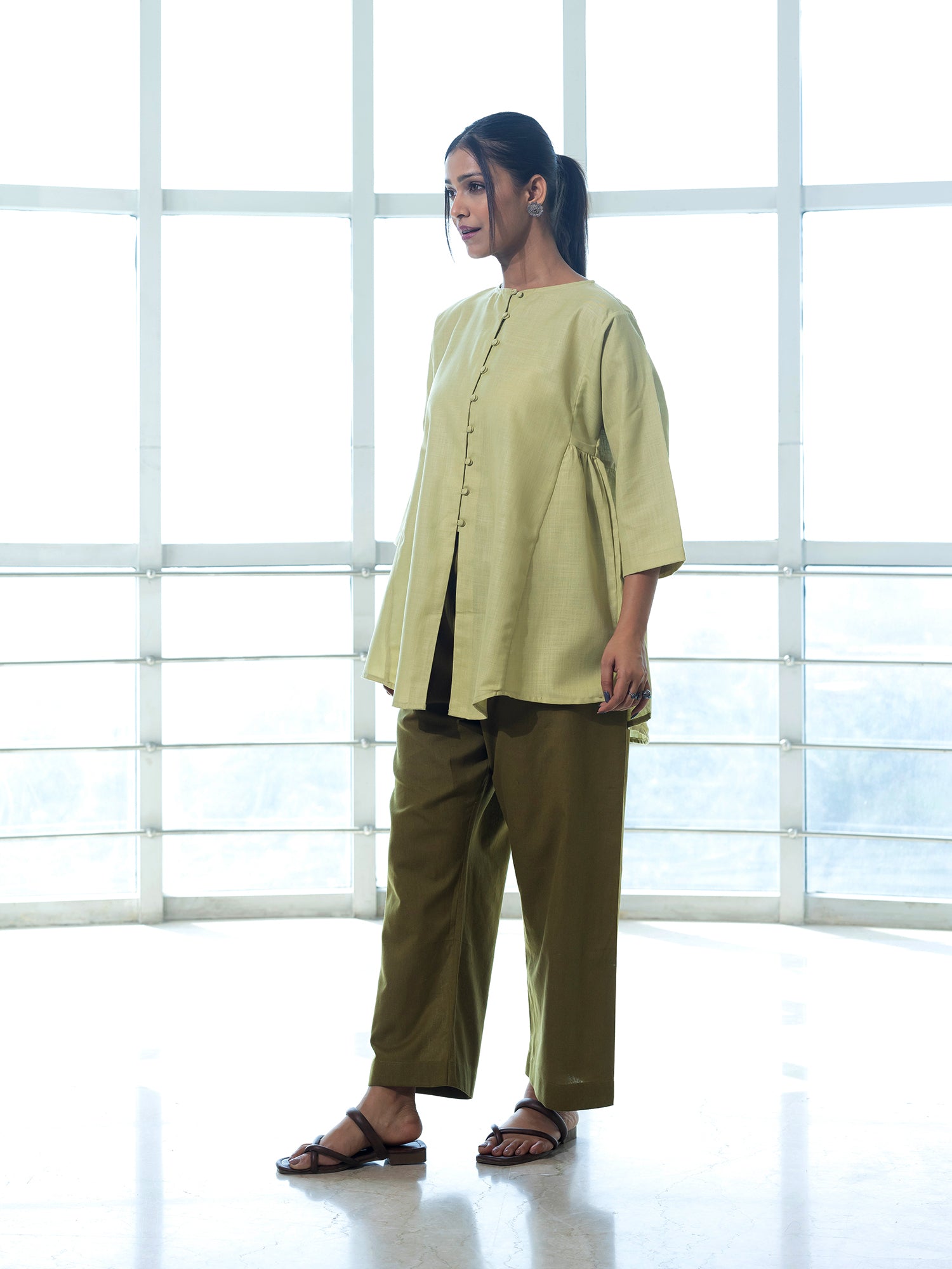 - DETAILS: Front and back with functional long placket with fabric button and side gathers.