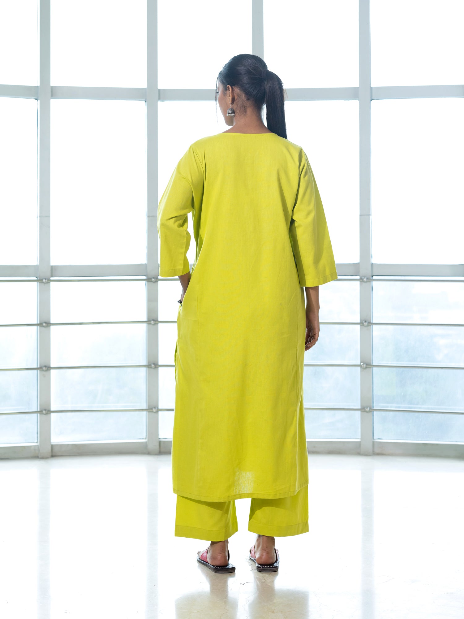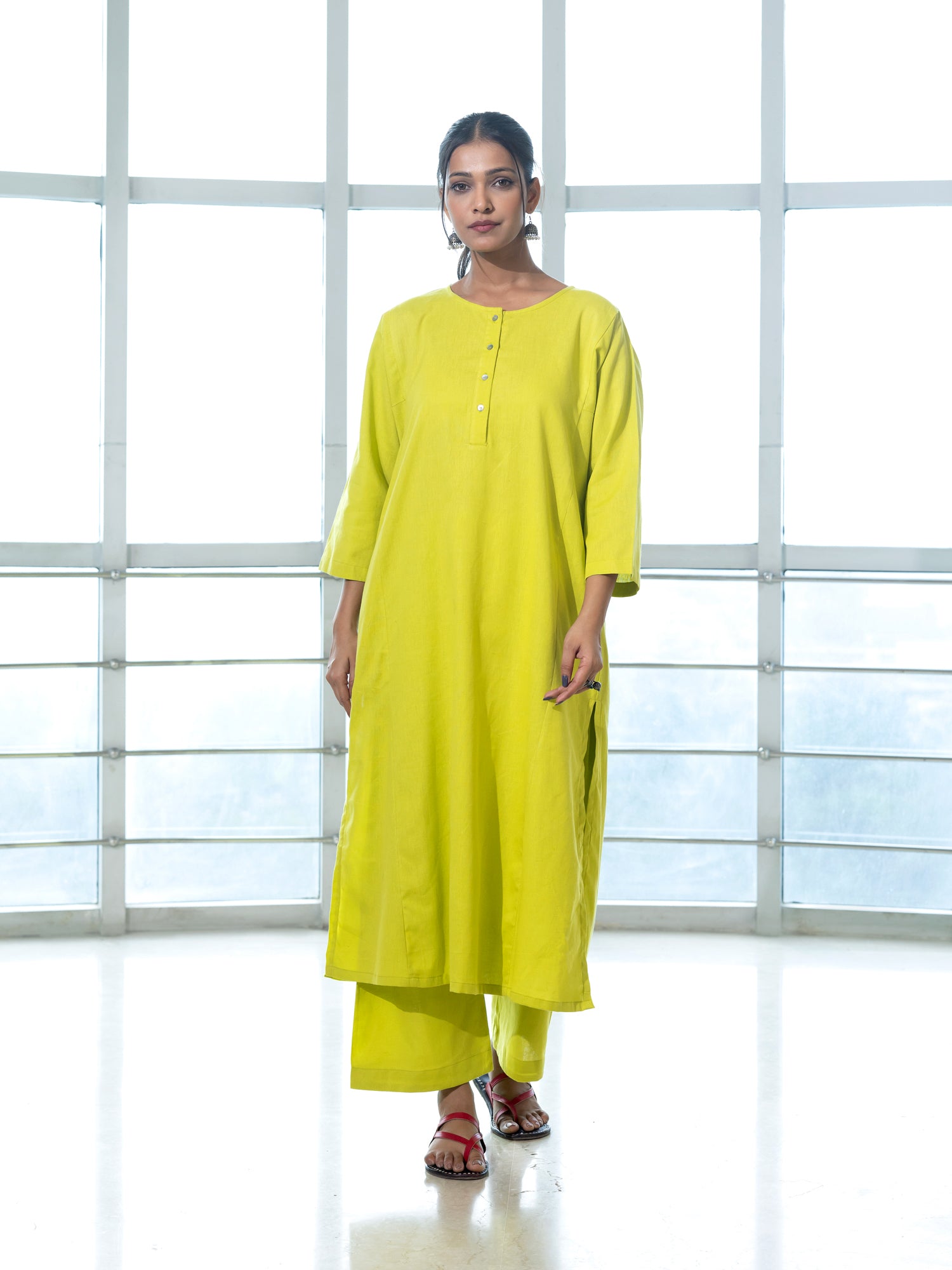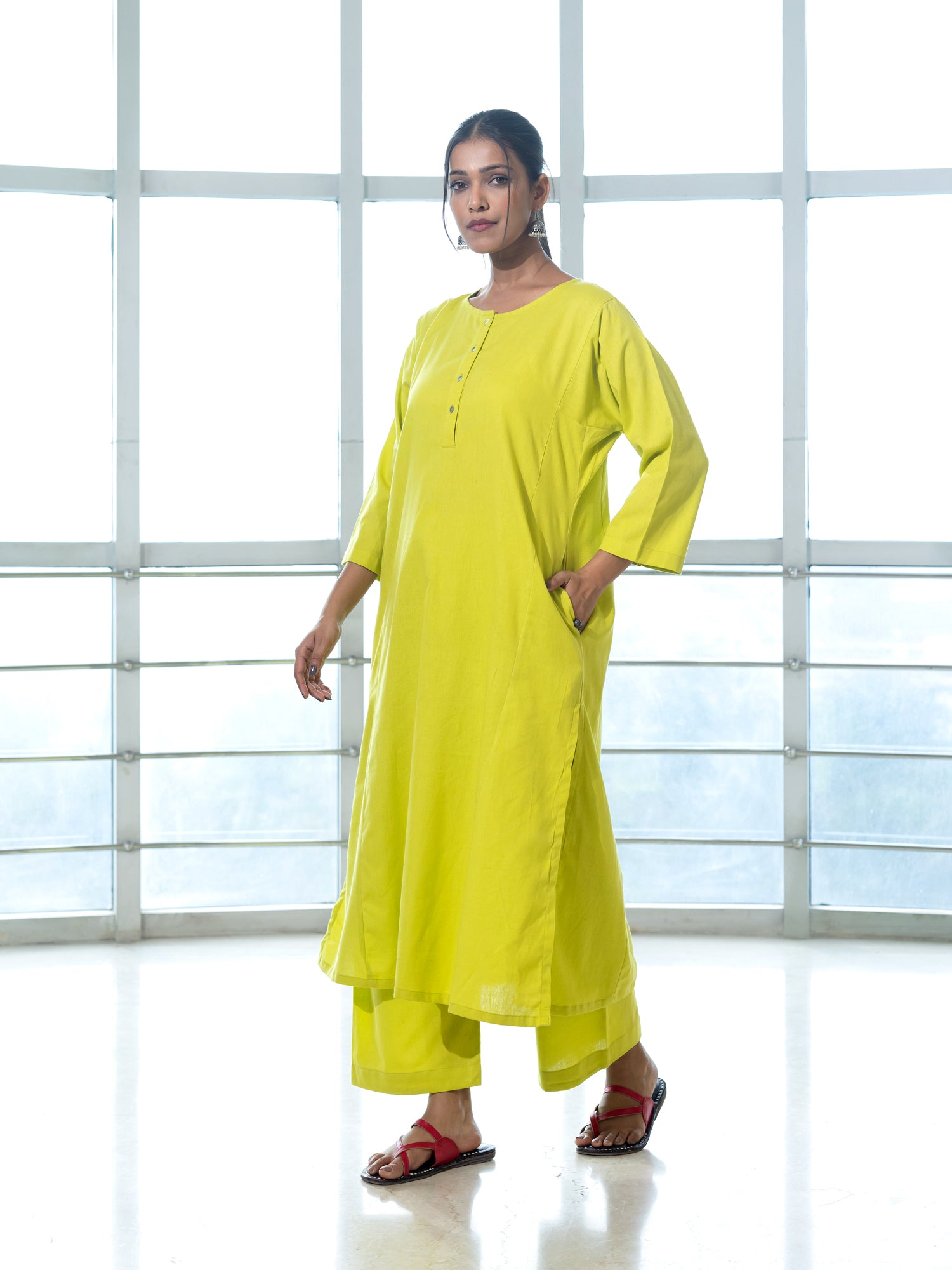 - DETAILS: Functional long placket with shell button, yoke with inverted pleat and side slits for easy mobility and pockets on both sides of the kurta.