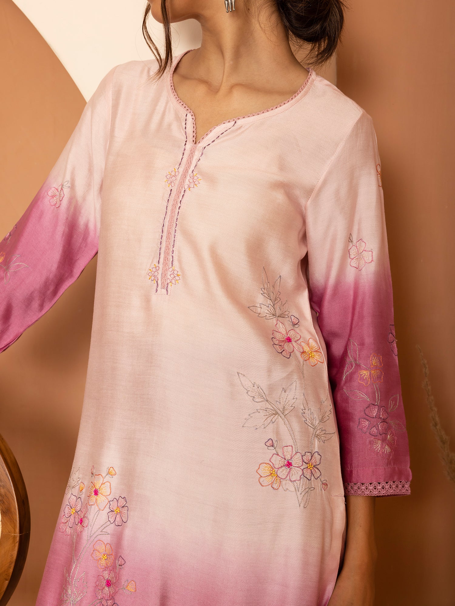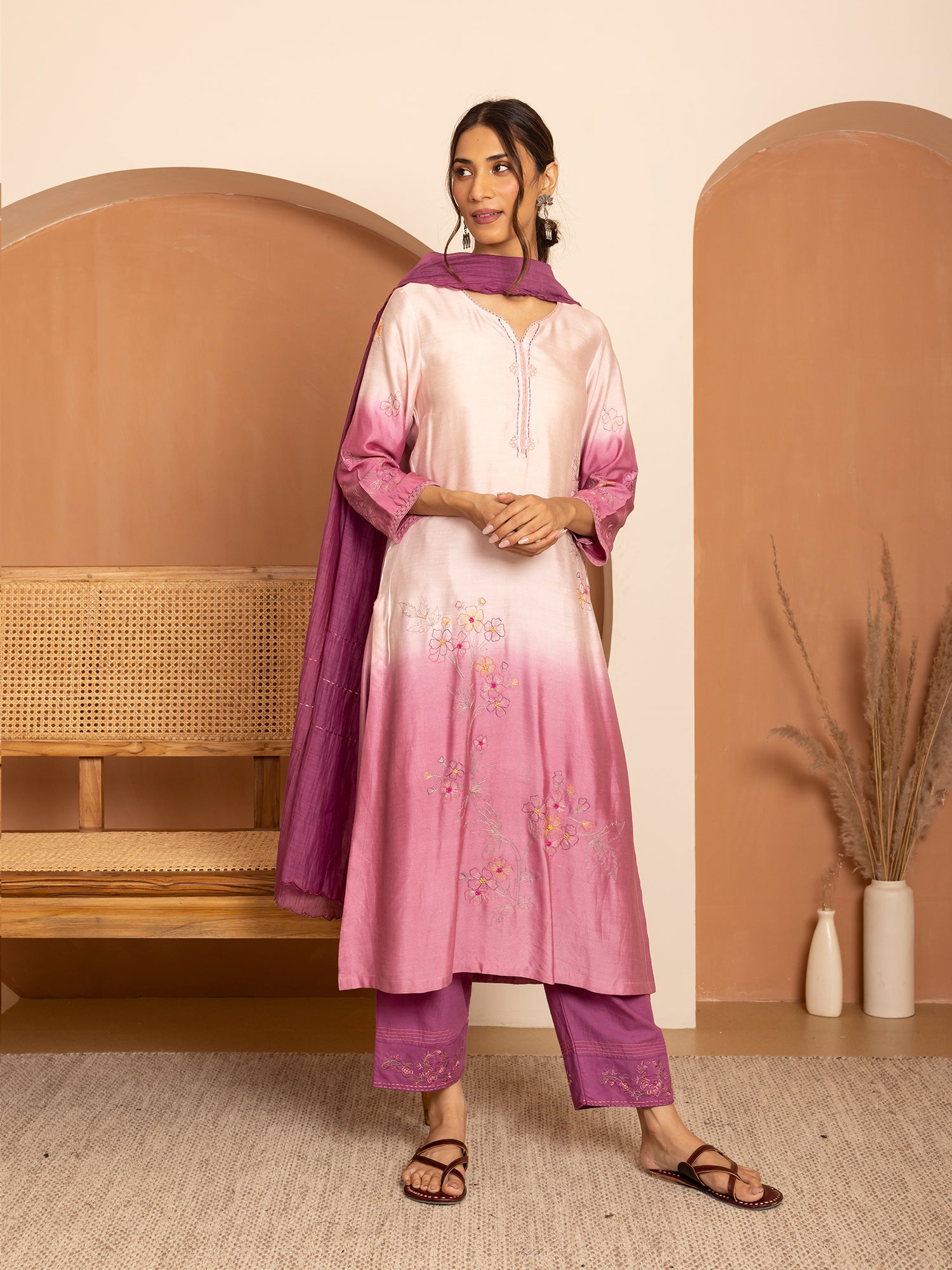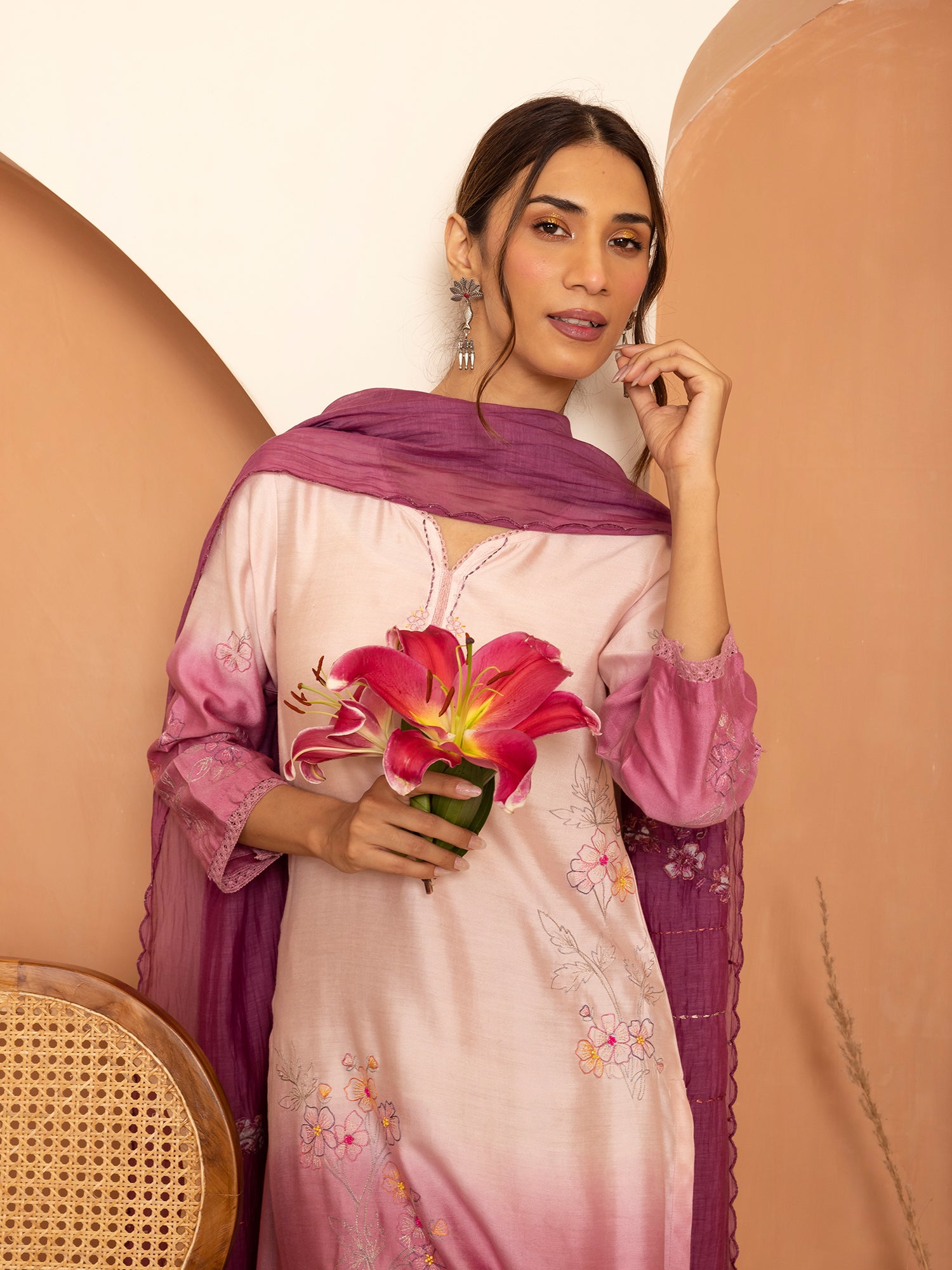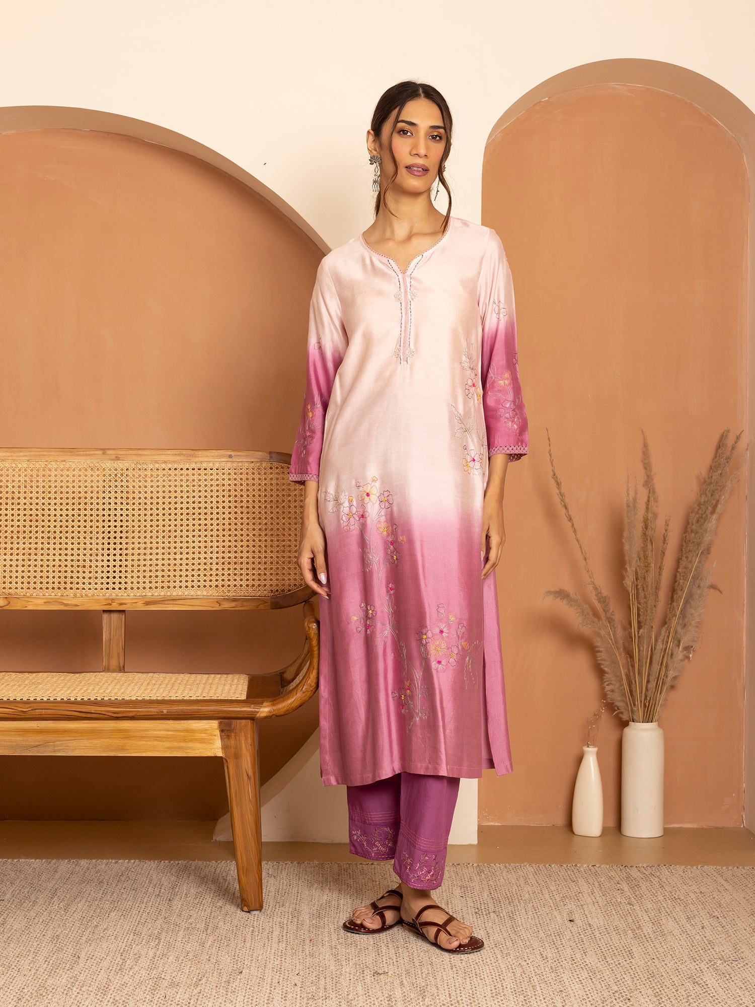 Light pink and purple ombrey bamboo silk with thread and bead embroidery kurta set