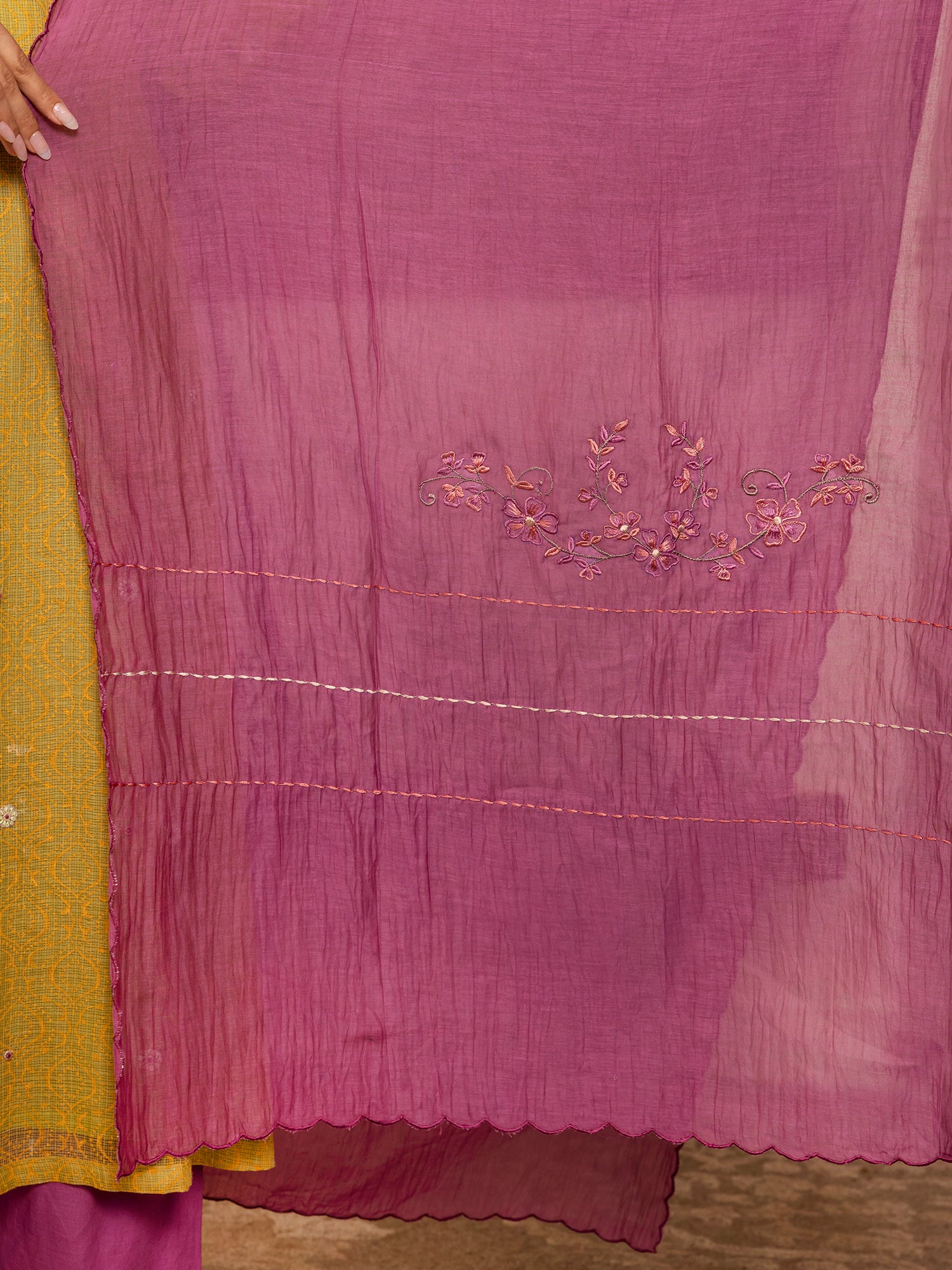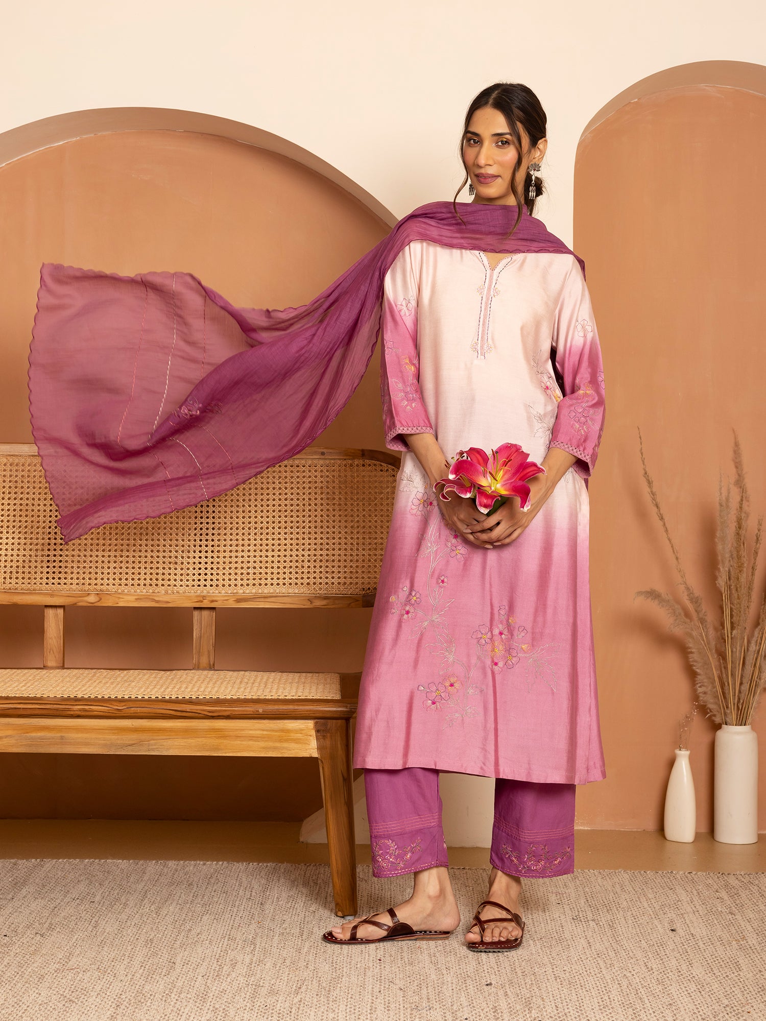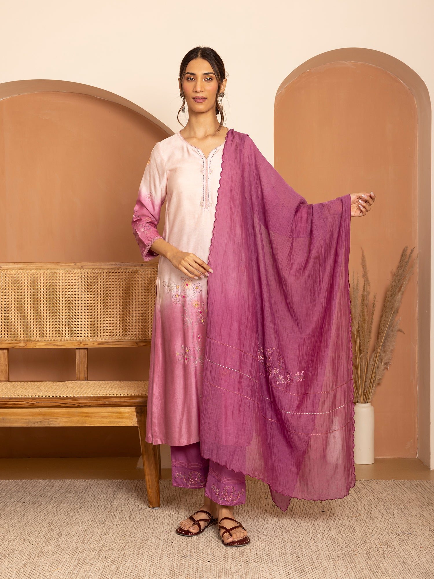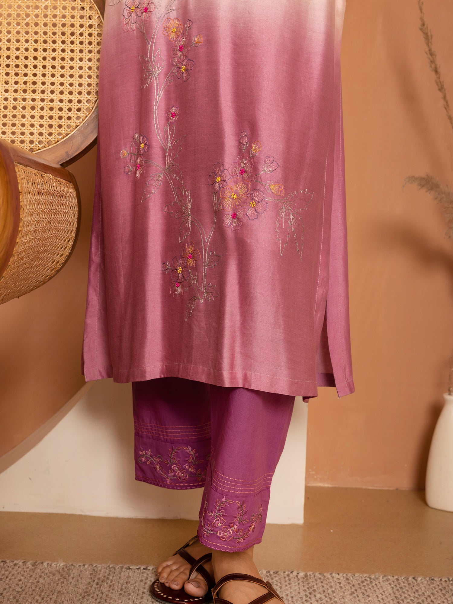 Light pink and purple ombrey bamboo silk with thread and bead embroidery kurta set