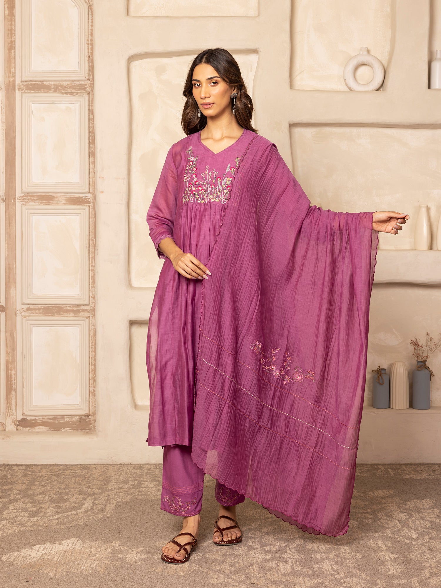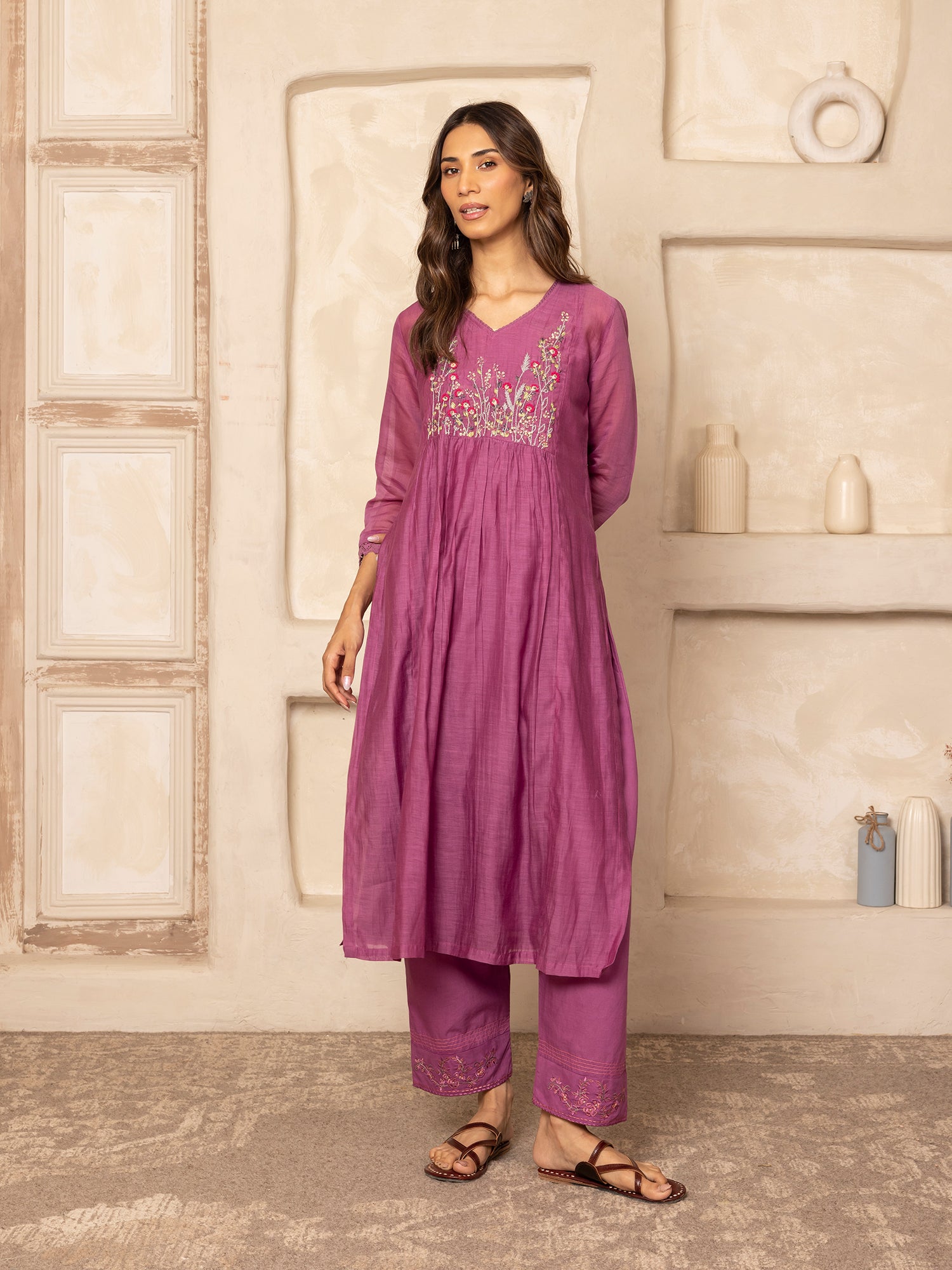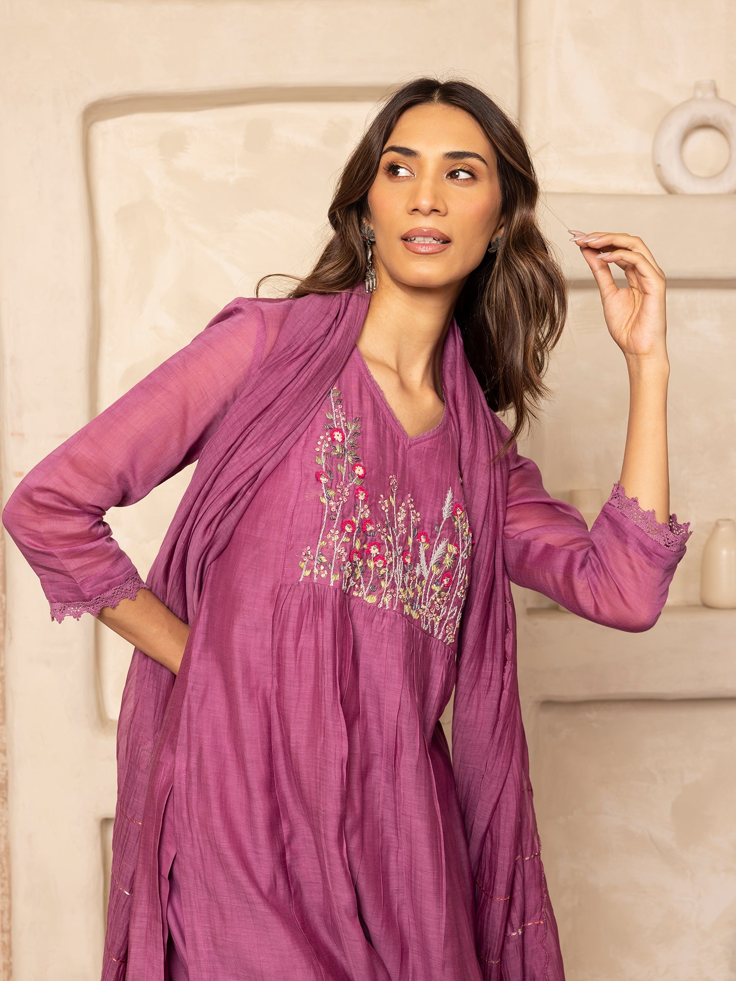 Purple mul chanderi thread with crochet hand embroidery kurta set