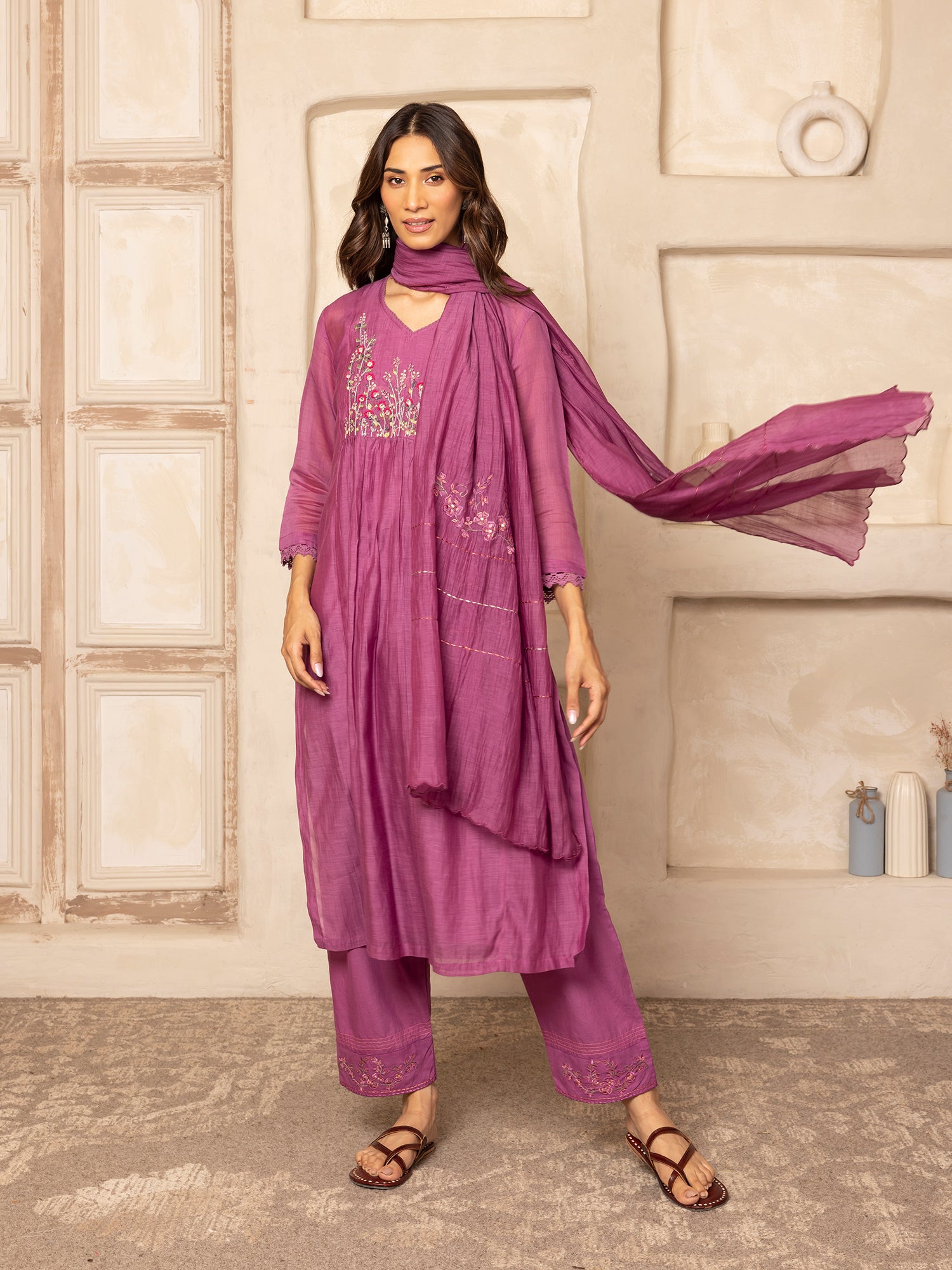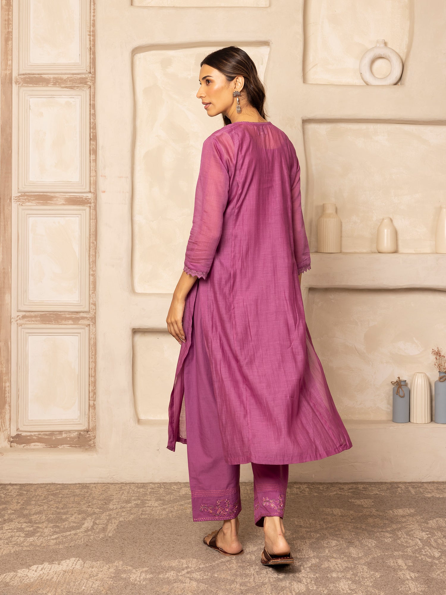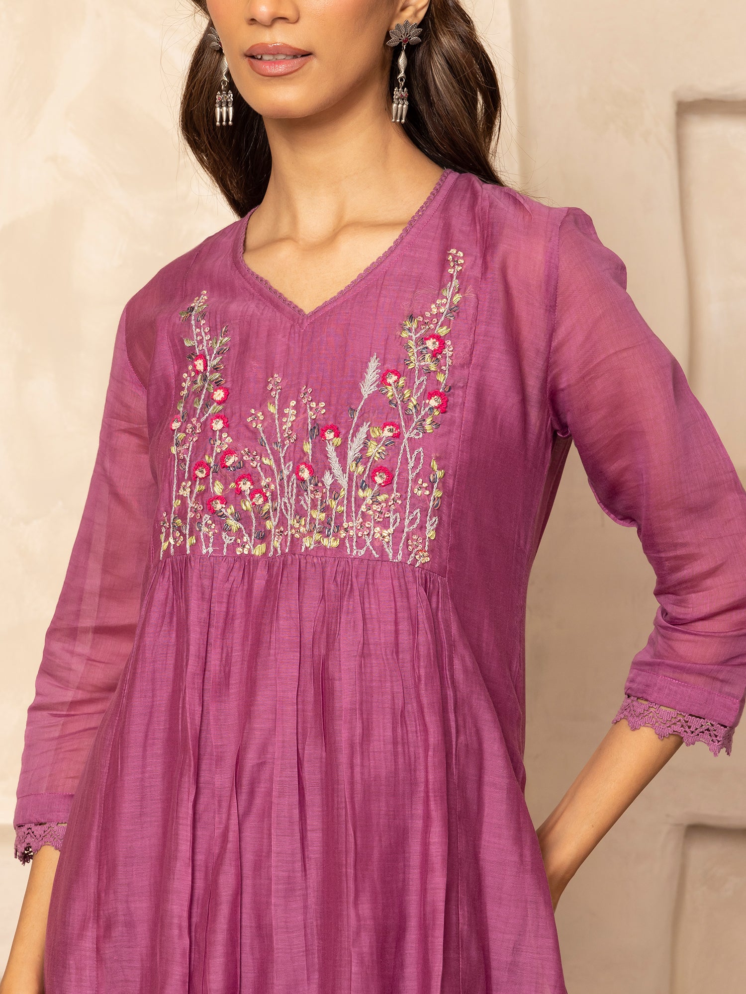 Purple mul chanderi thread with crochet hand embroidery kurta set