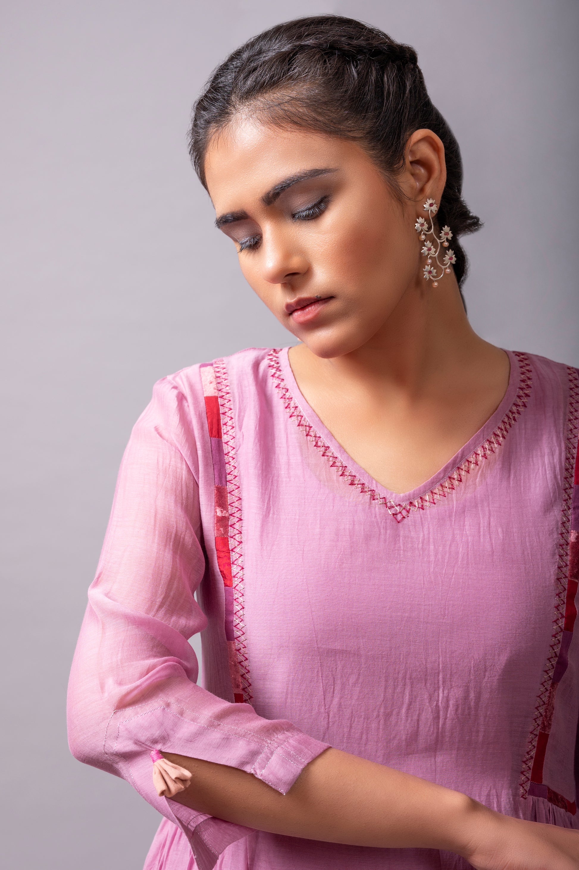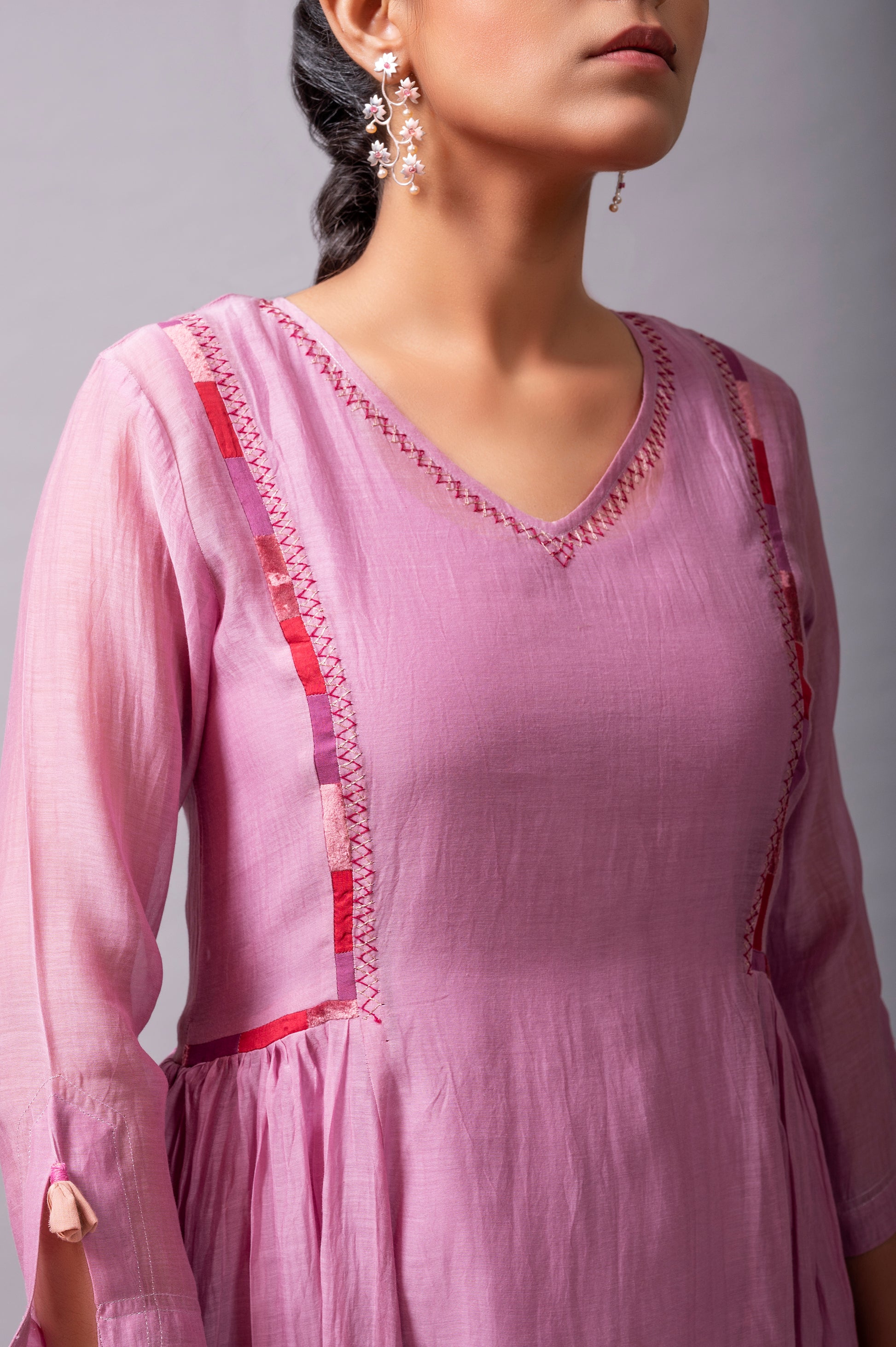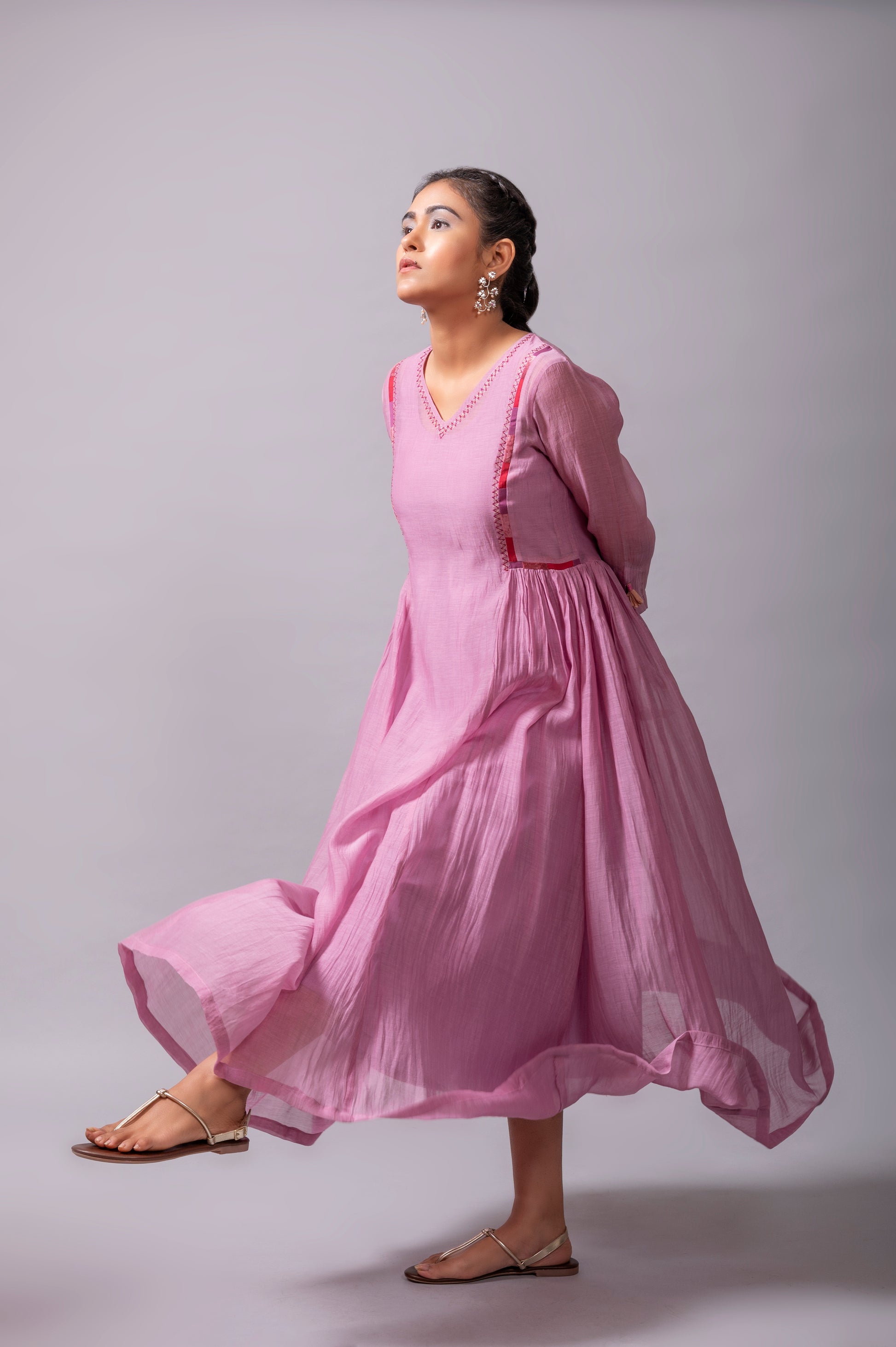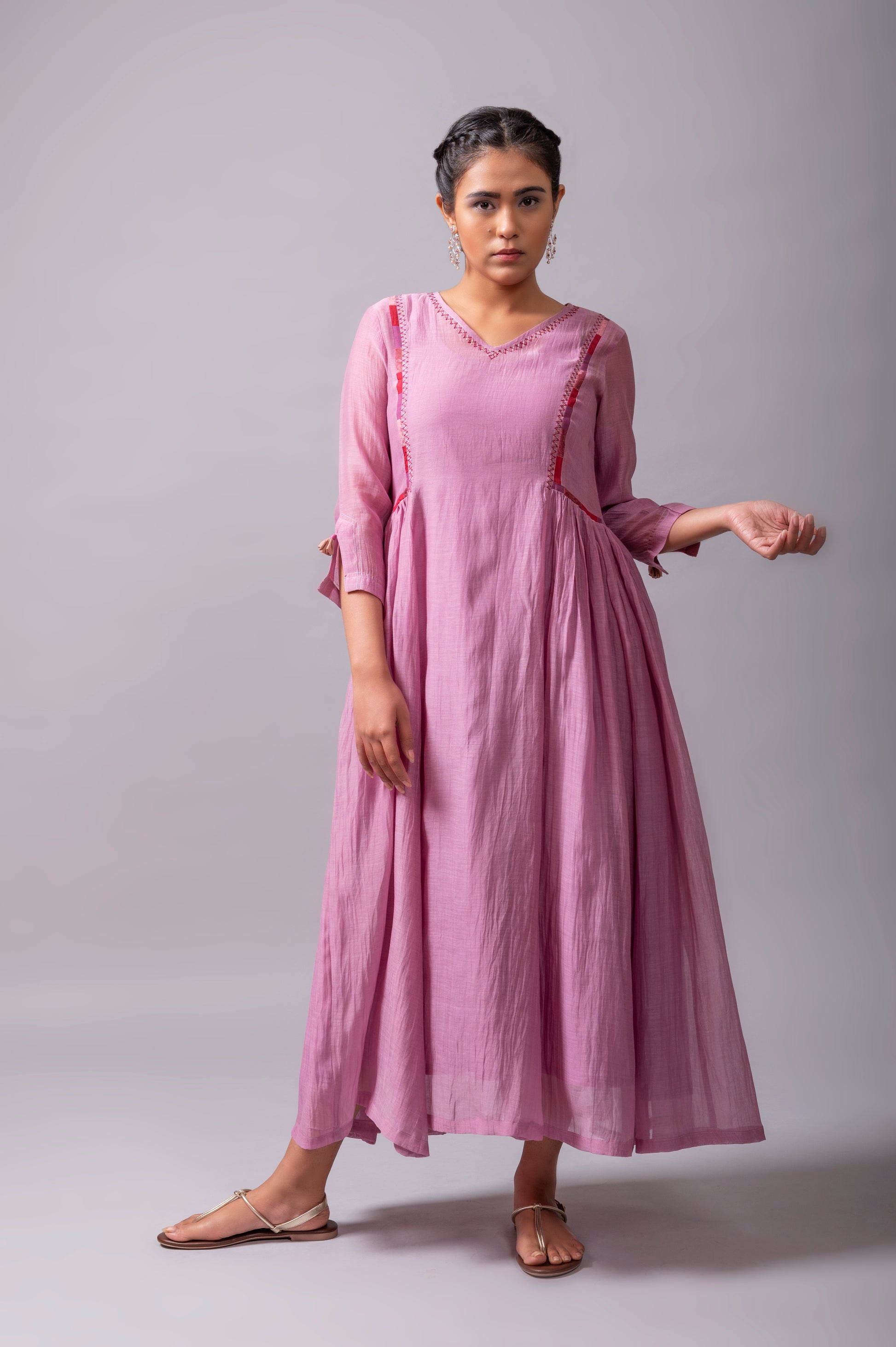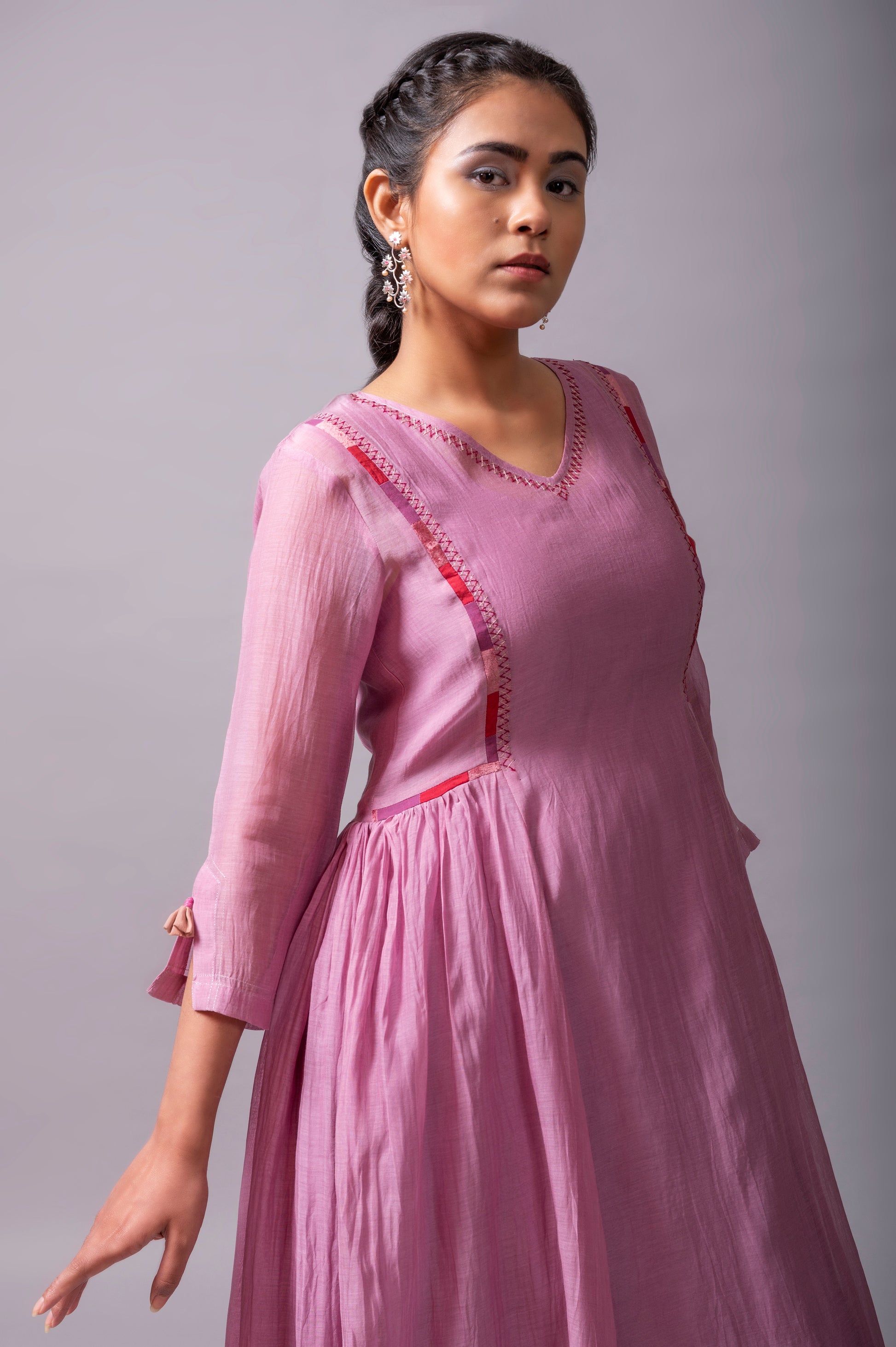 - STYLING TIP: You can style this Mauve fine chanderi flared dress from Label Yati with contrast or a matching floral signature earring, bracelet, and silver slip-ons.