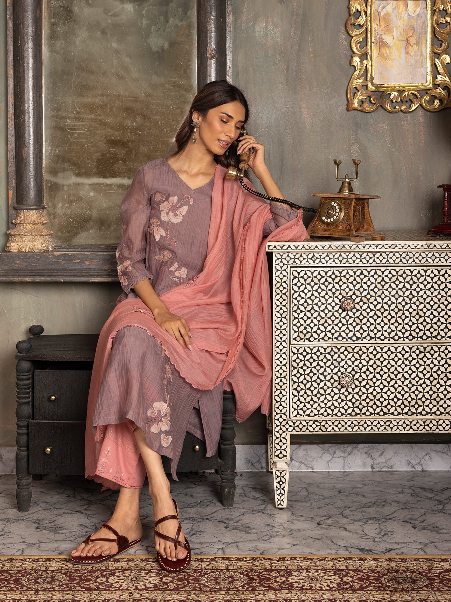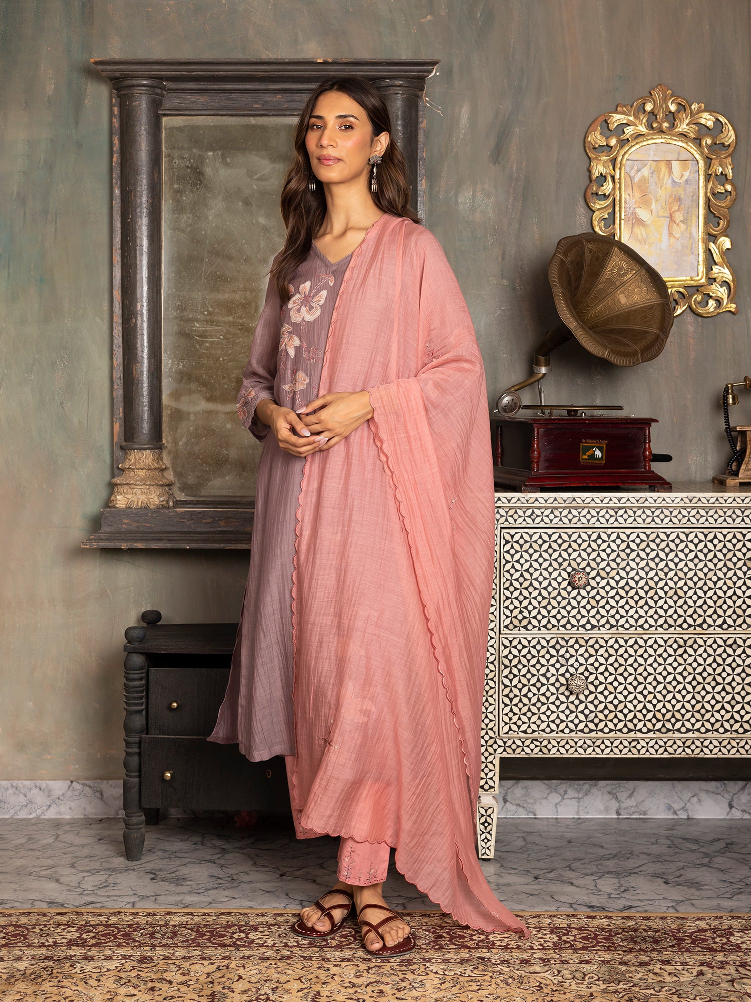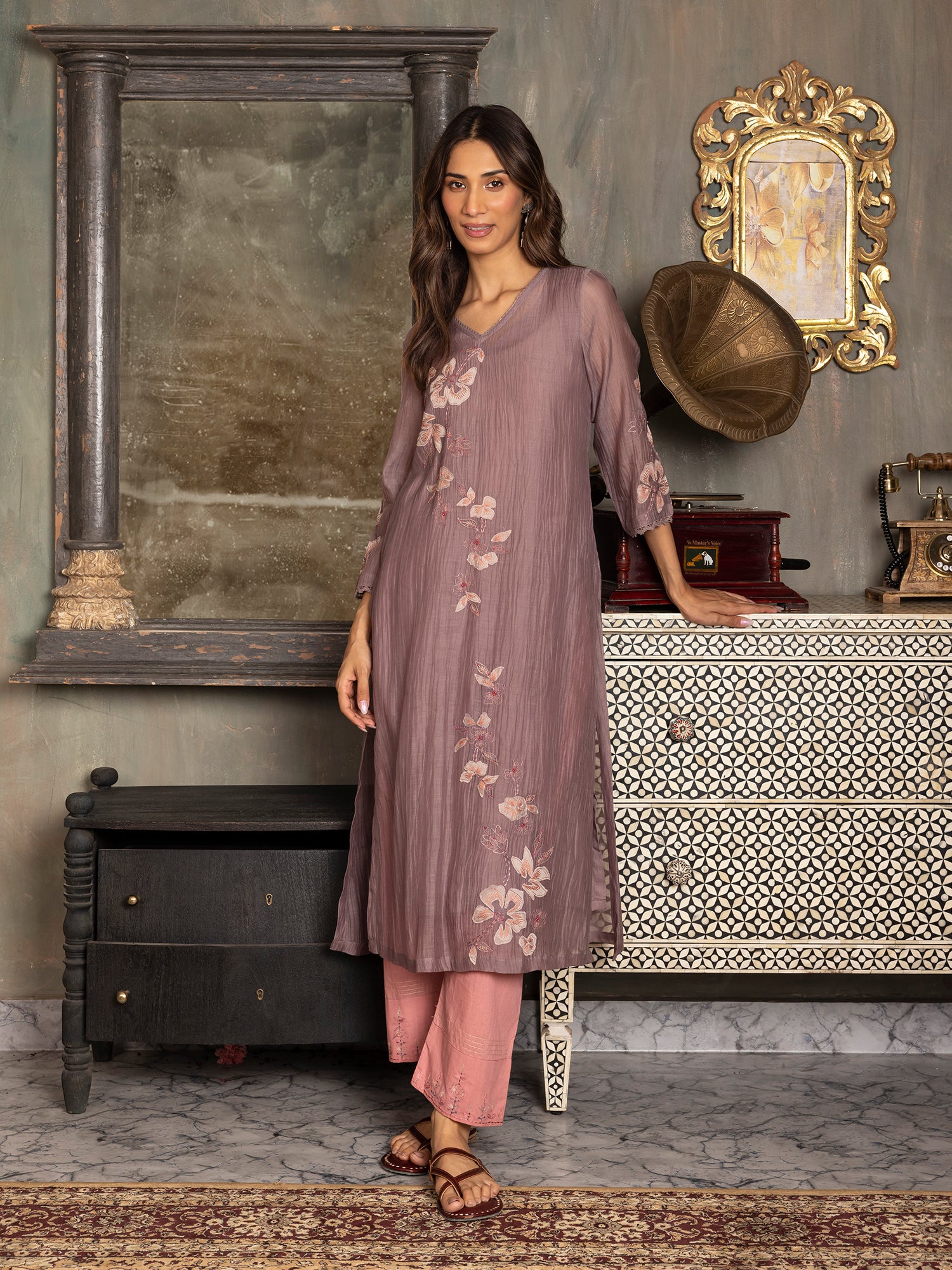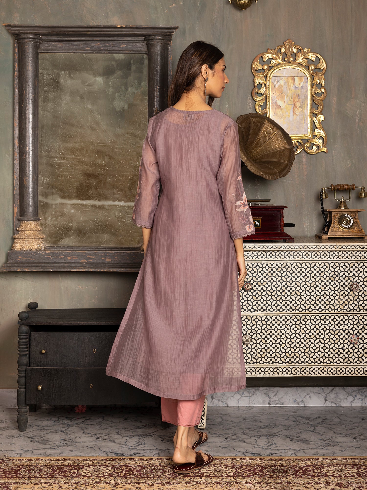 Mauve mul chanderi thread and fabric cutwork kurta set