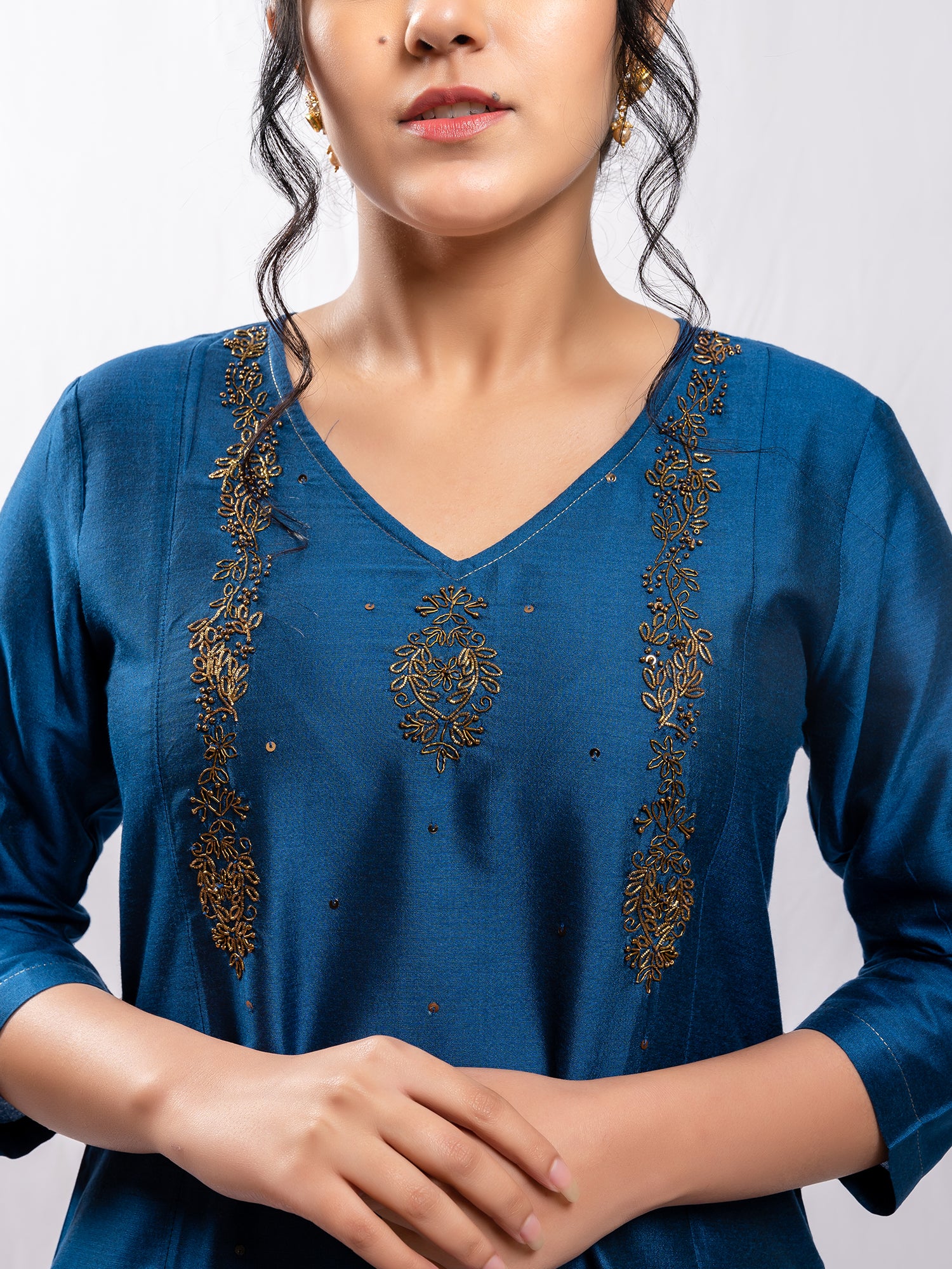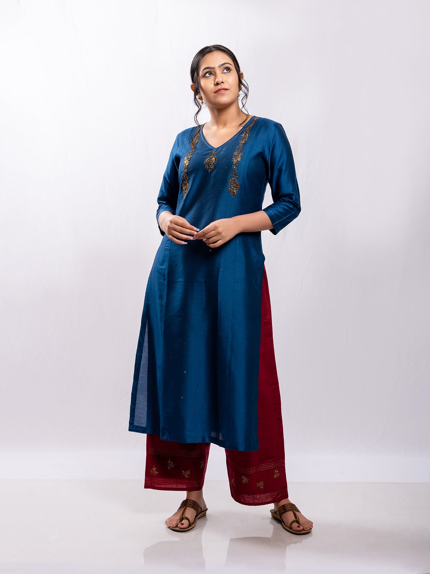 - DETAILS: Dabka, nakshi with beads and sequence aari work on collar and all over at the front, side slits for easy mobility.