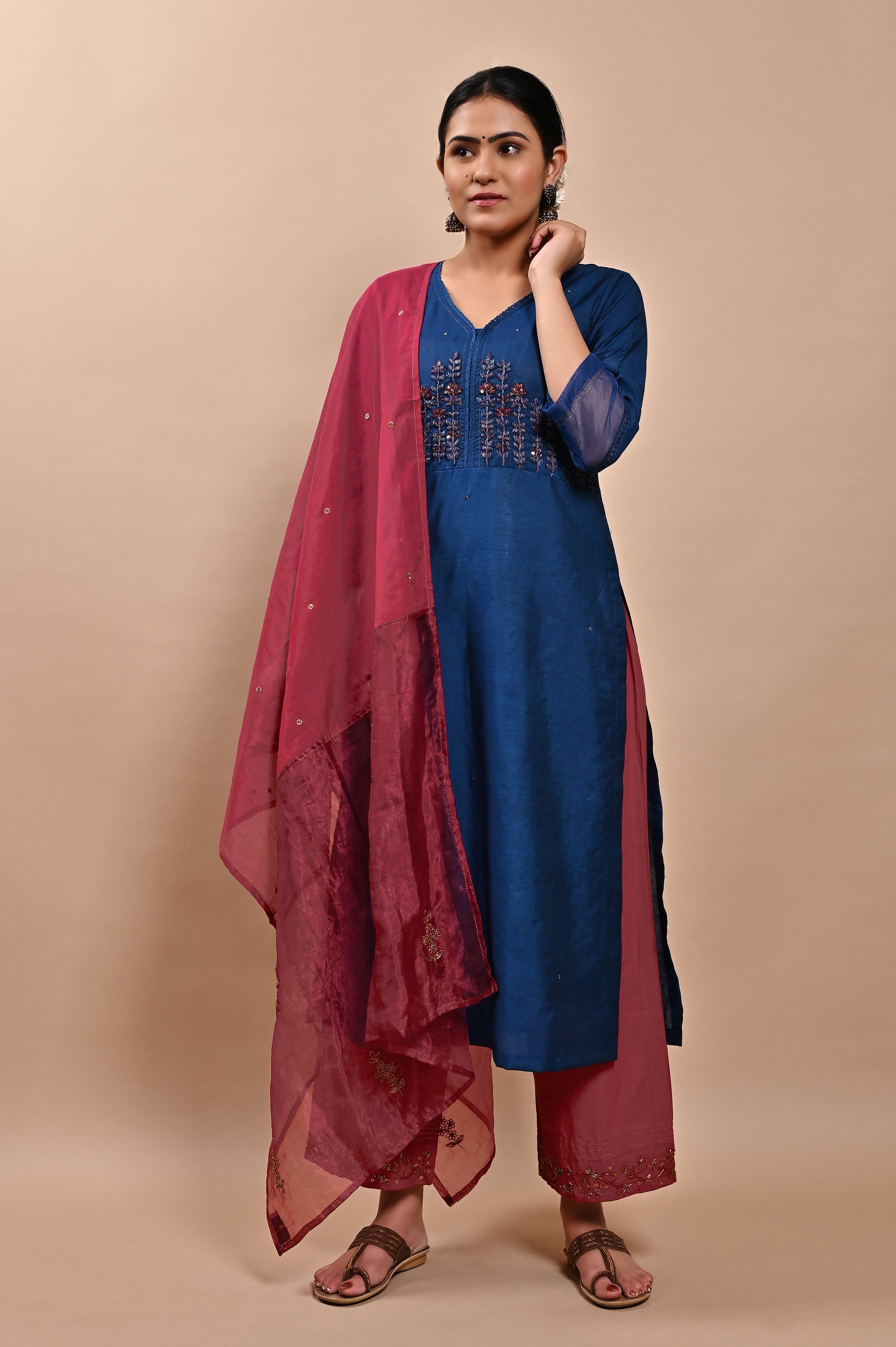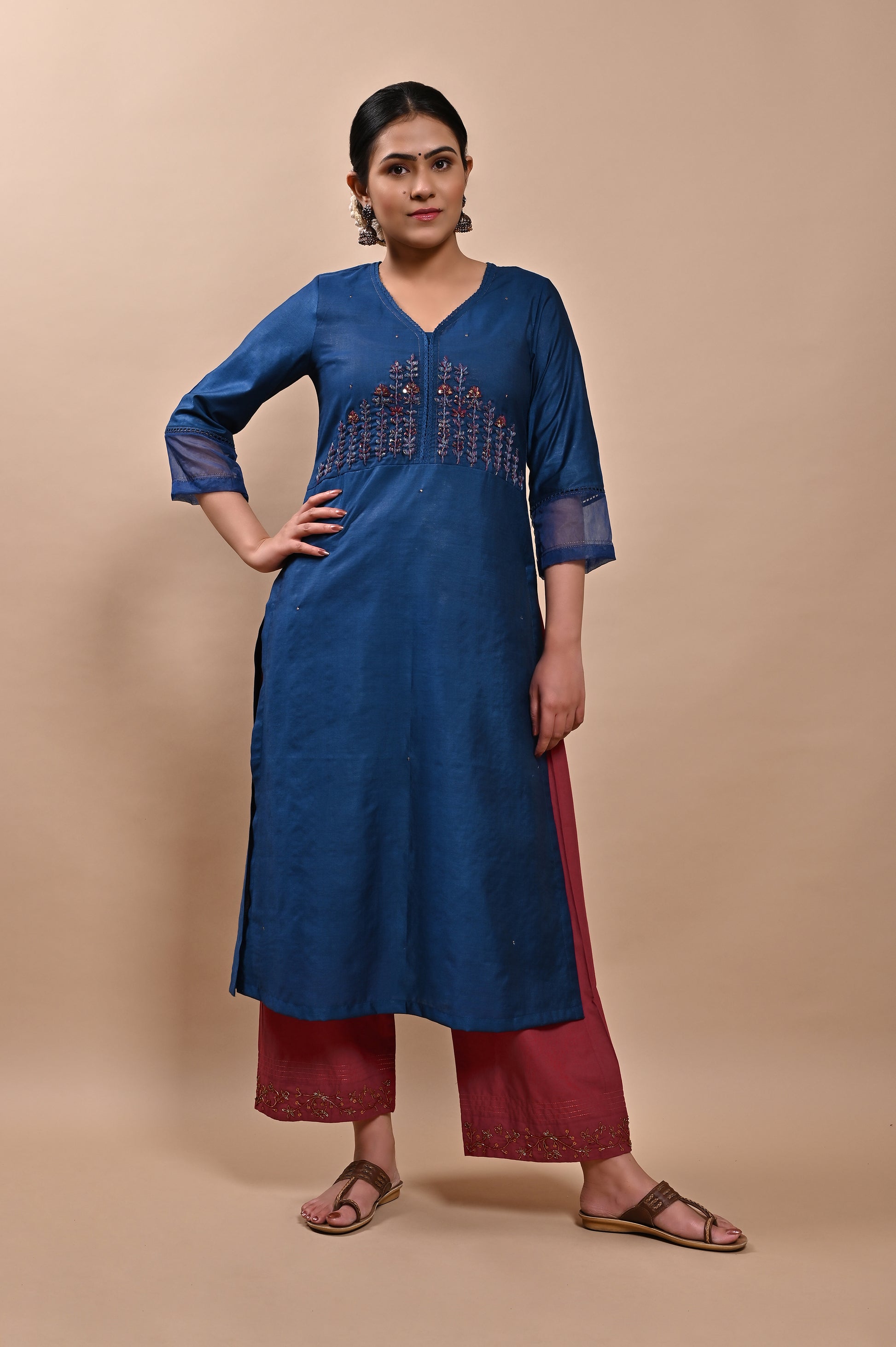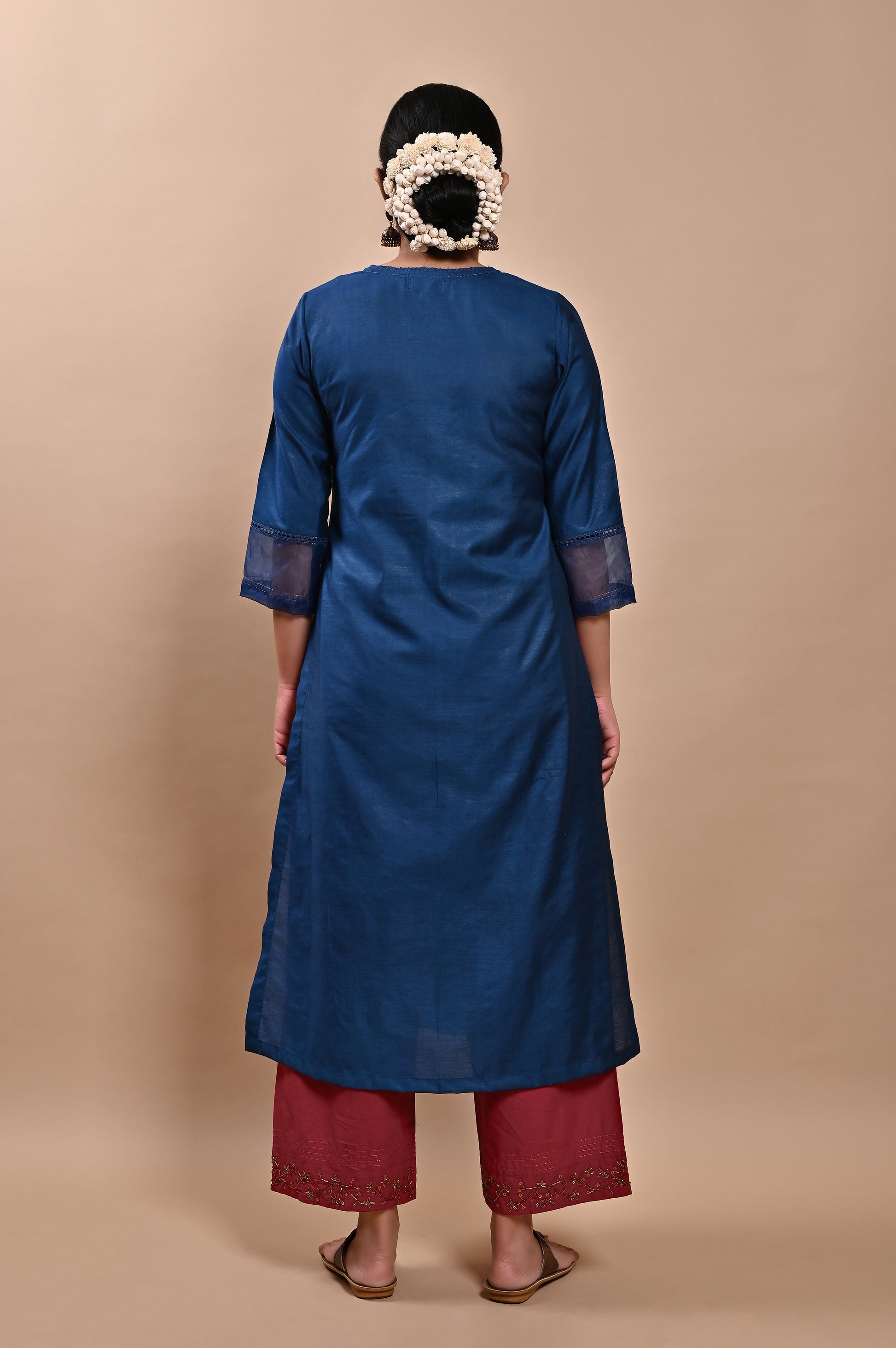 - STYLING TIP: Style this Navy Blue Handloom Silk Kurta Set from Label Yati with a pair of oxidized earrings, gajra, and embroidered slip-ons.