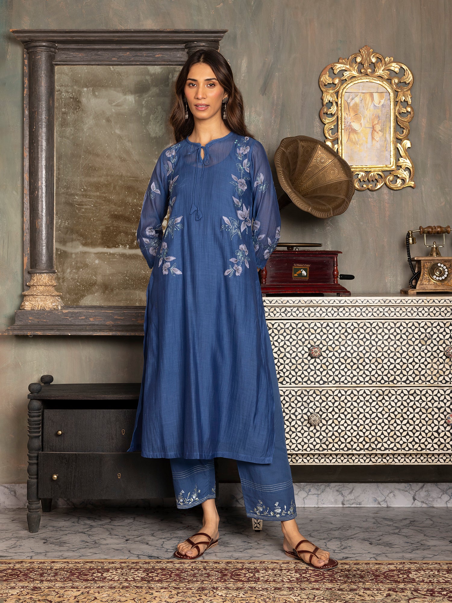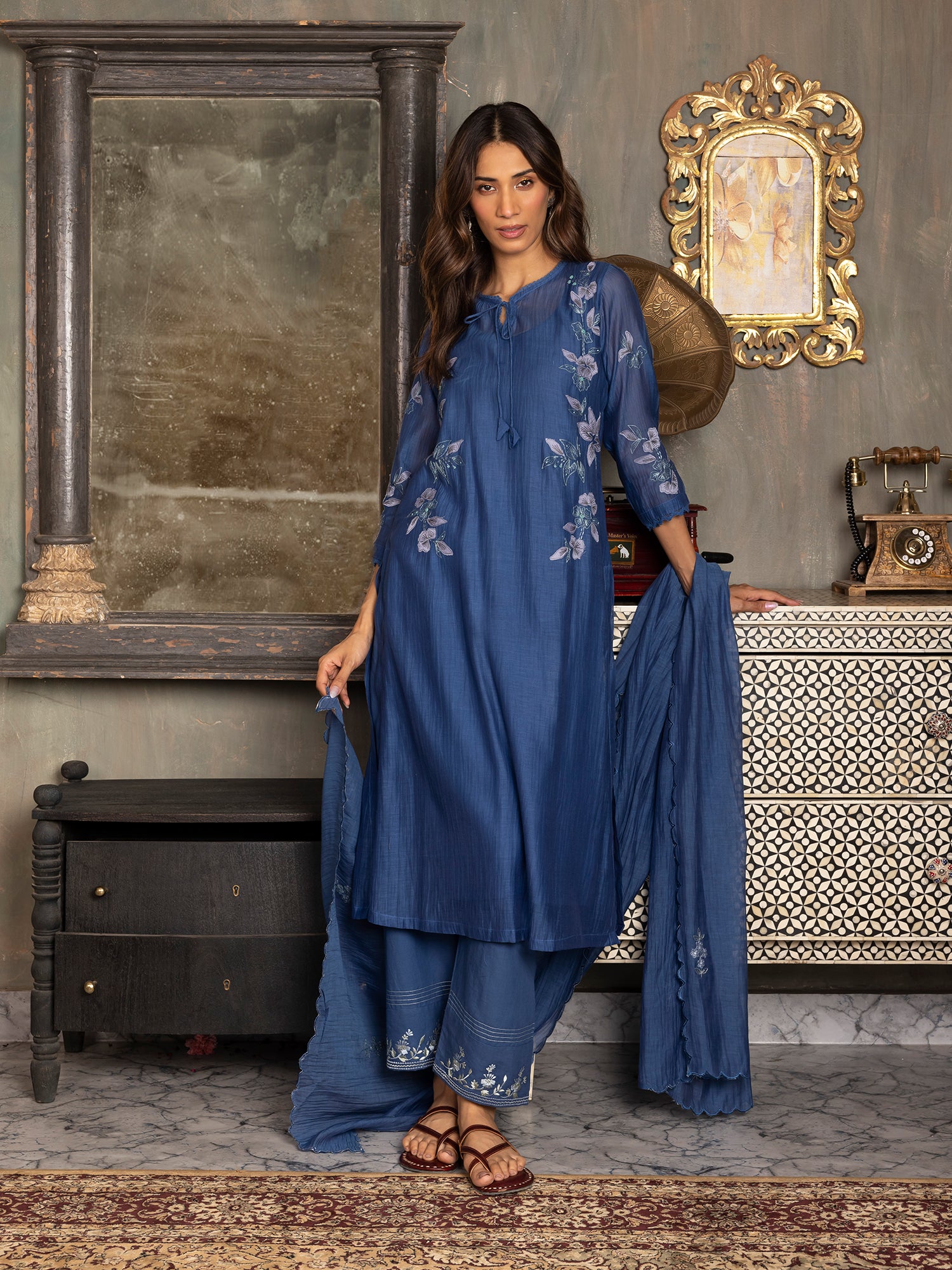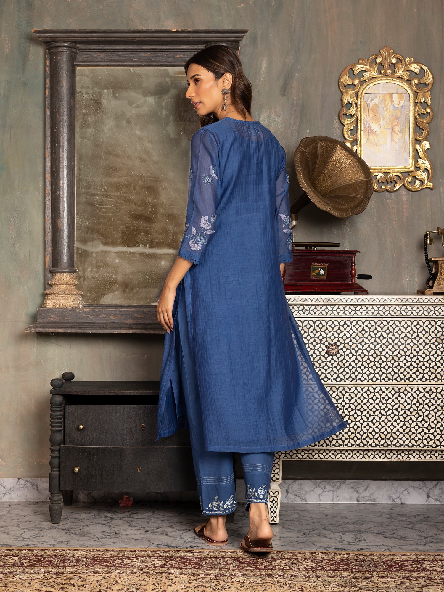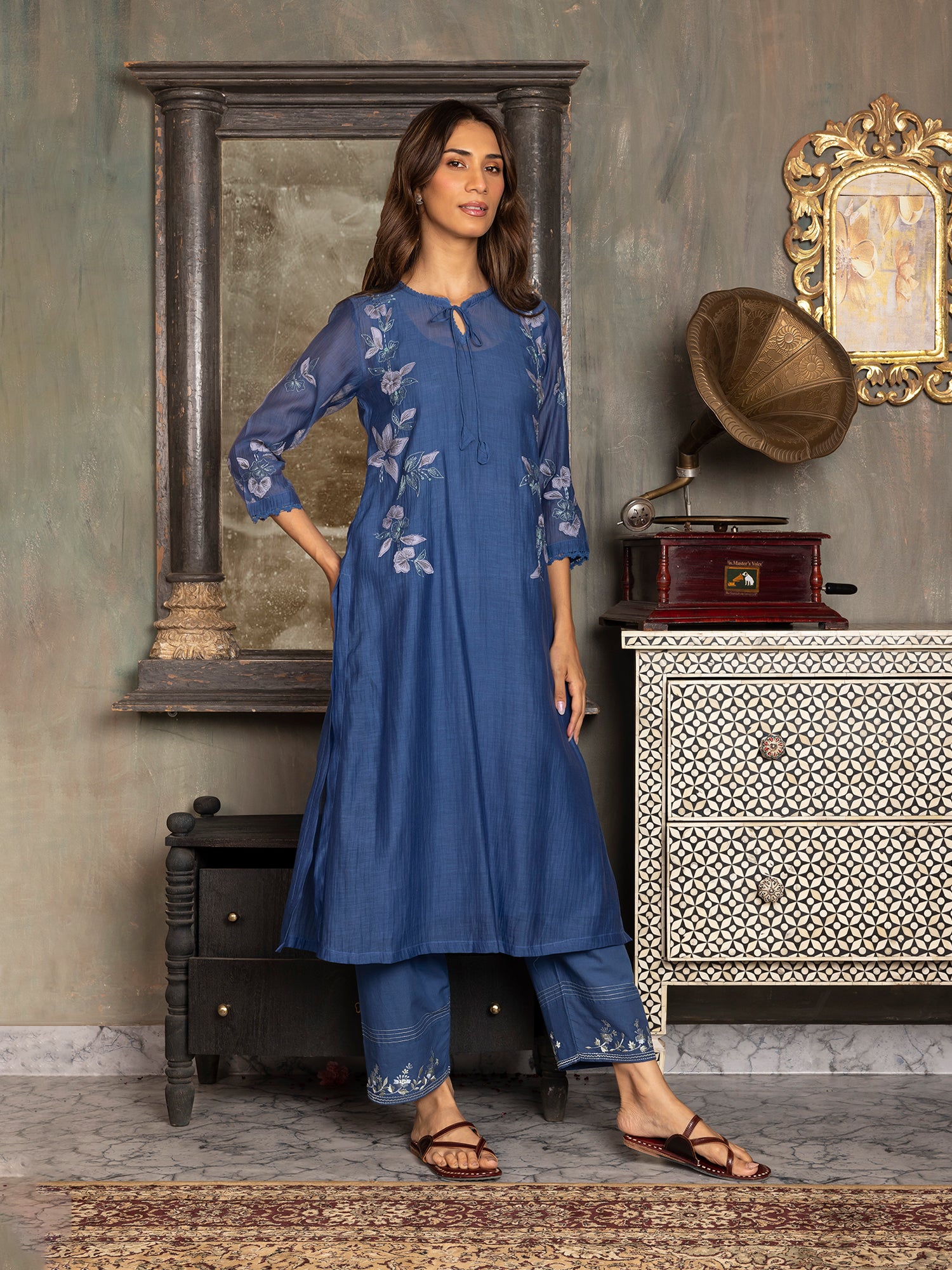 Navy blue mul chanderi thread and fabric cutwork kurta set