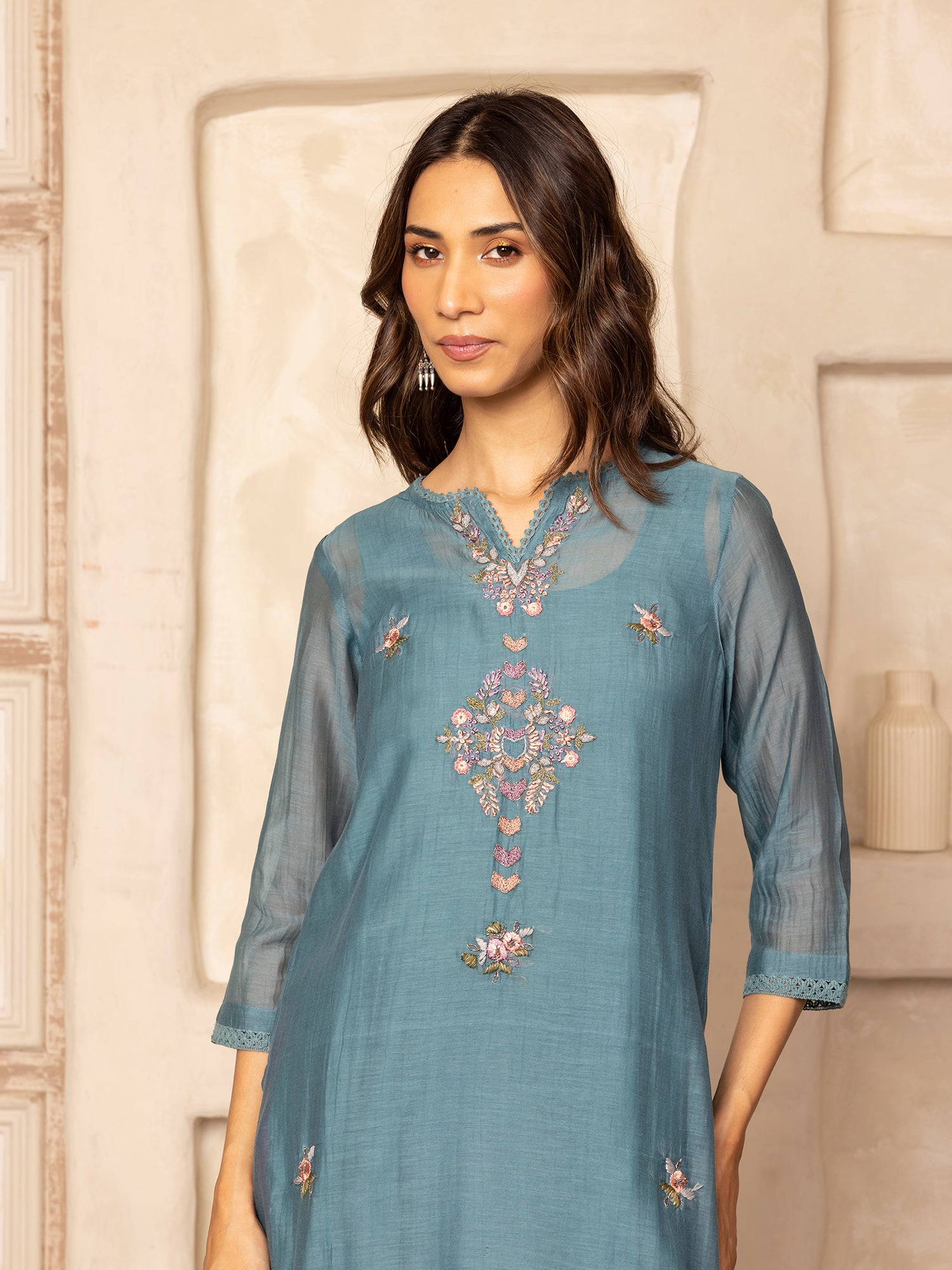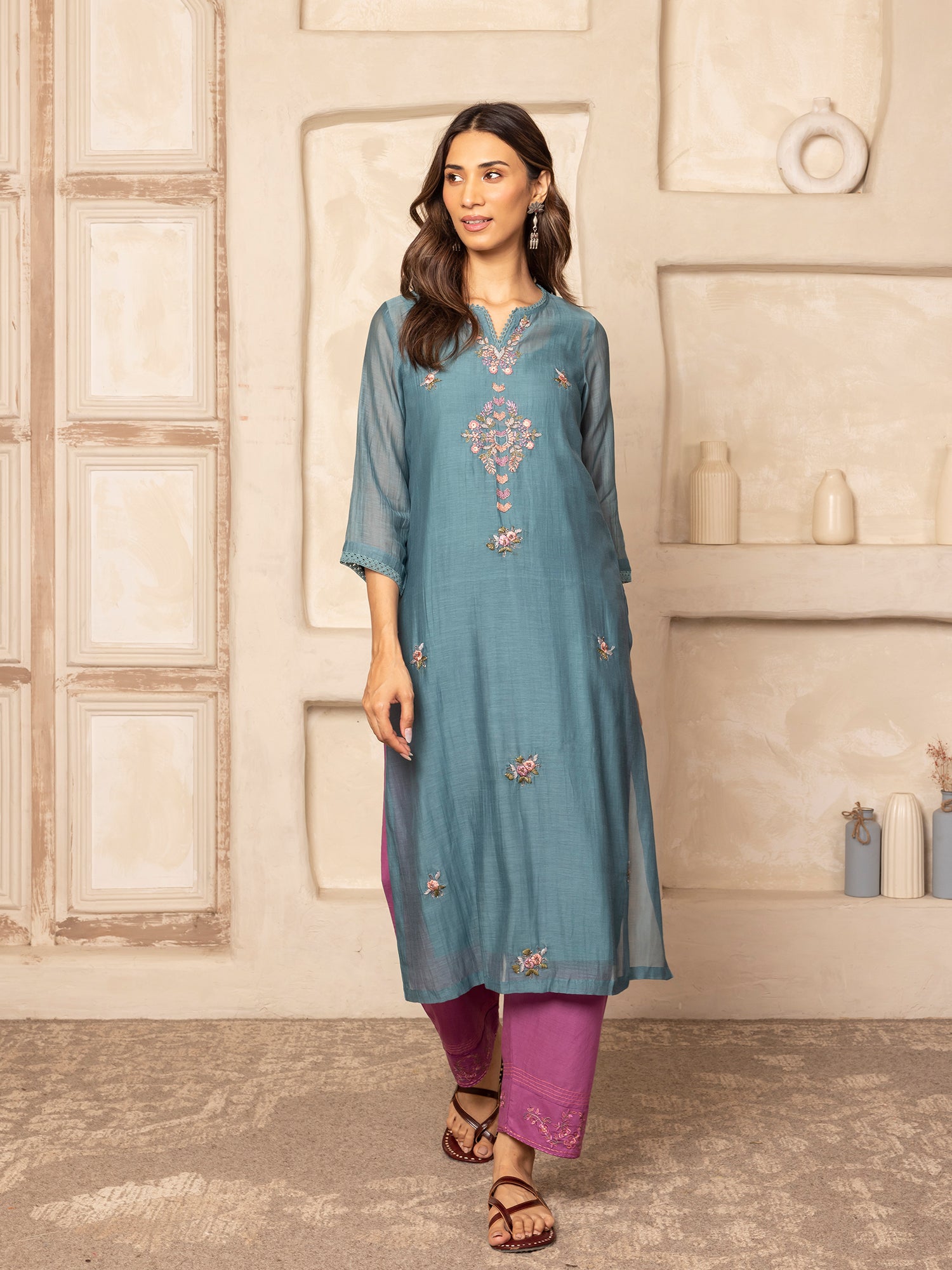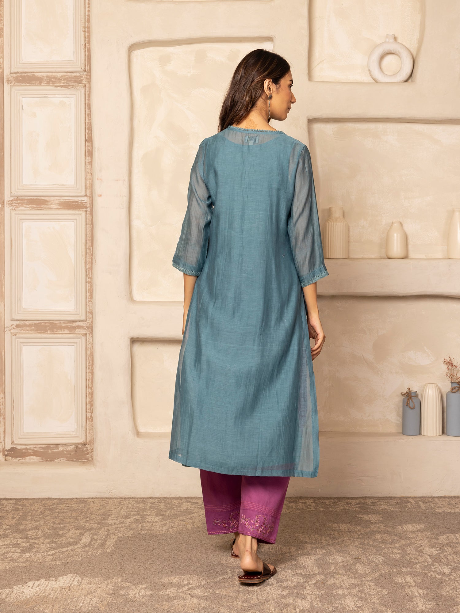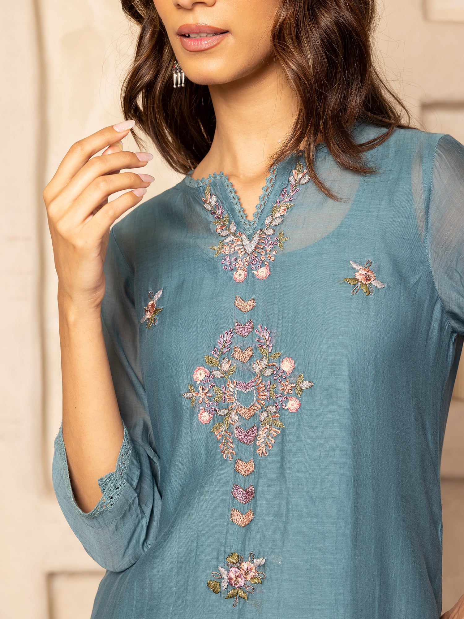 Teal mul chanderi thread with crochet hand embroidery kurta set