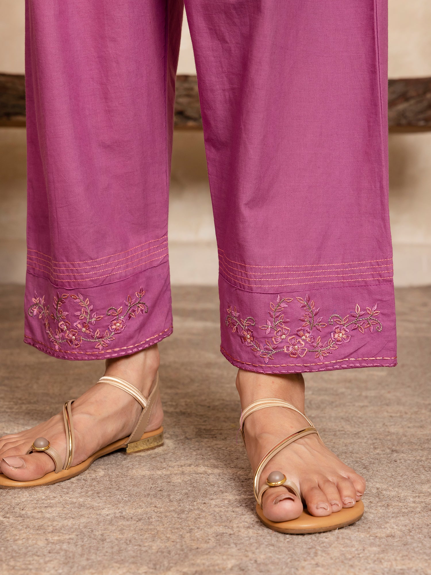 - DETAILS: The elasticated waist comes with a front tie-up detail and the pant bottom comes with thread embroidery and quilting.