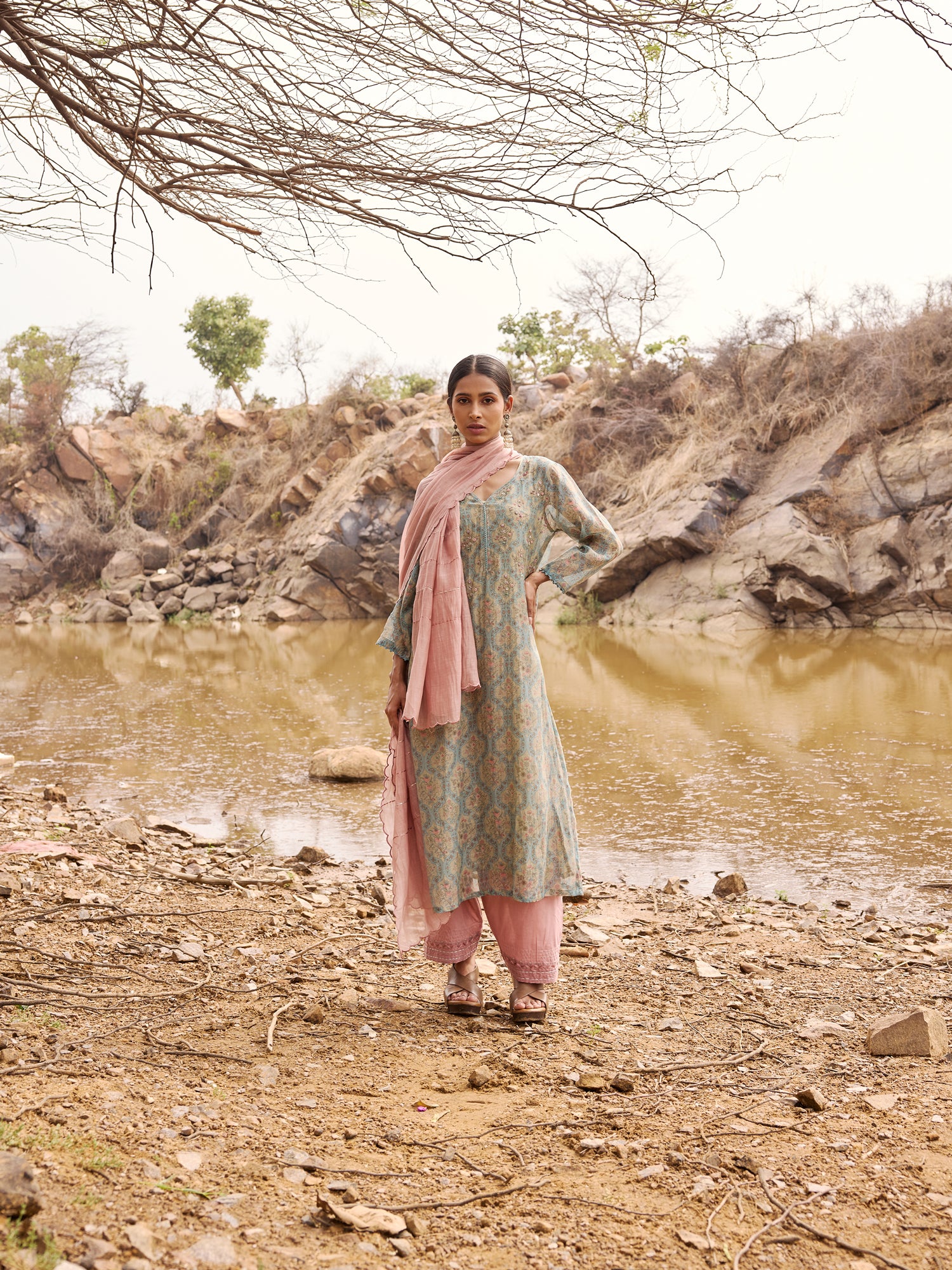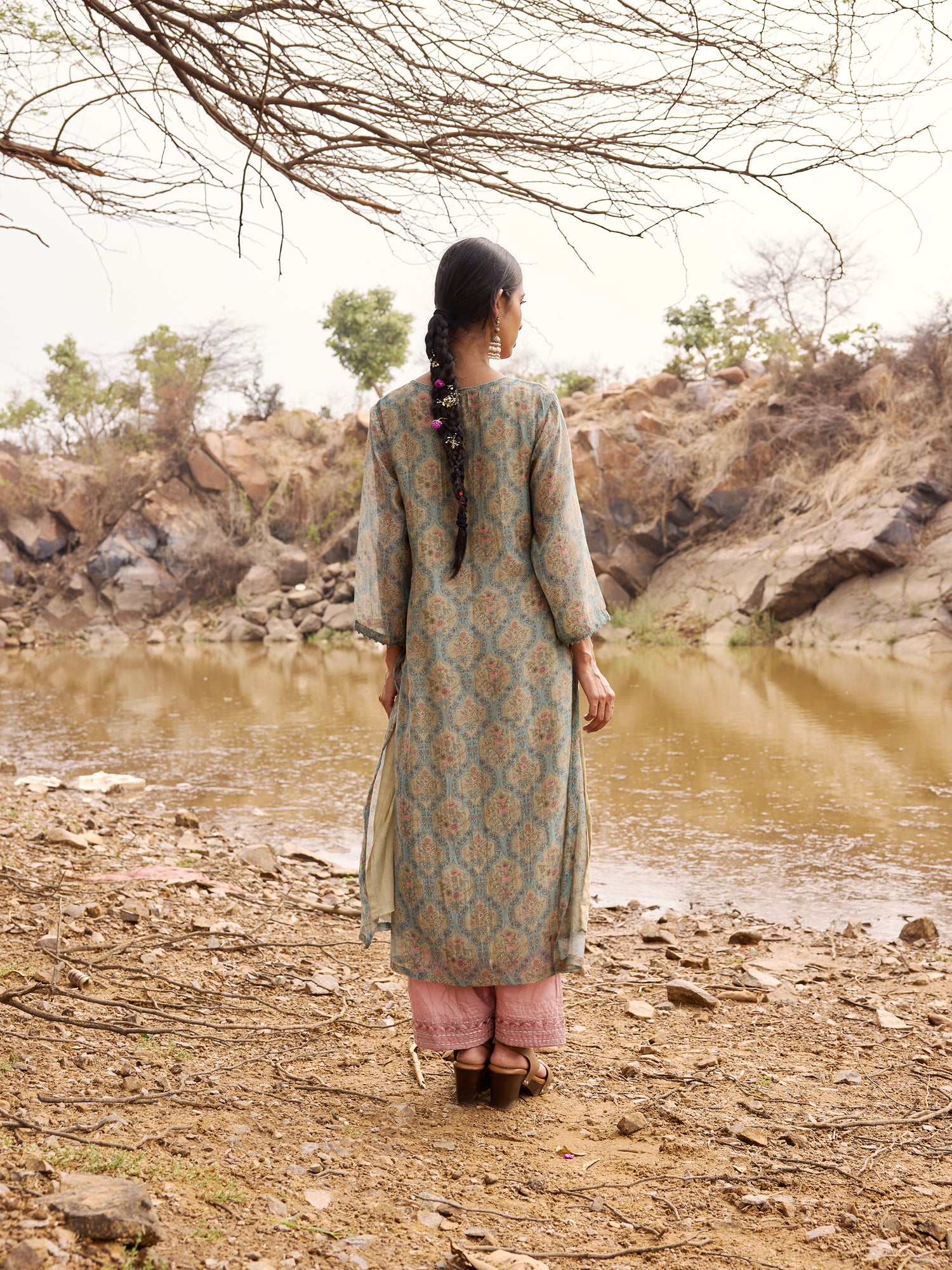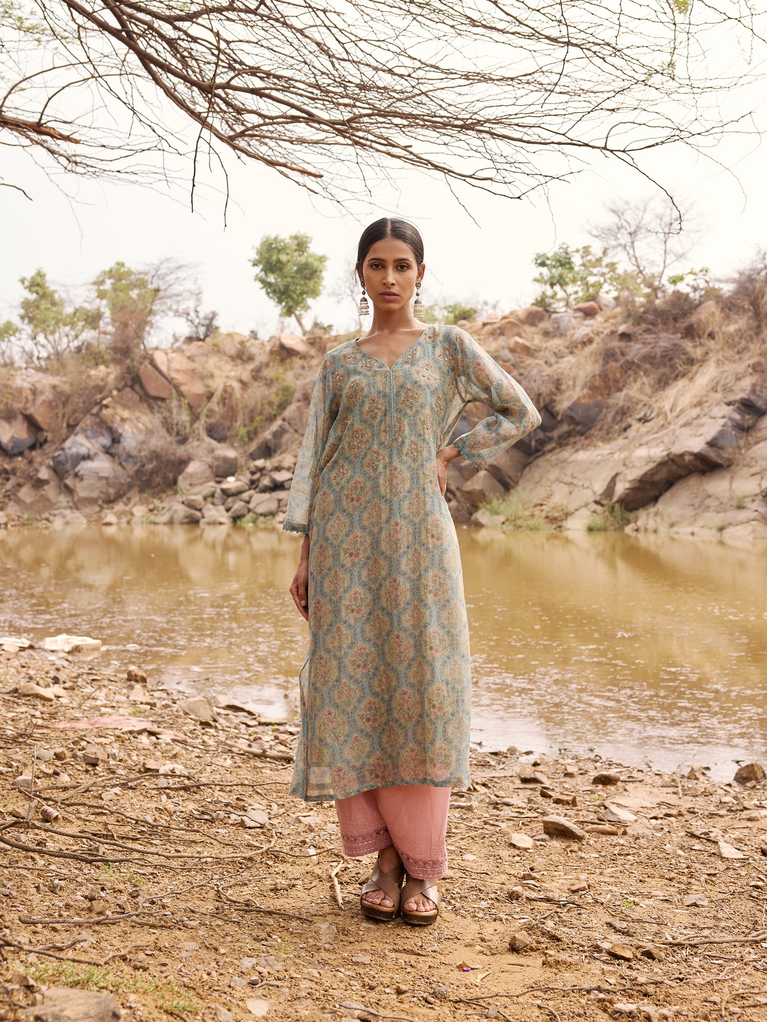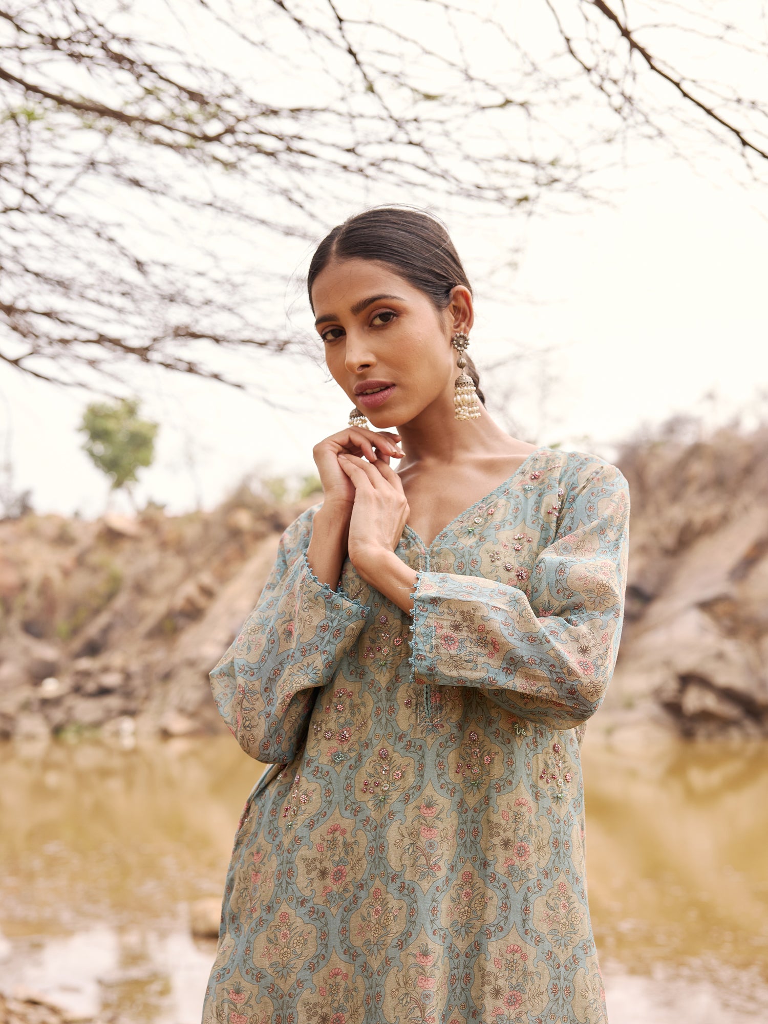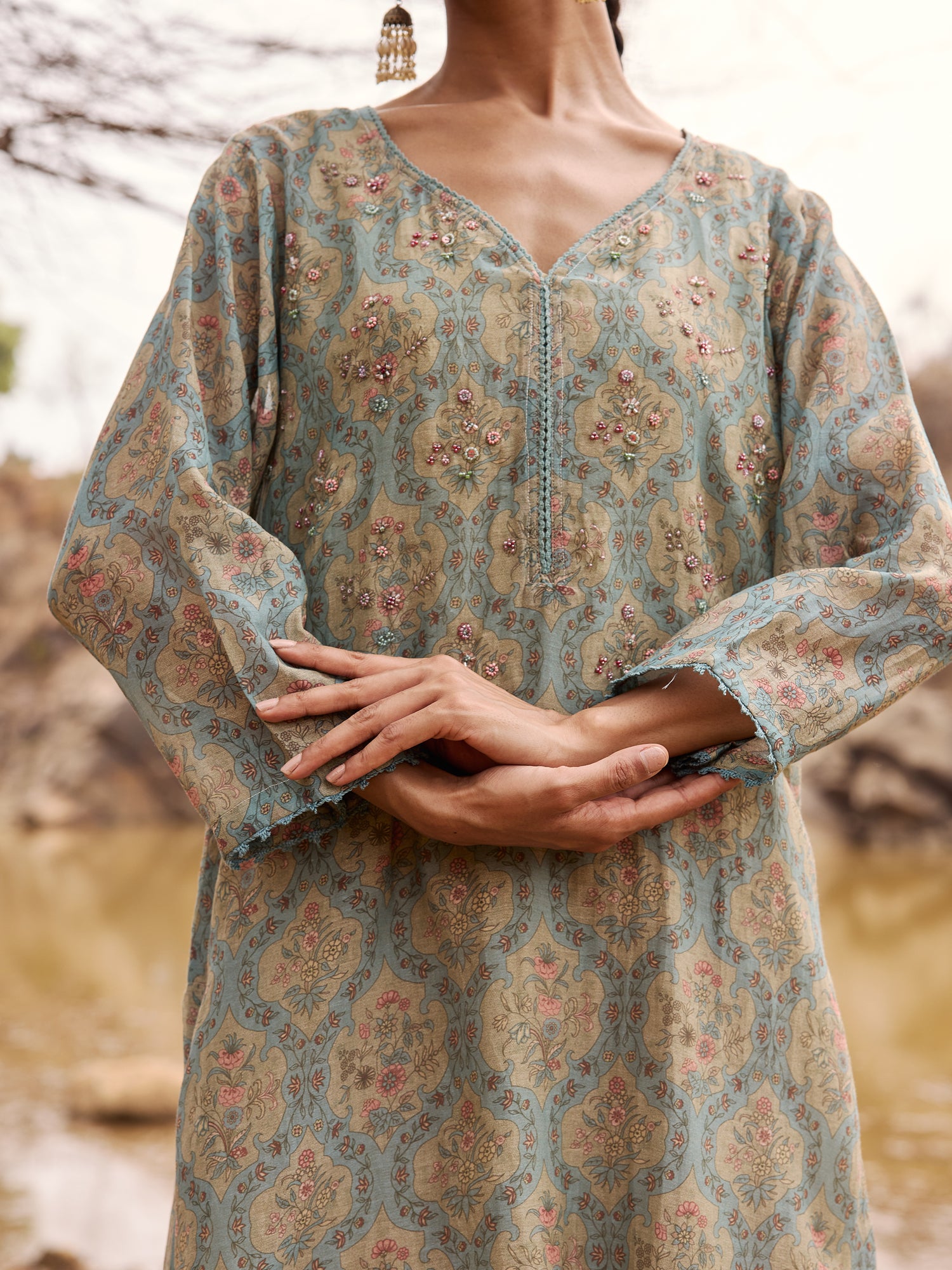 Sage Green and Blue Printed Mul Chanderi Beadwork Kurta