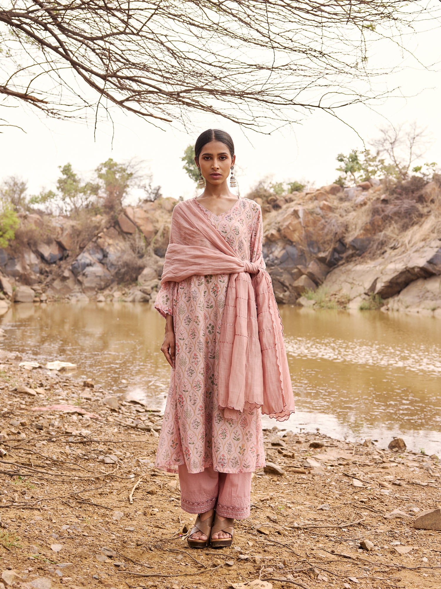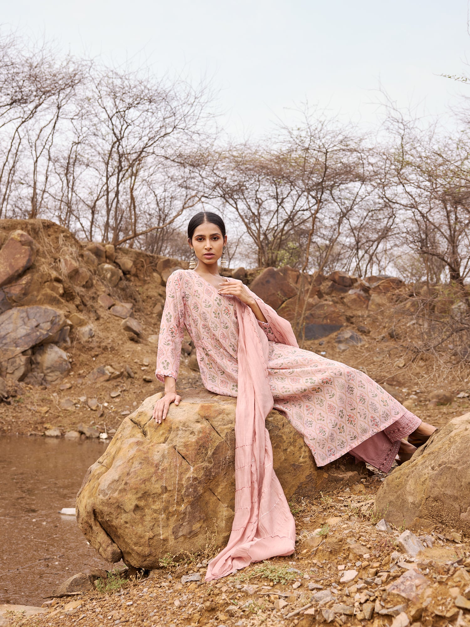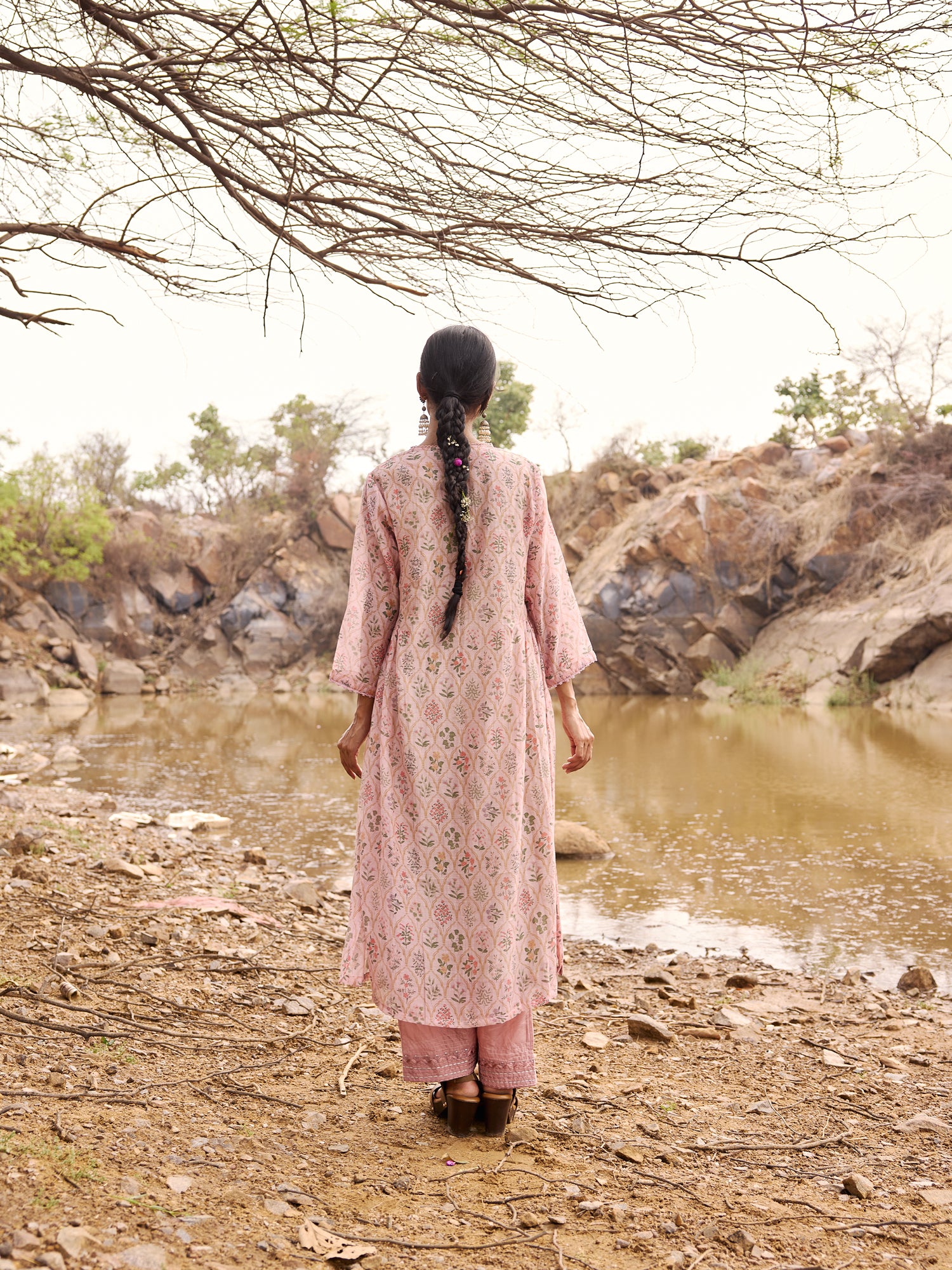 Soft Lavender Printed mul chanderi beadwrk Kurta Set
