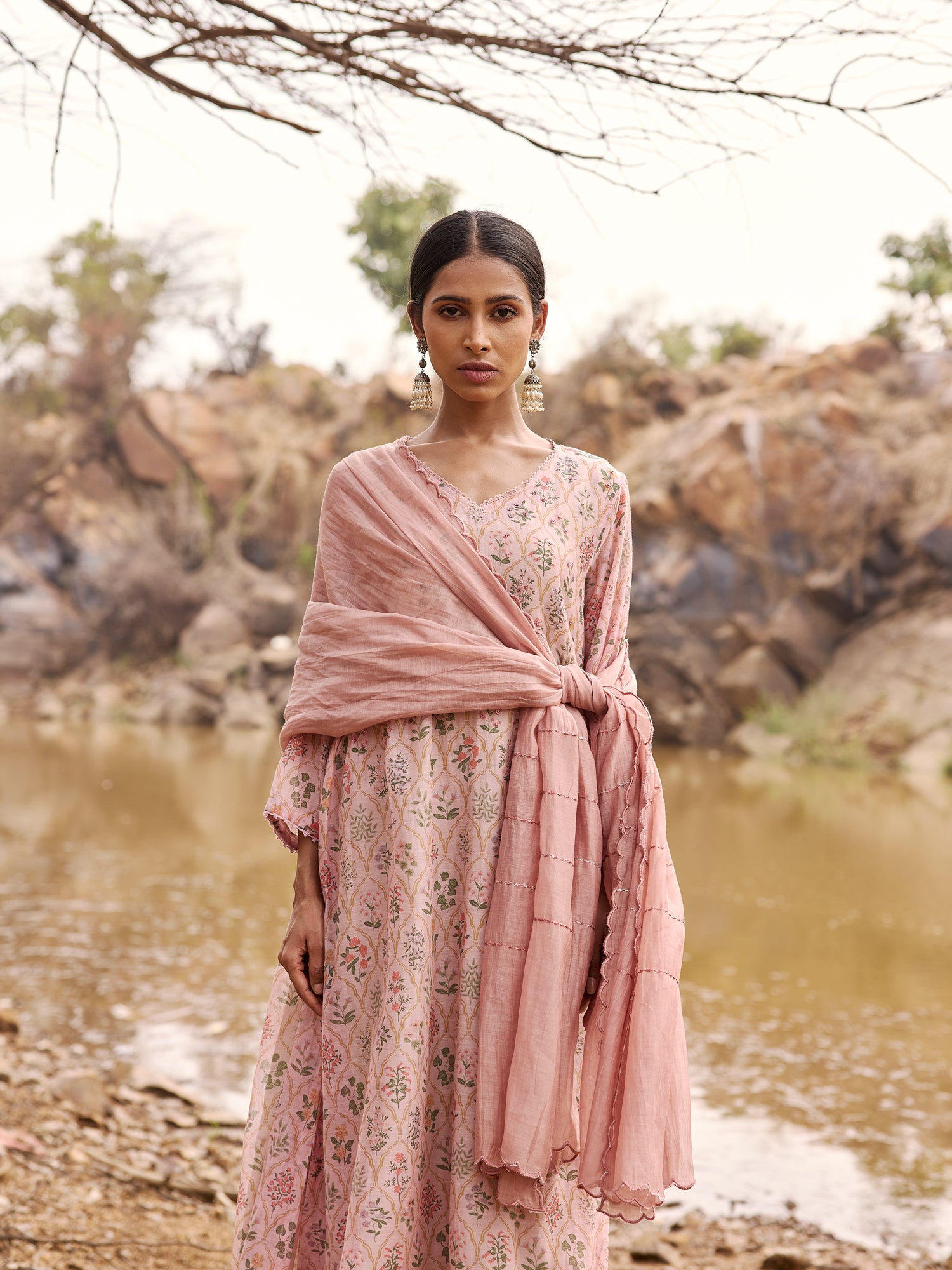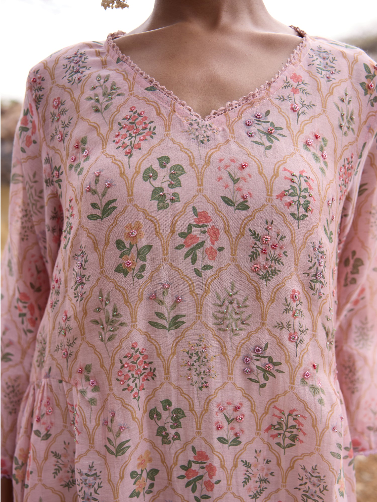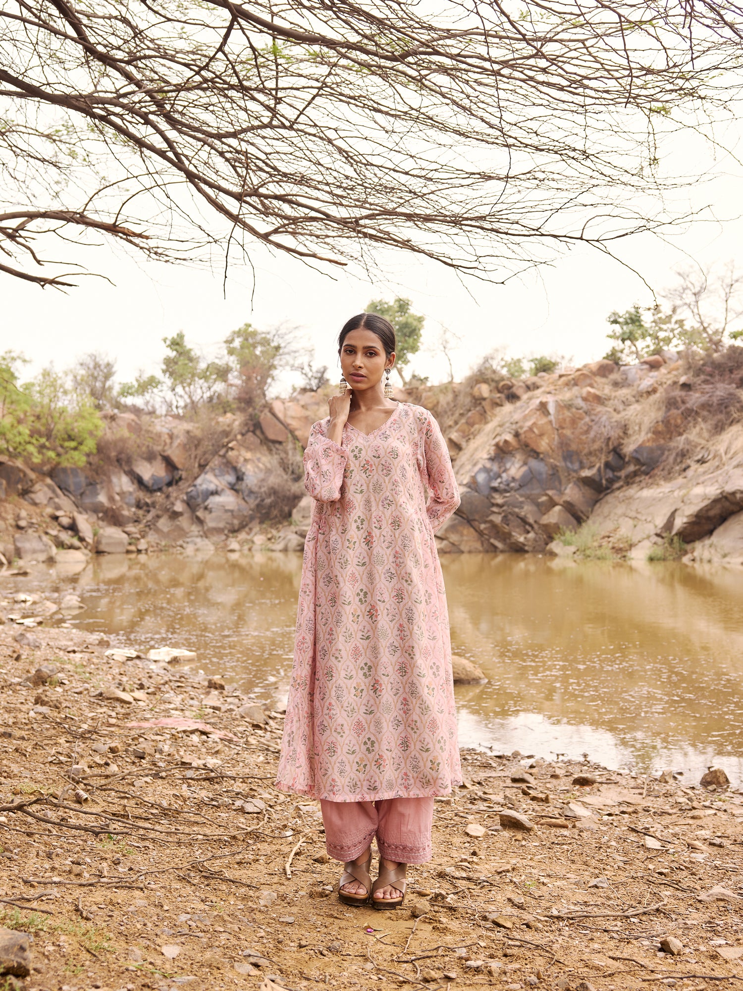 Soft Lavender Printed mul chanderi beadwrk Kurta Set
