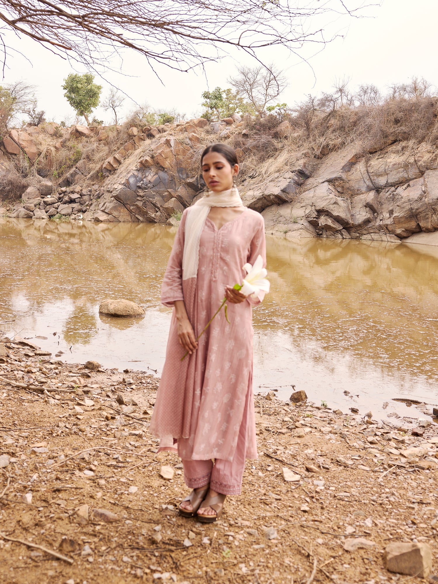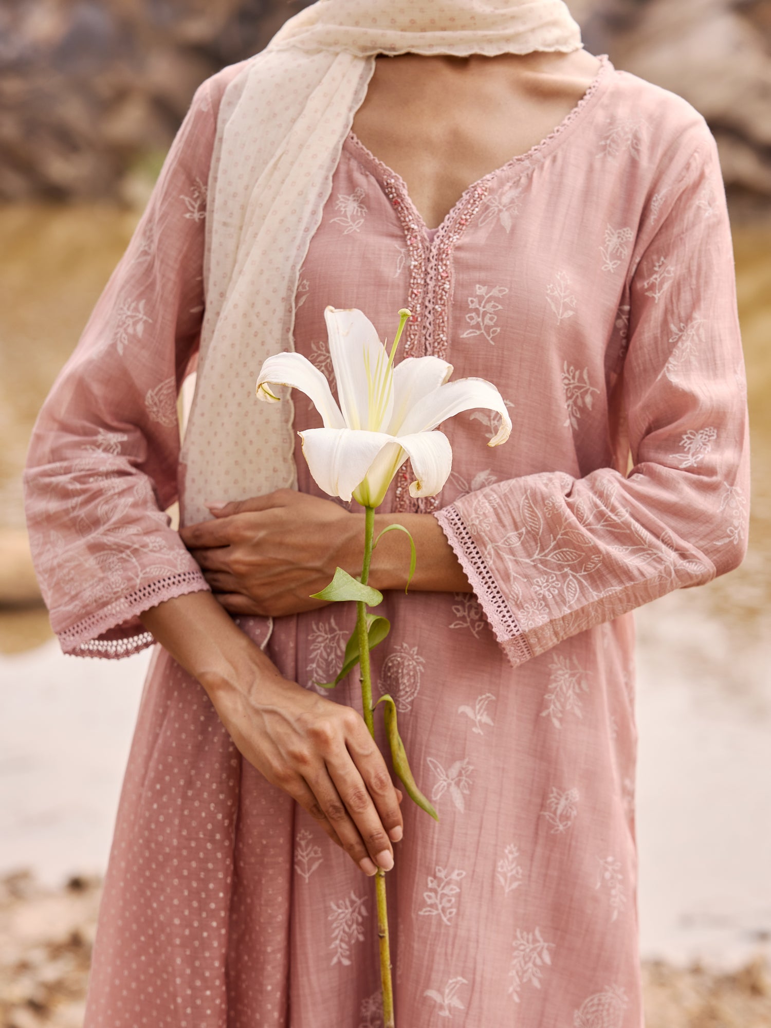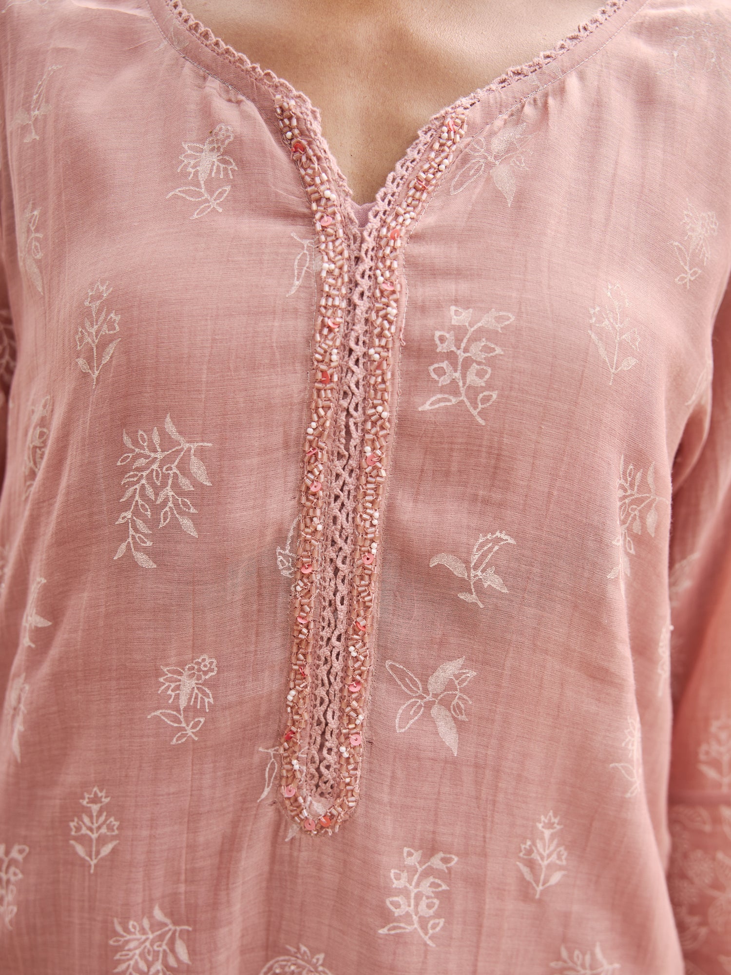 Old Rose and White Printed mul Chanderi Beadwork Kurta