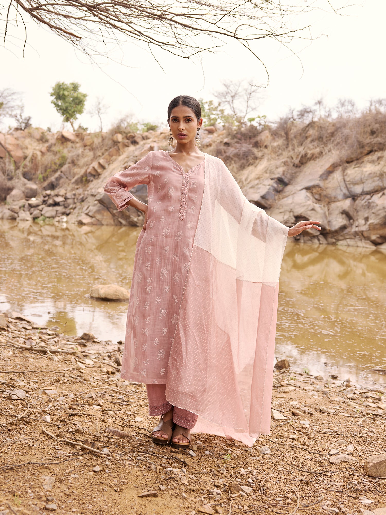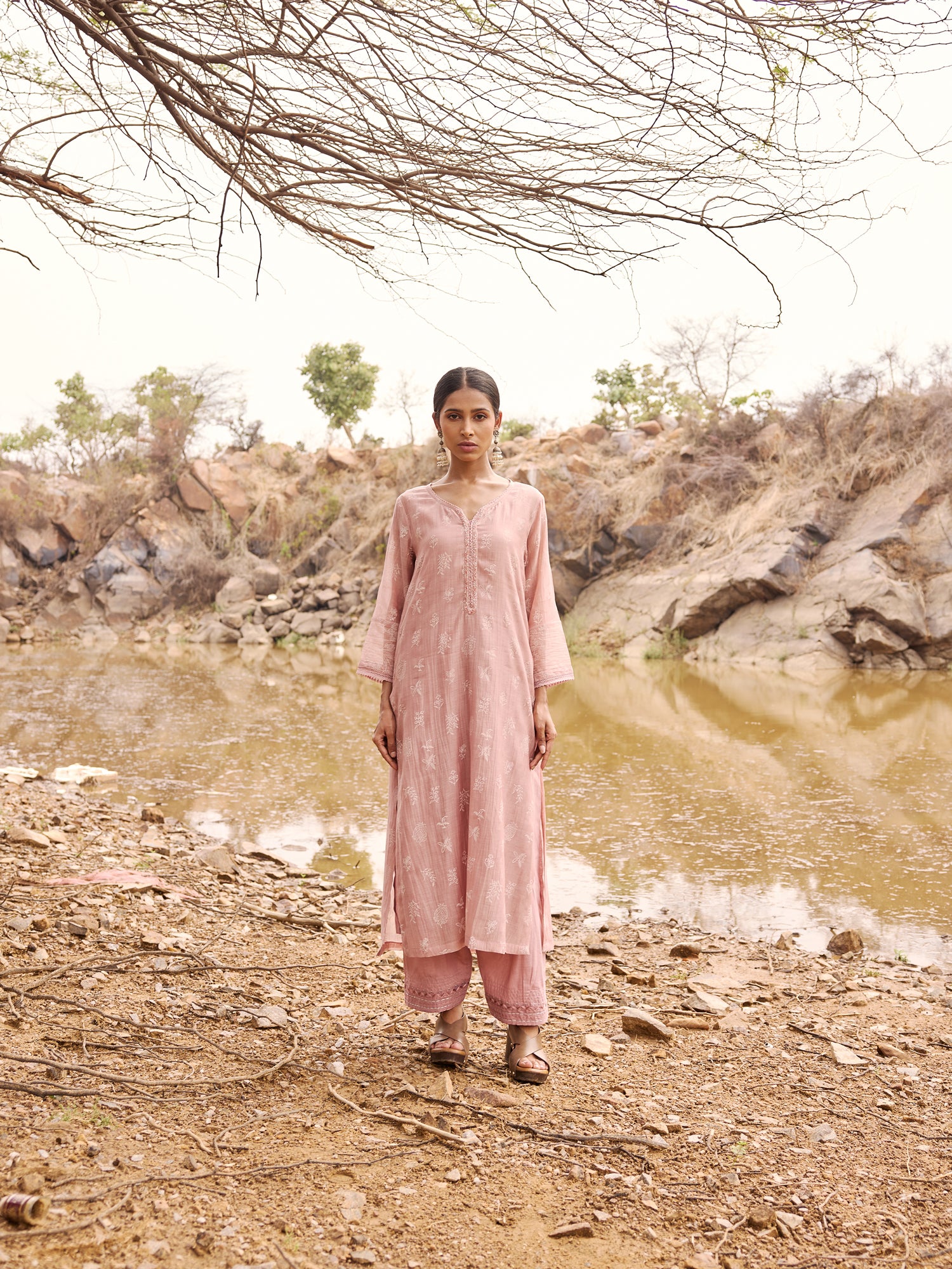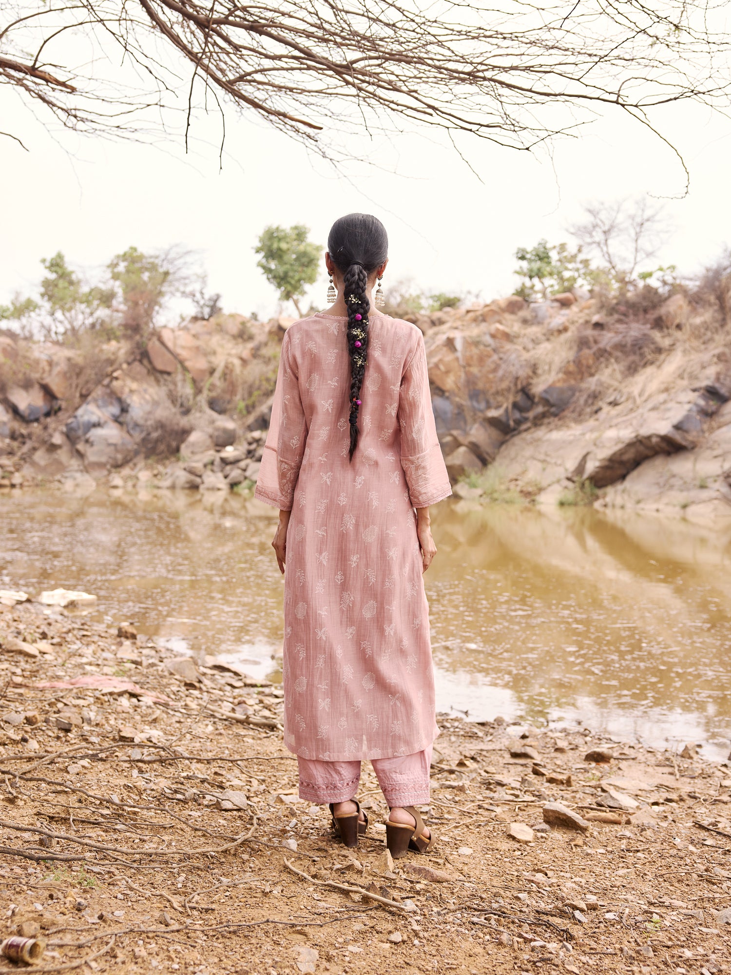 Old Rose and White Printed mul Chanderi Beadwork Kurta