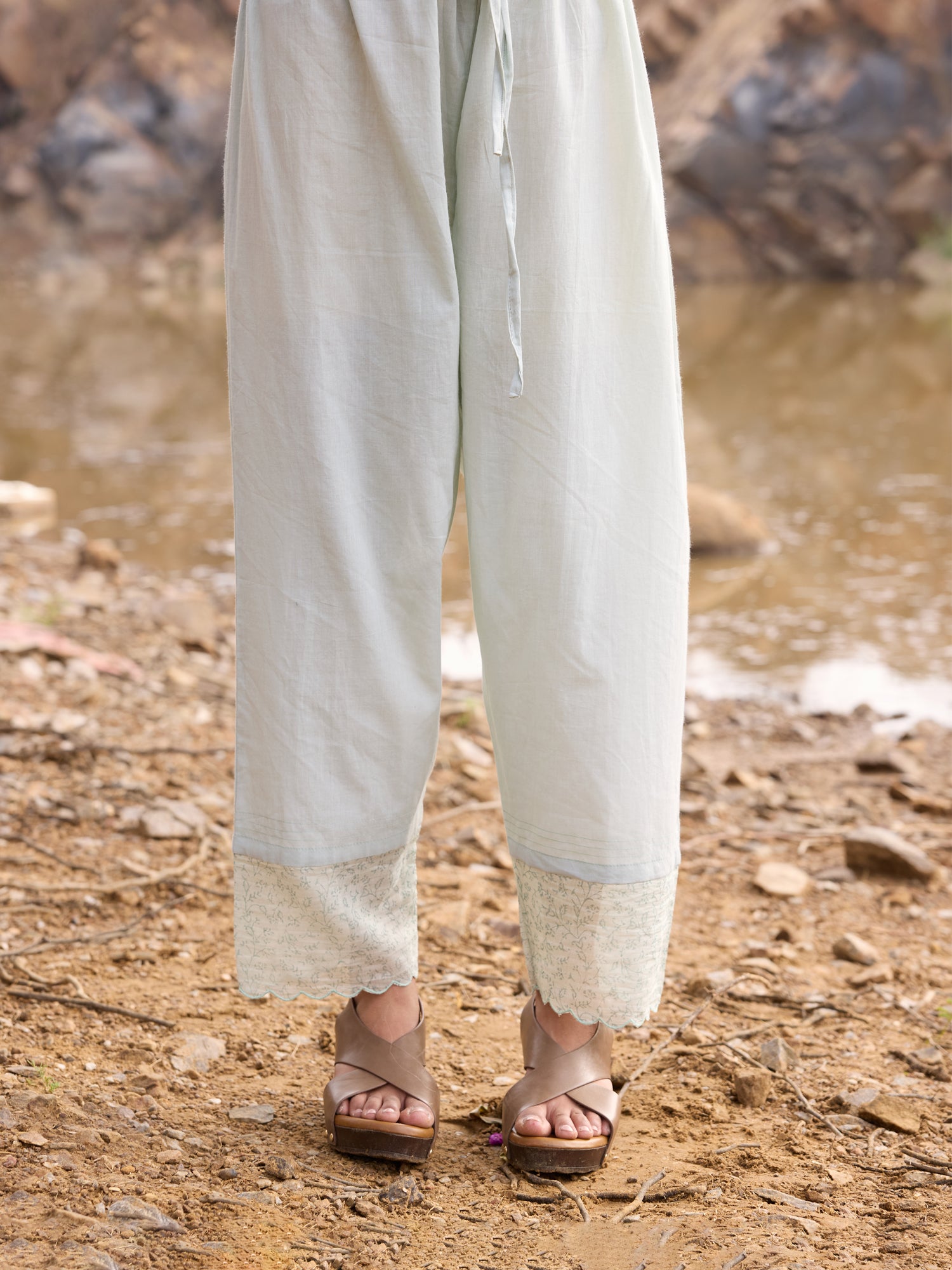 - DETAILS: The elasticated waist comes with a front tie-up detail and the pant bottom comes with a printed scallops band.