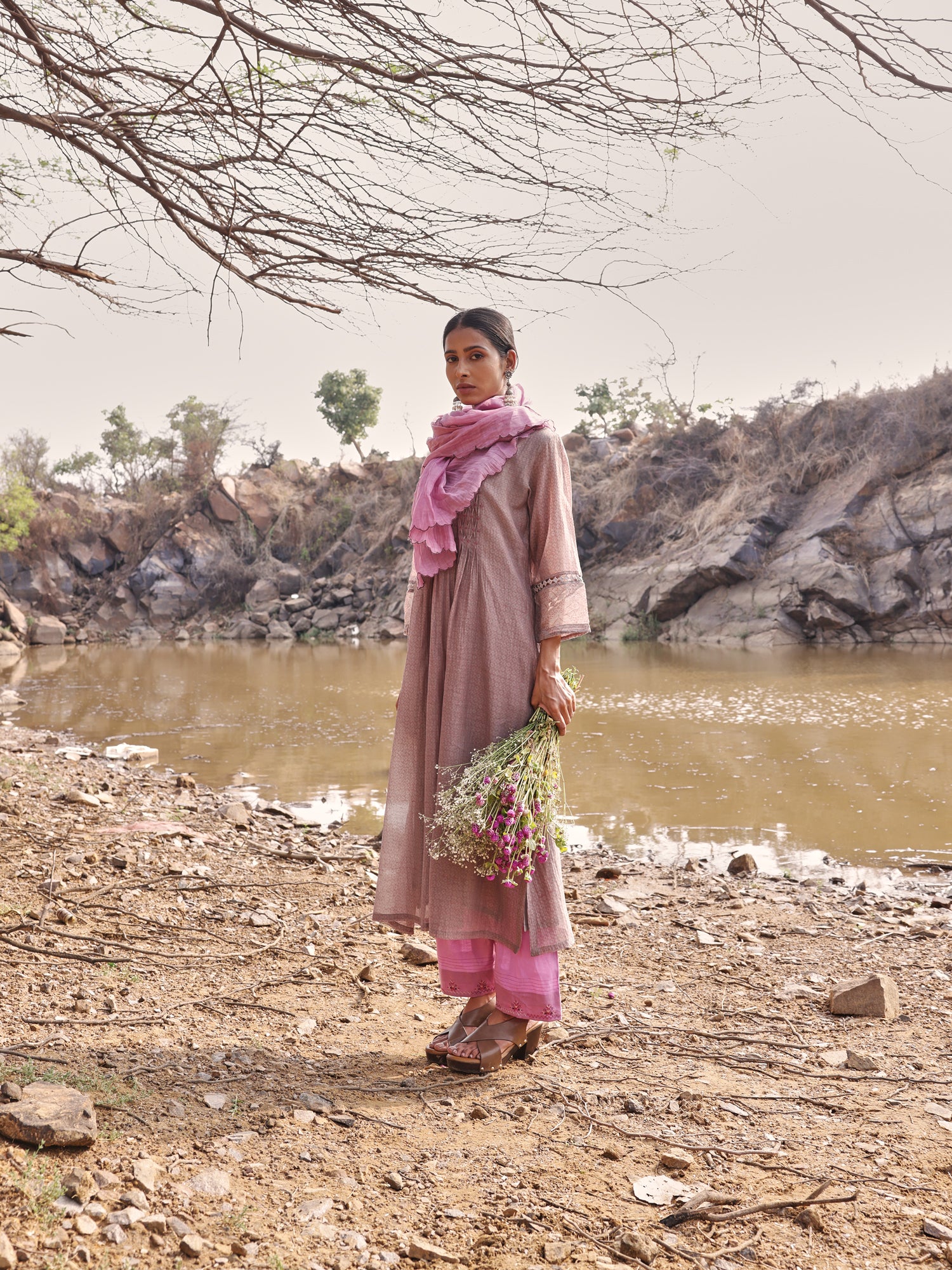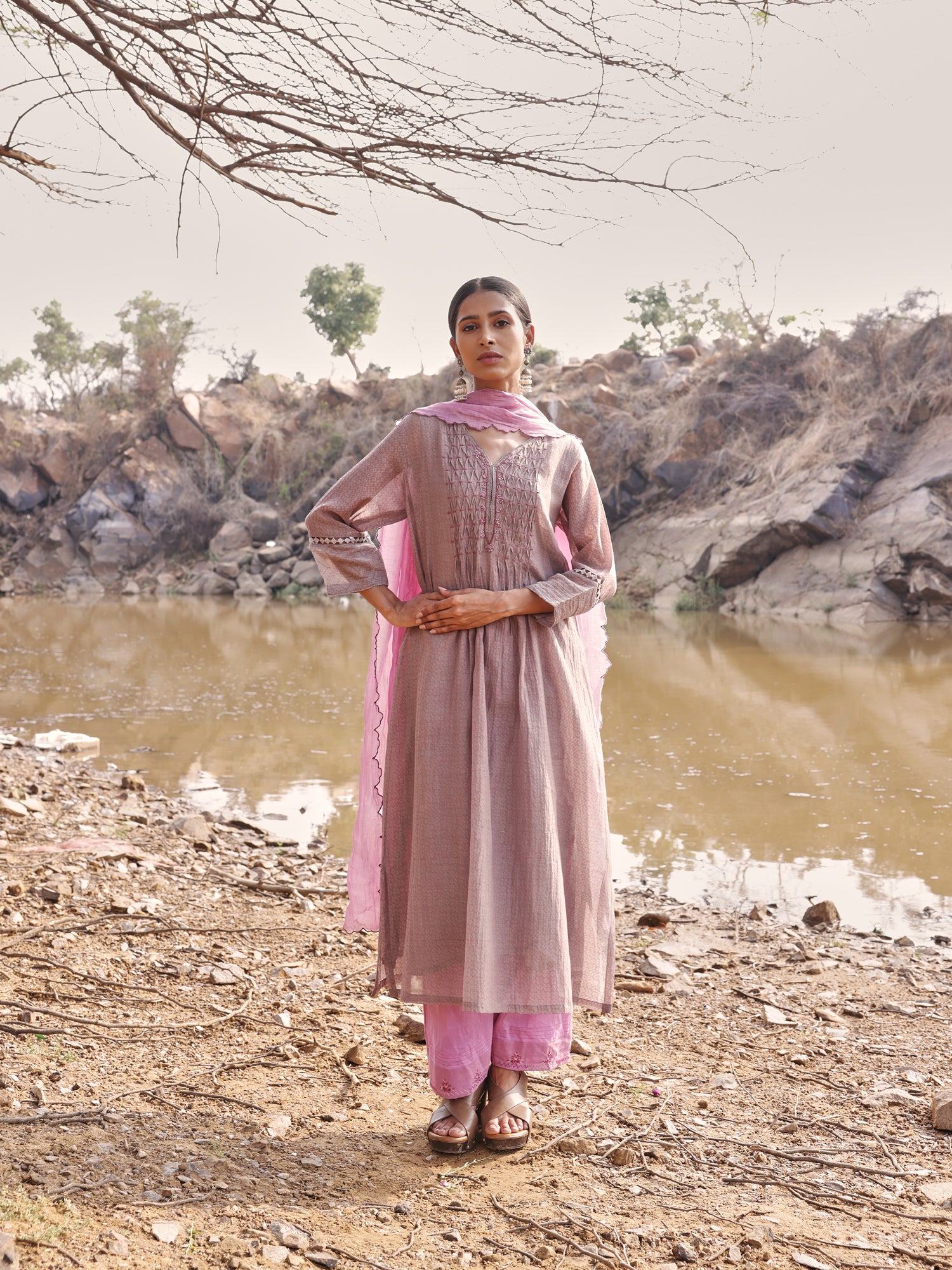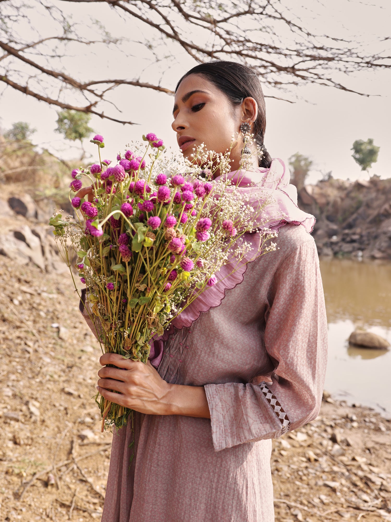 Mauve and Purple Printed Mul Chanderi Beadwork Kurta Set