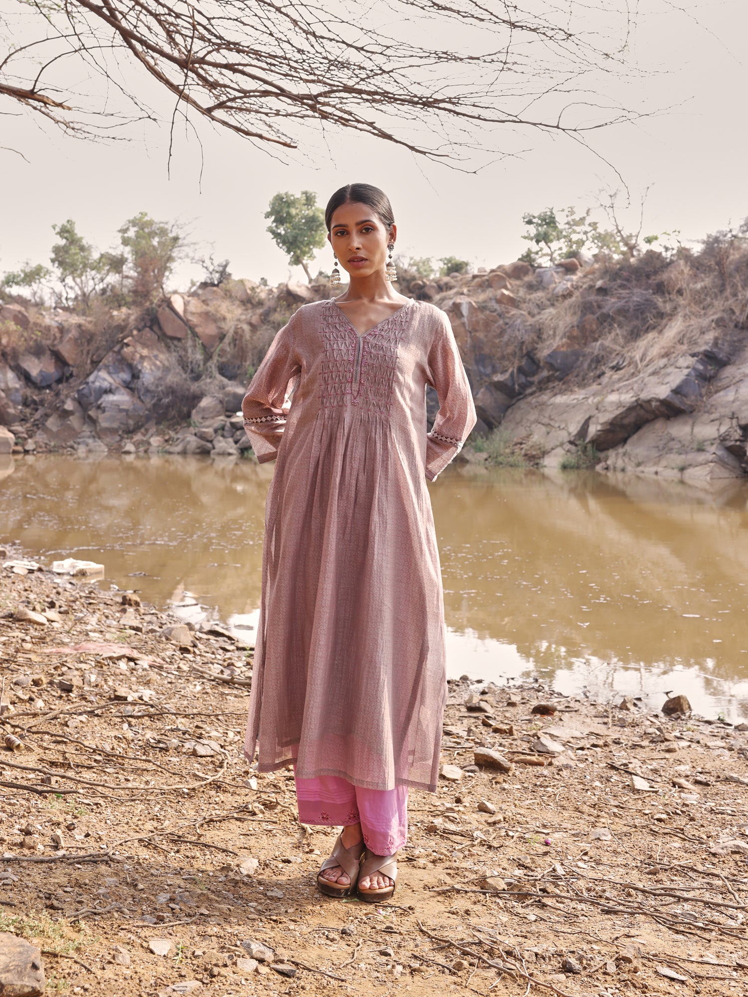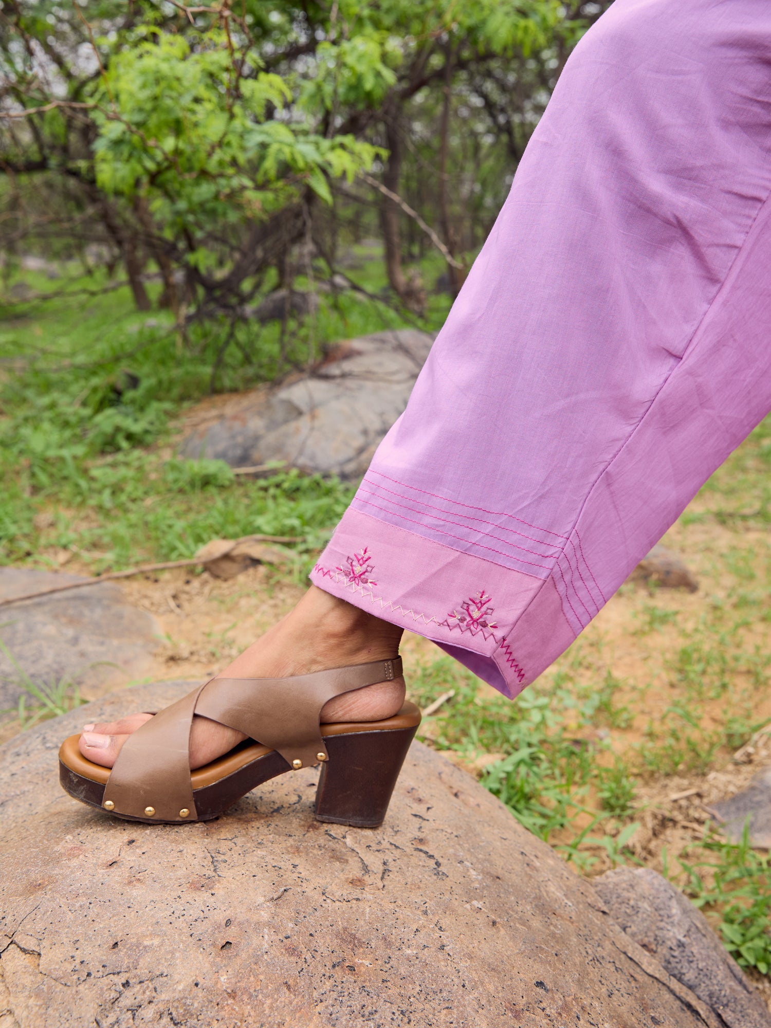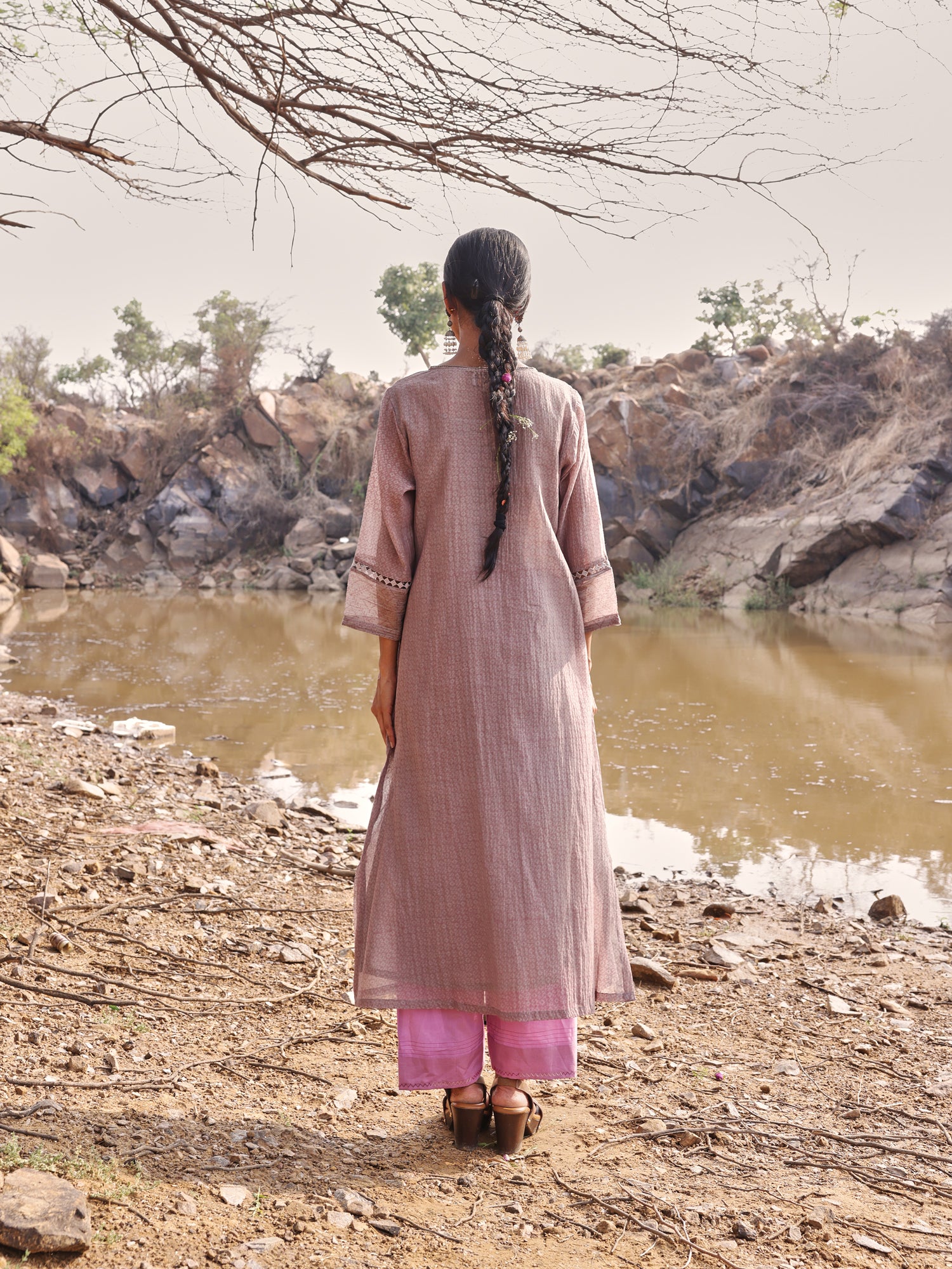 Mauve and Purple Printed Mul Chanderi Beadwork Kurta Set
