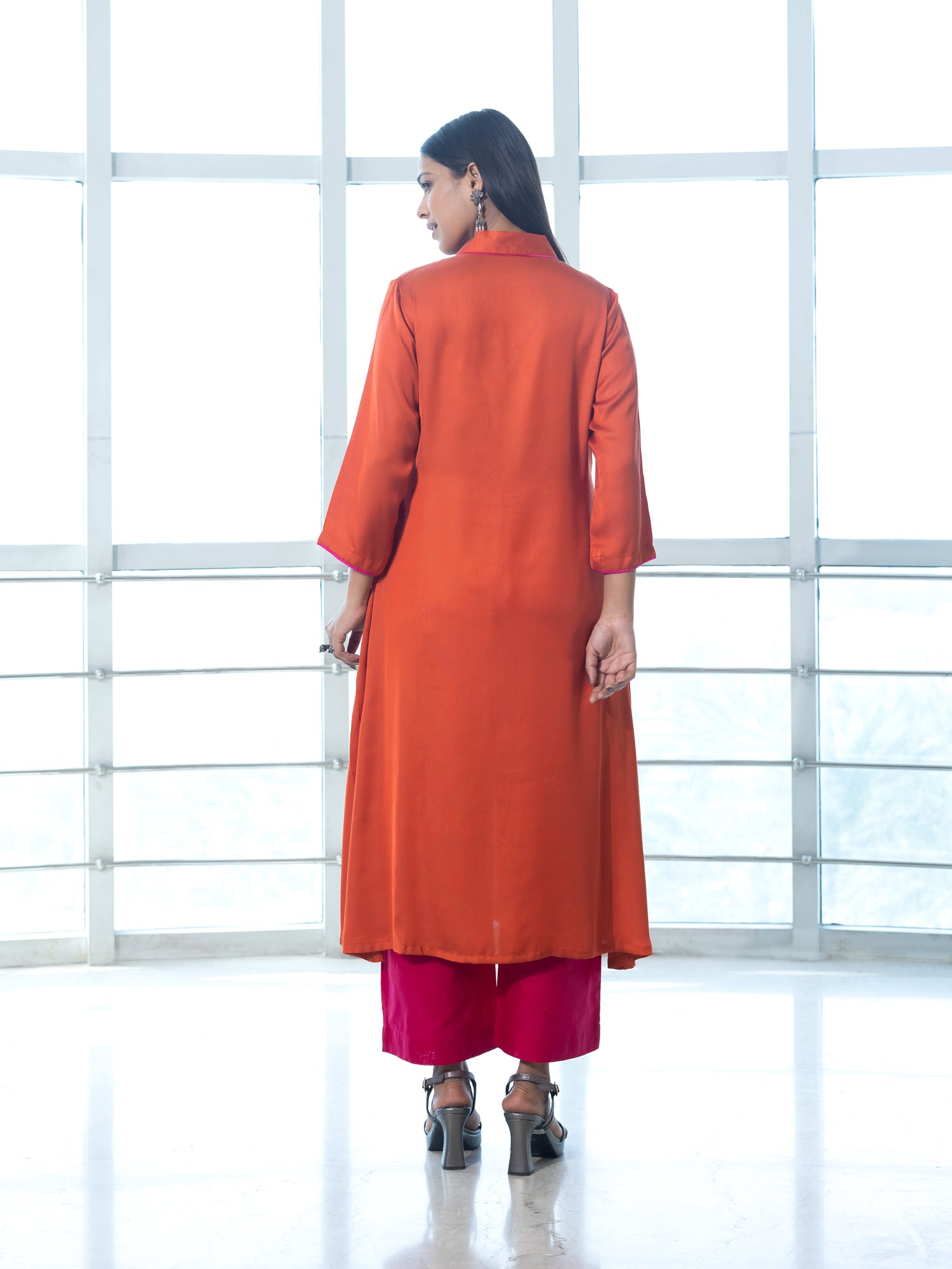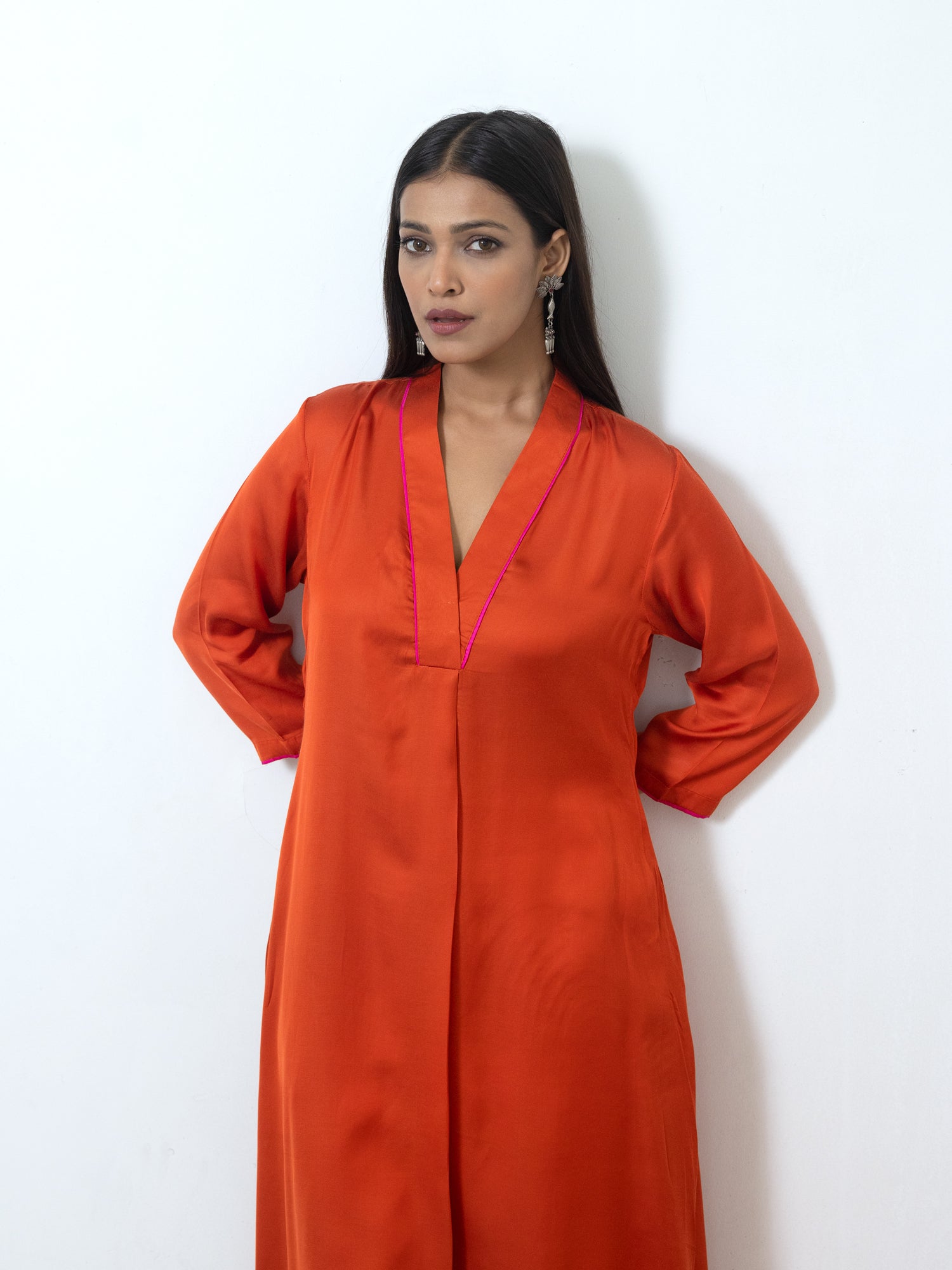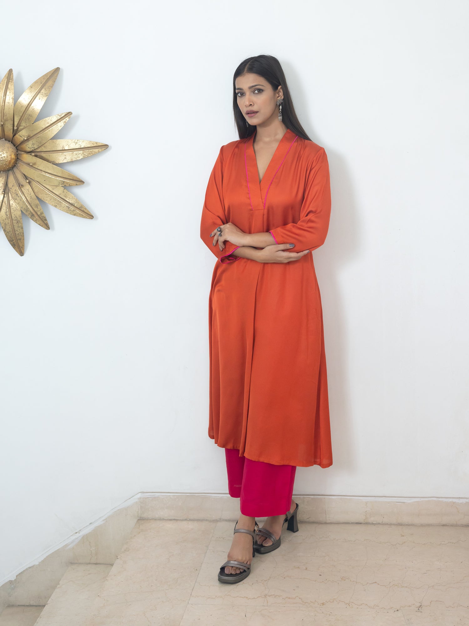 - DETAILS: V neck collar with pink piping and little gatheres, side slits for easy mobility and pockets on both sides of the kurta.