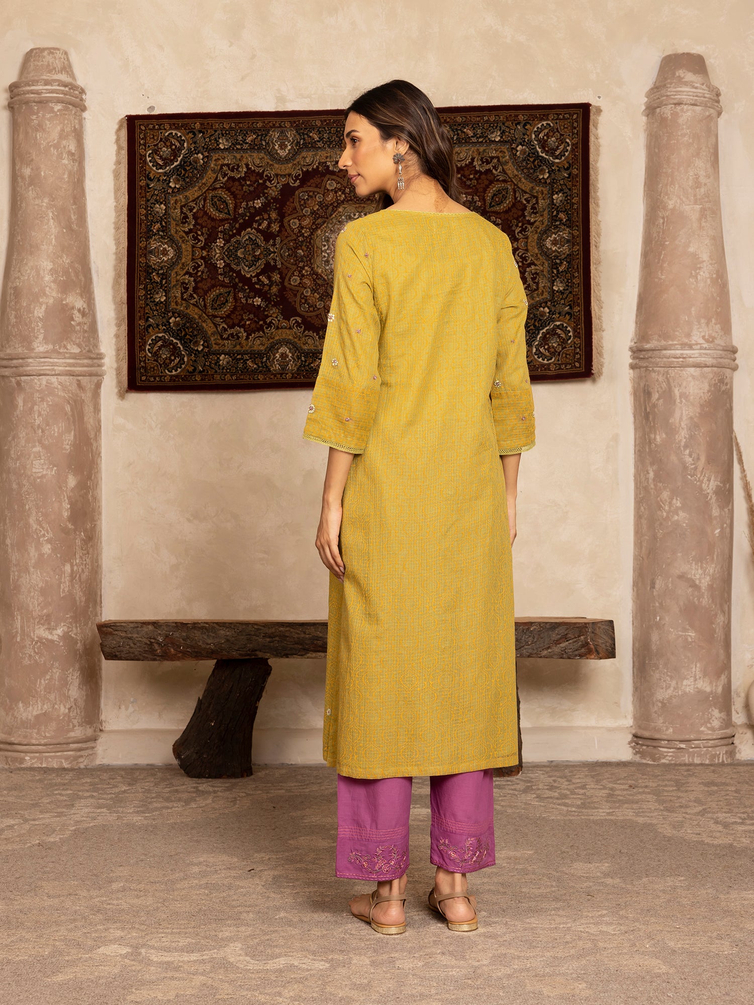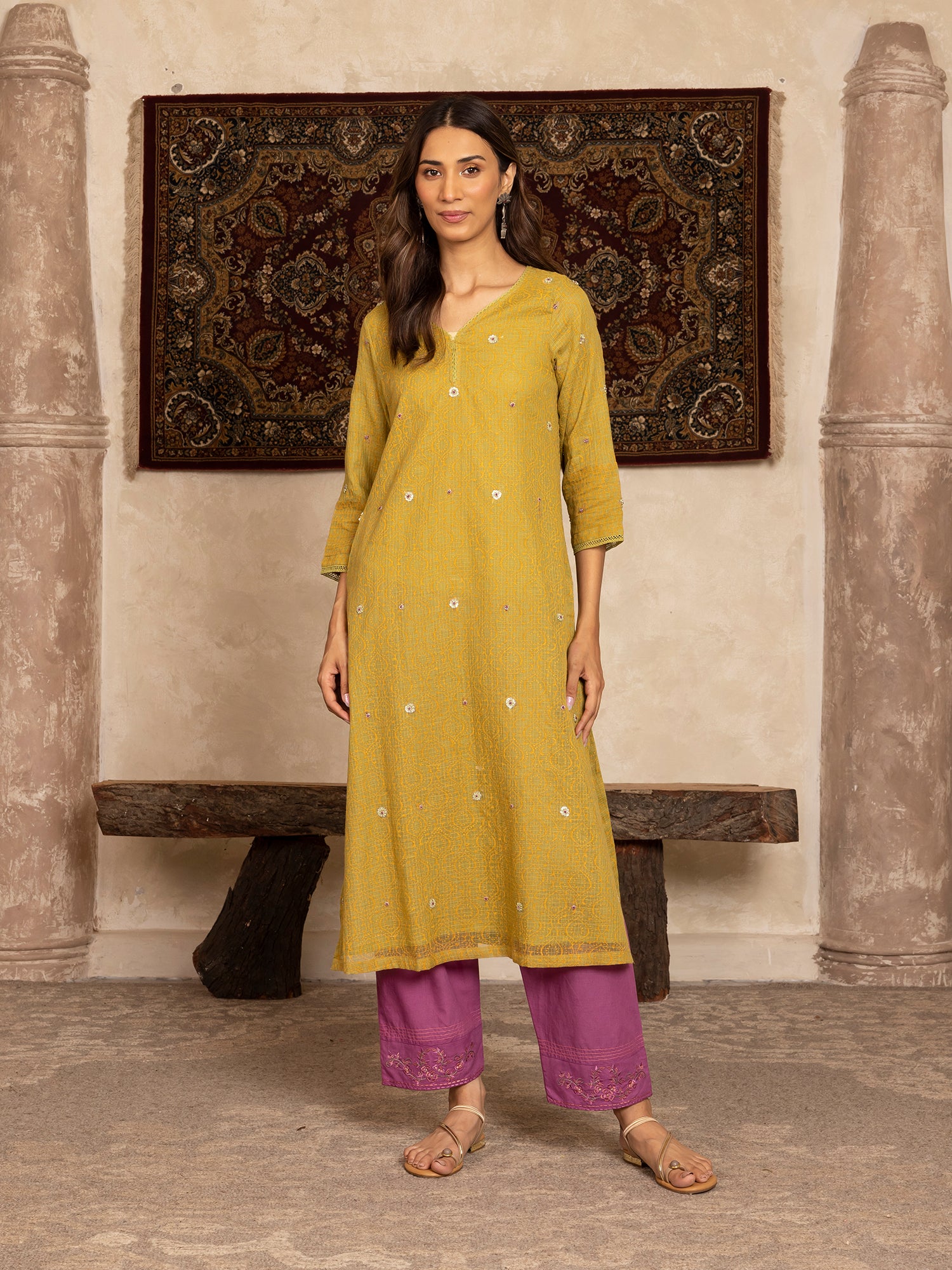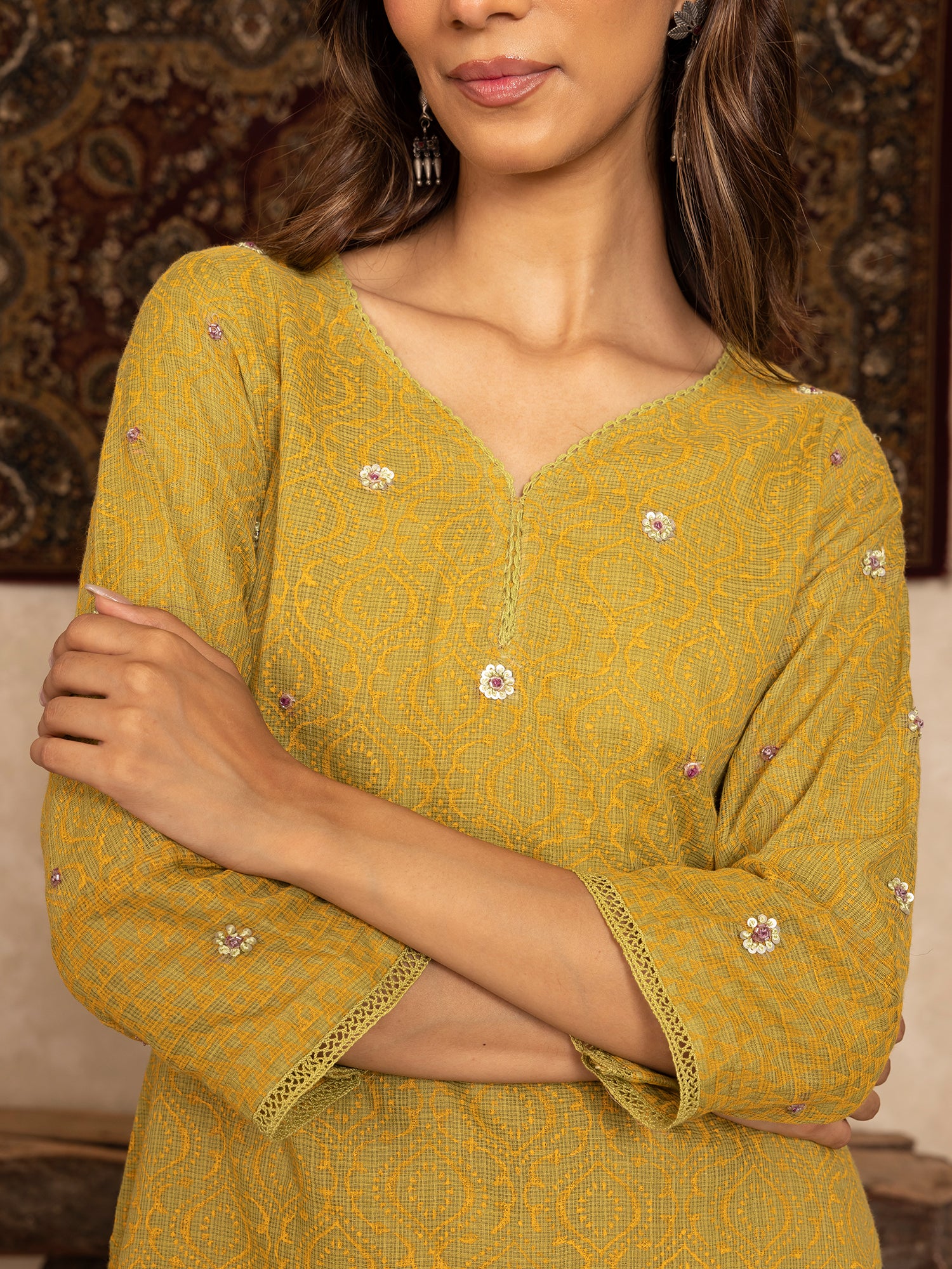 Parrot green hand block print kota cotton with zardozi hand embroidery kurta
