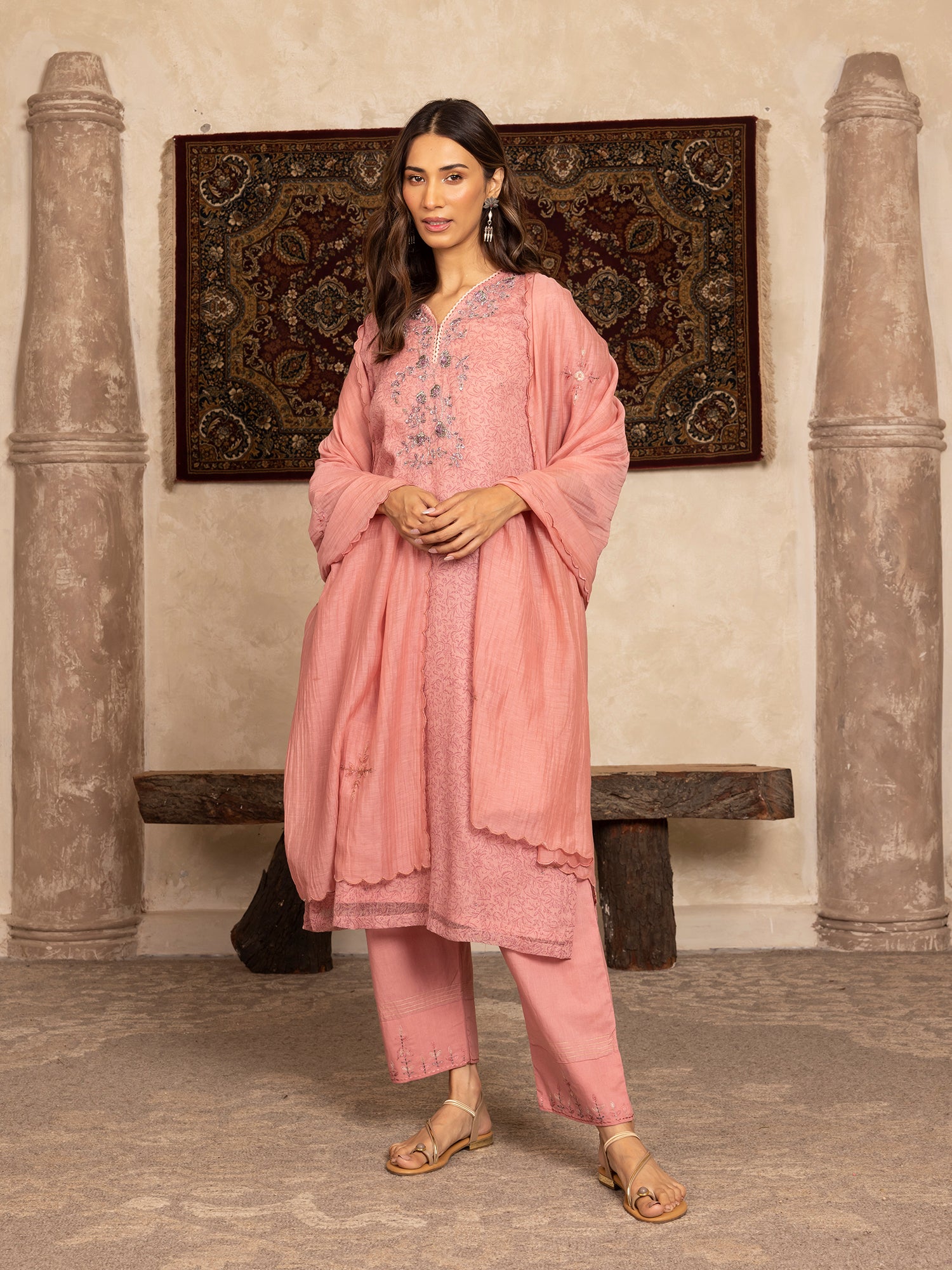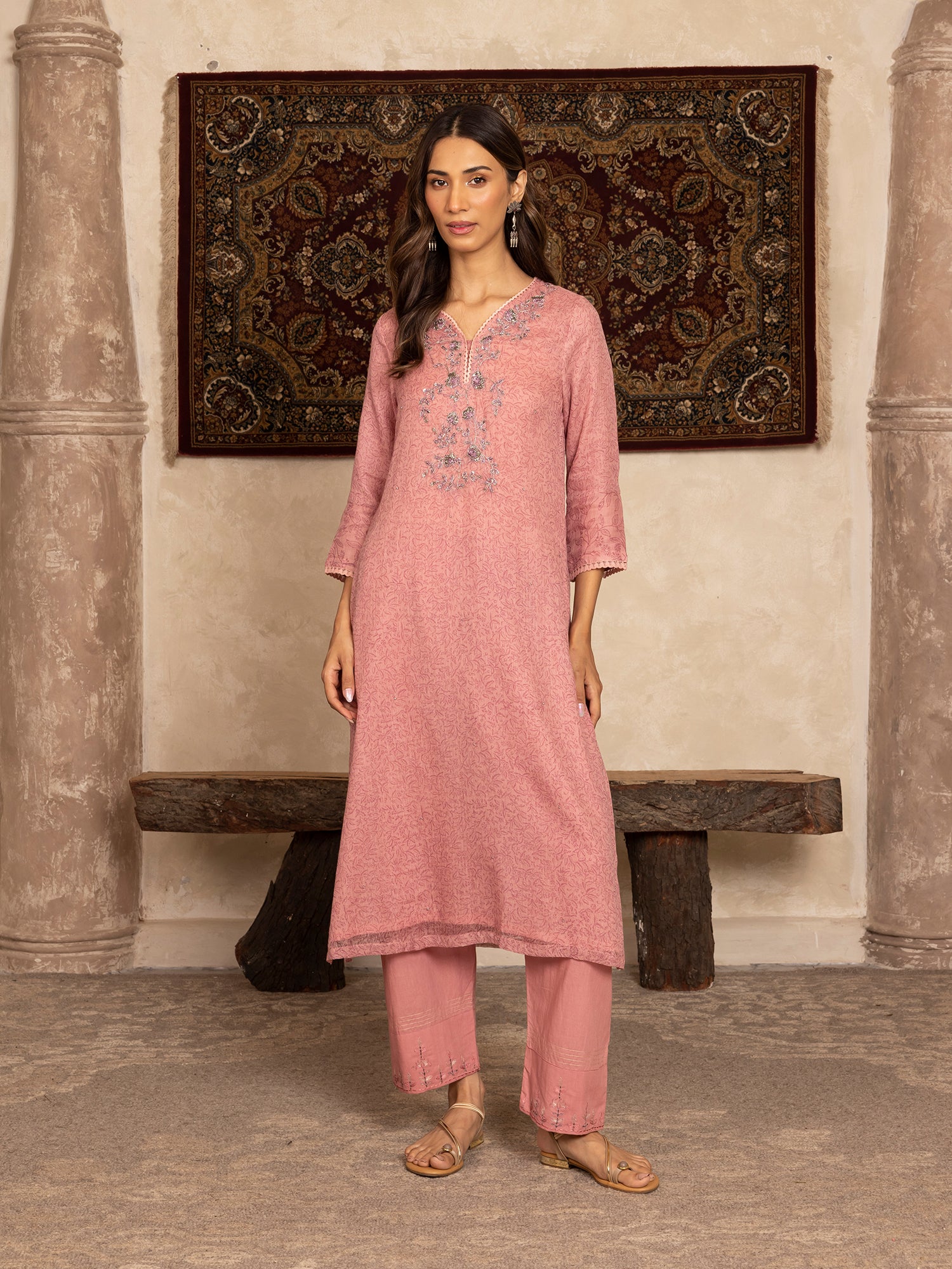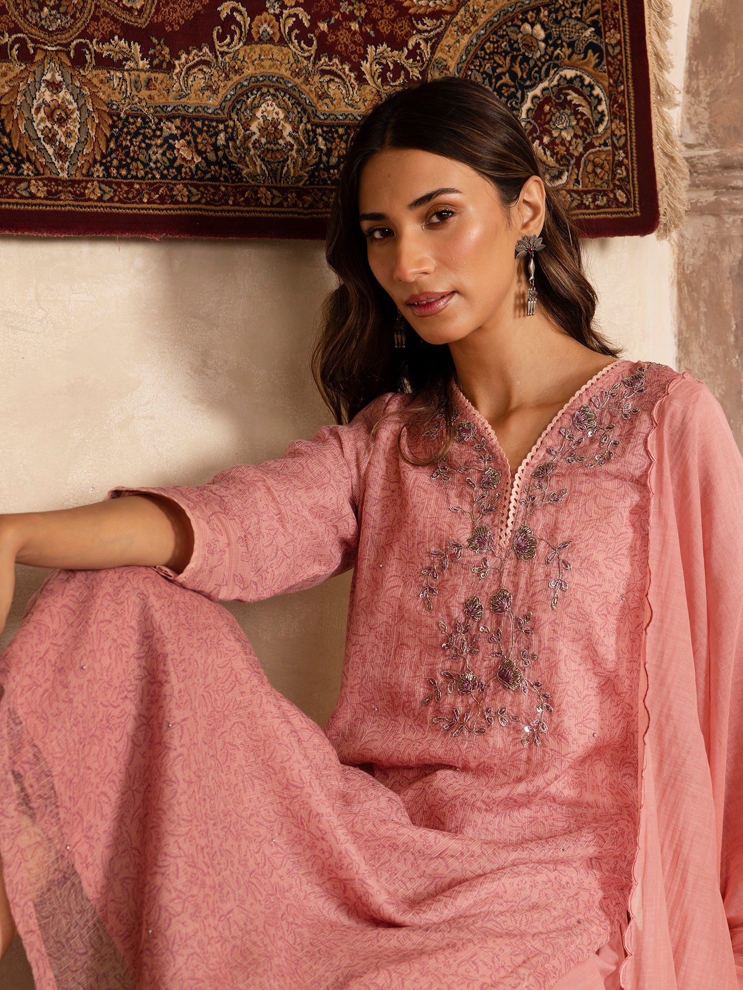 Pink hand block print kota cotton with zardozi hand embroidery kurta set