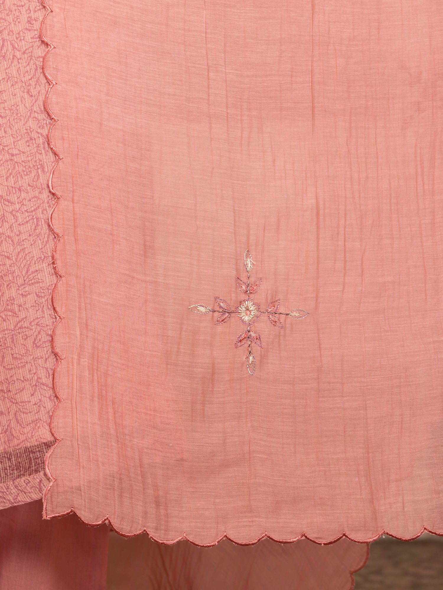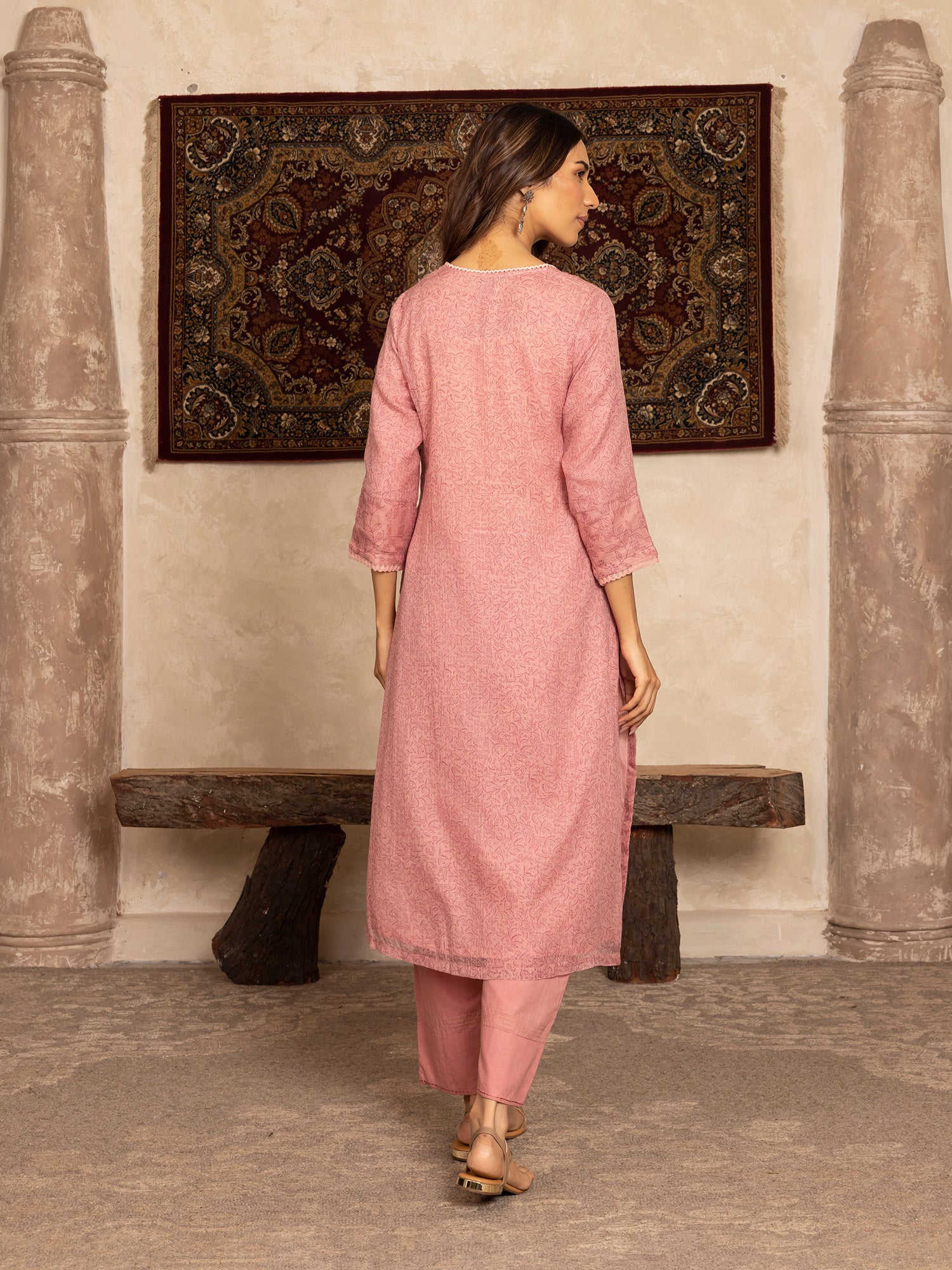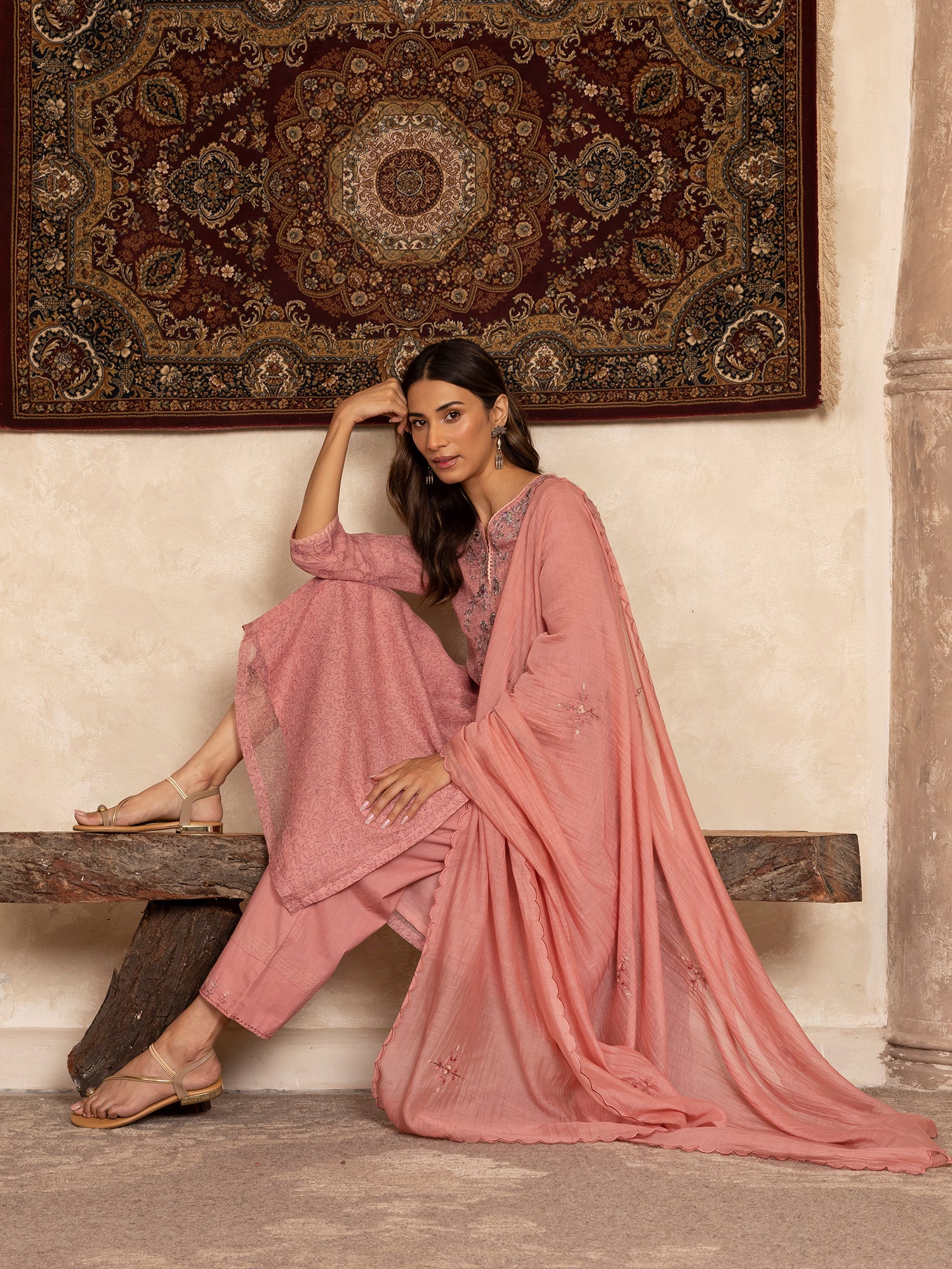 Pink hand block print kota cotton with zardozi hand embroidery kurta set