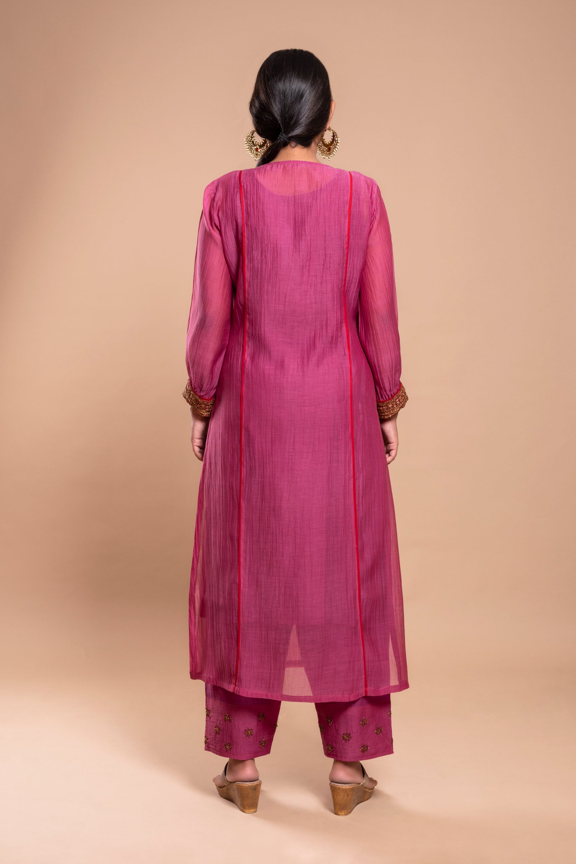 A-line chanderi silk kurta with zardozi embroidery on the yoke and sleeves along with mulmul slip.