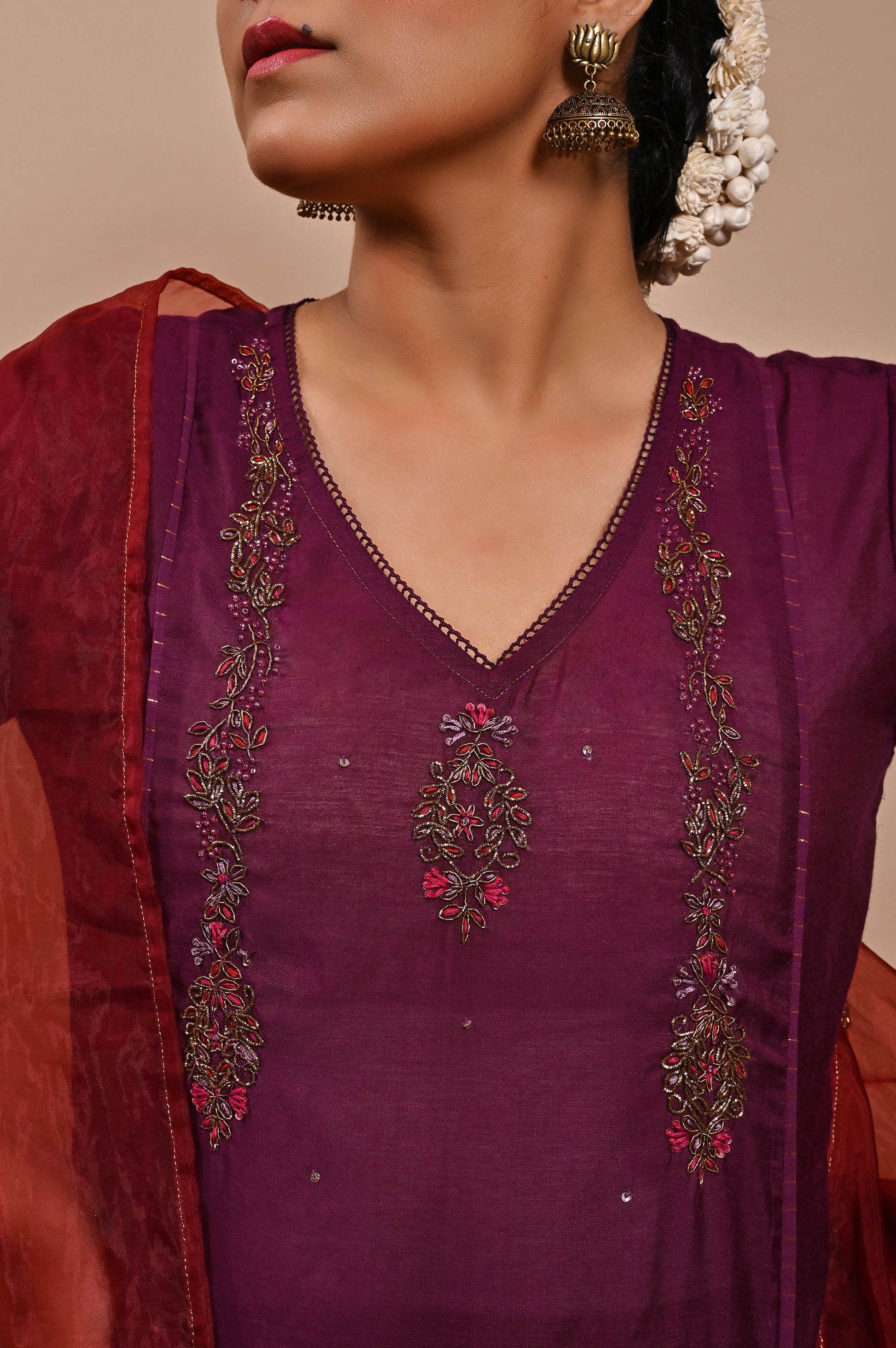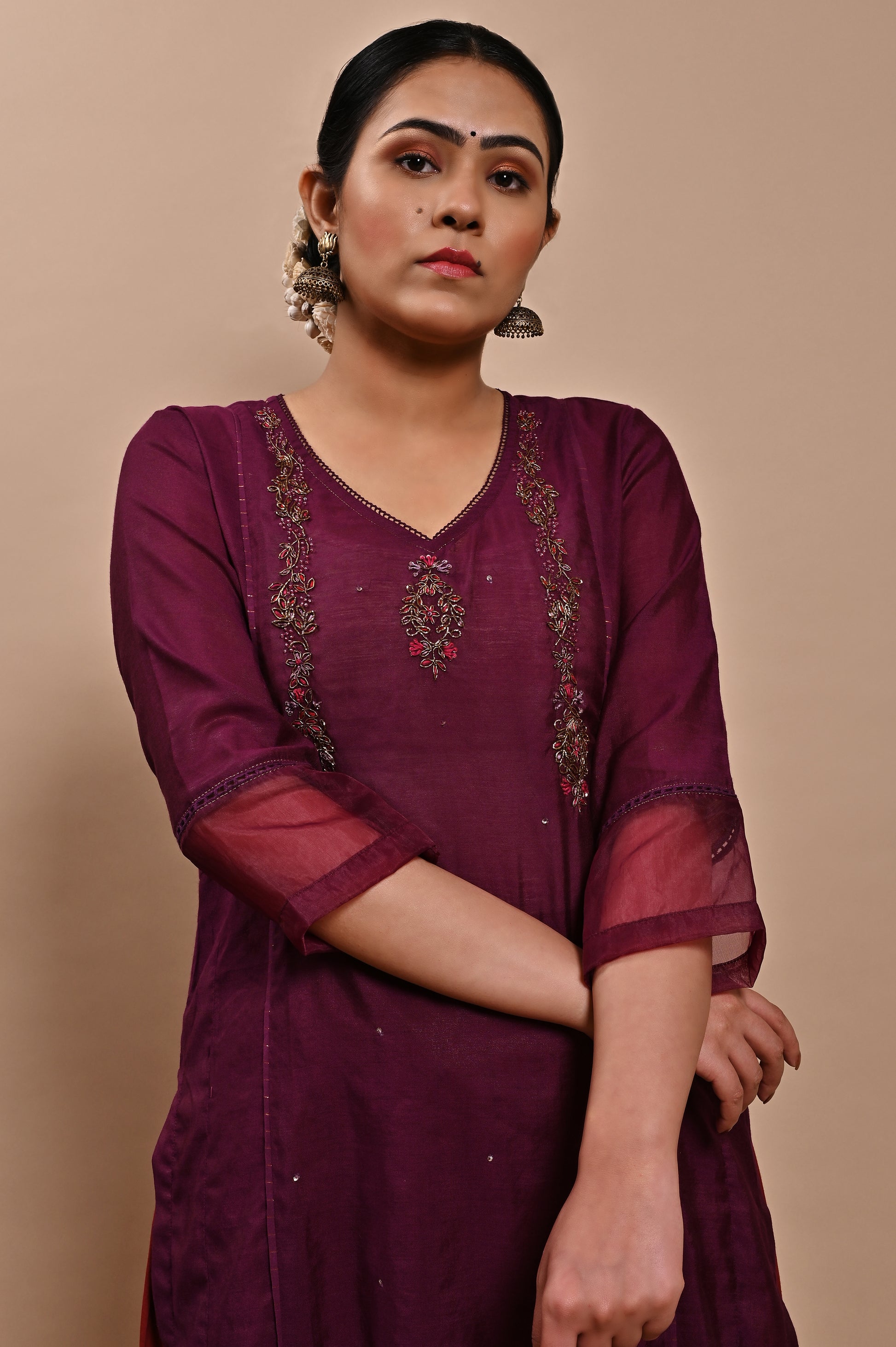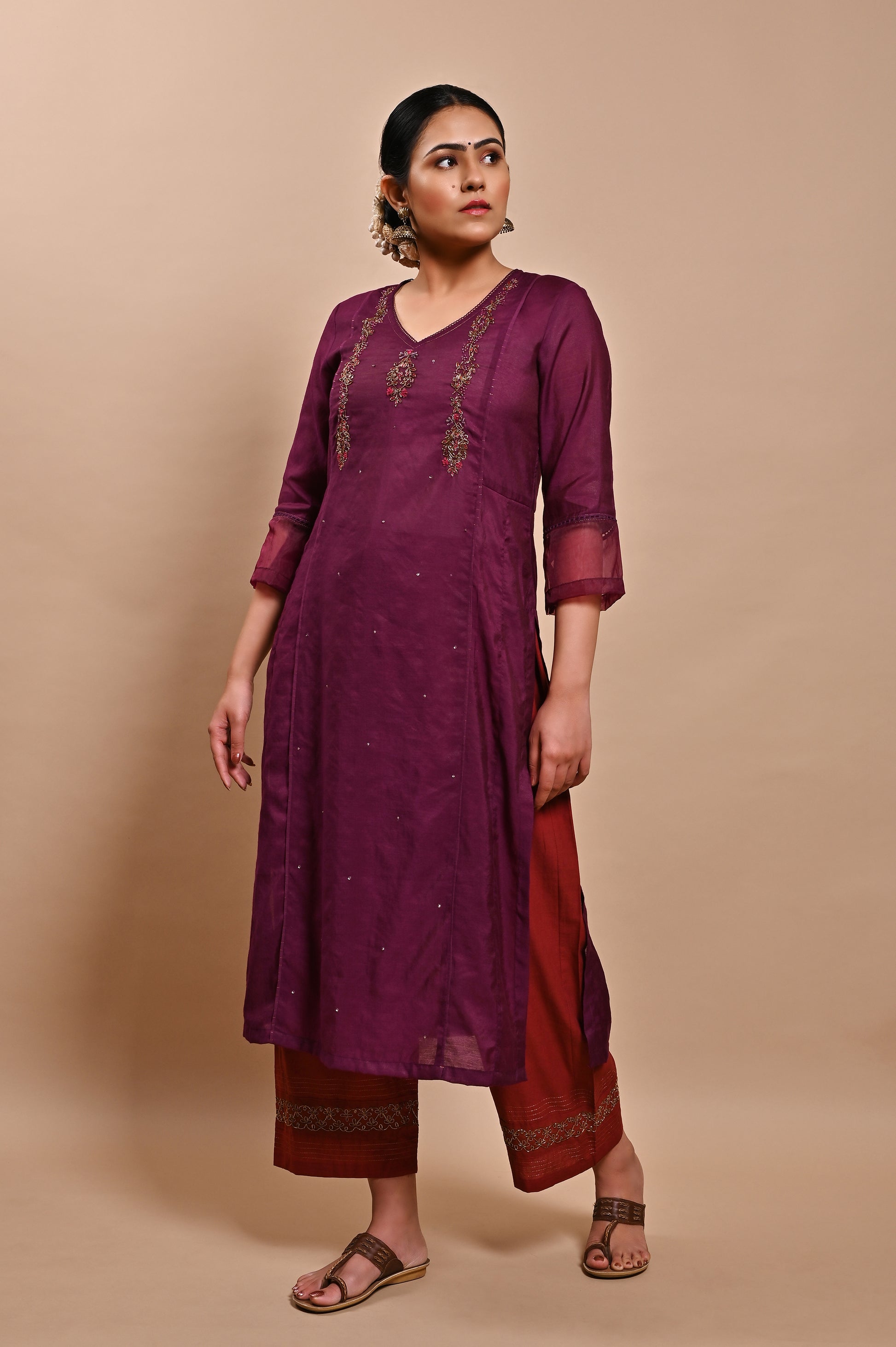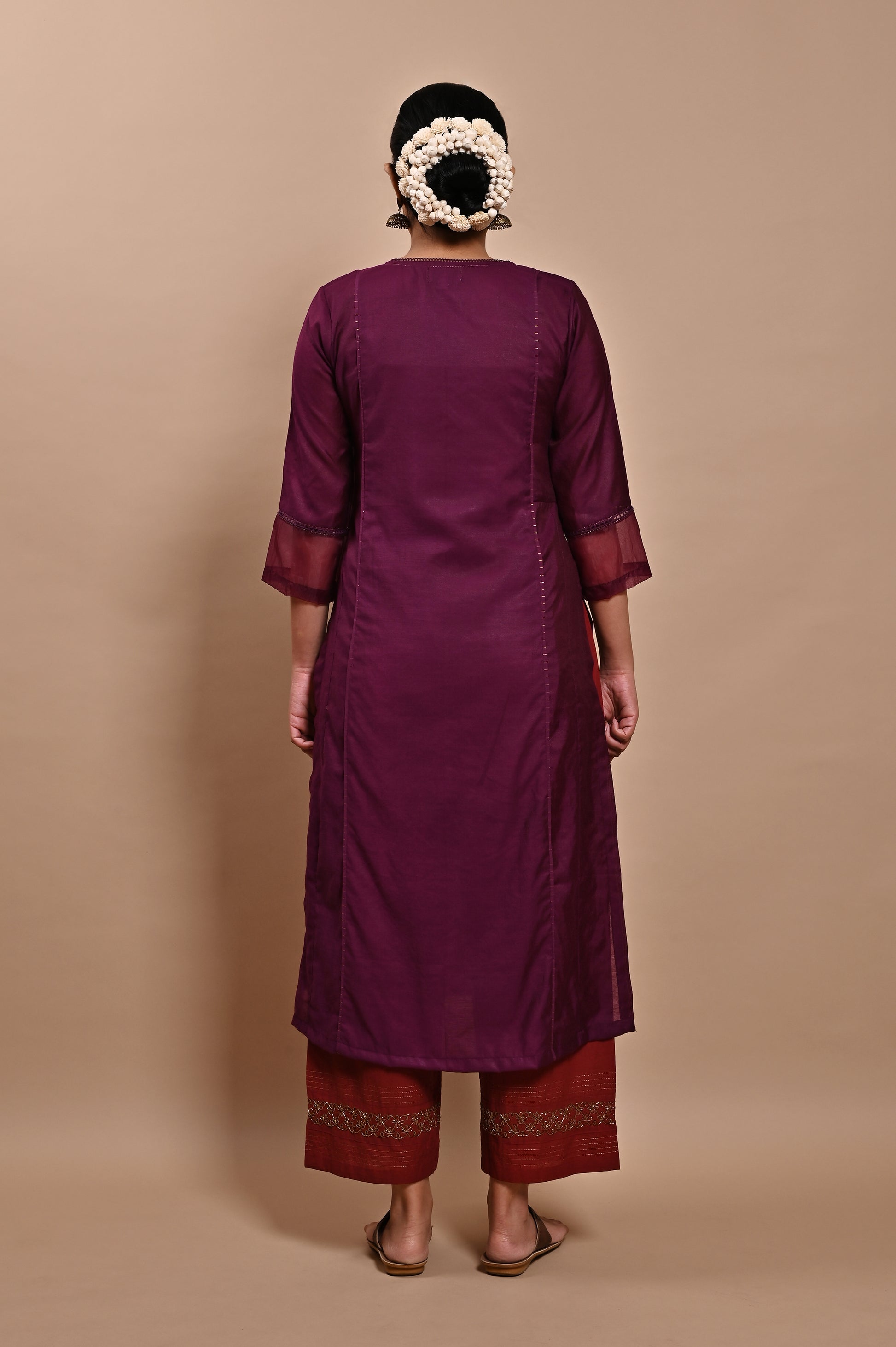 - STYLING TIP: You can style this Purple Handloom Silk Kurta from Label Yati by pairing it with a Wine palazzo and dupatta and accessorizing it with silver-toned jhumkas and embroidered slip-ons.