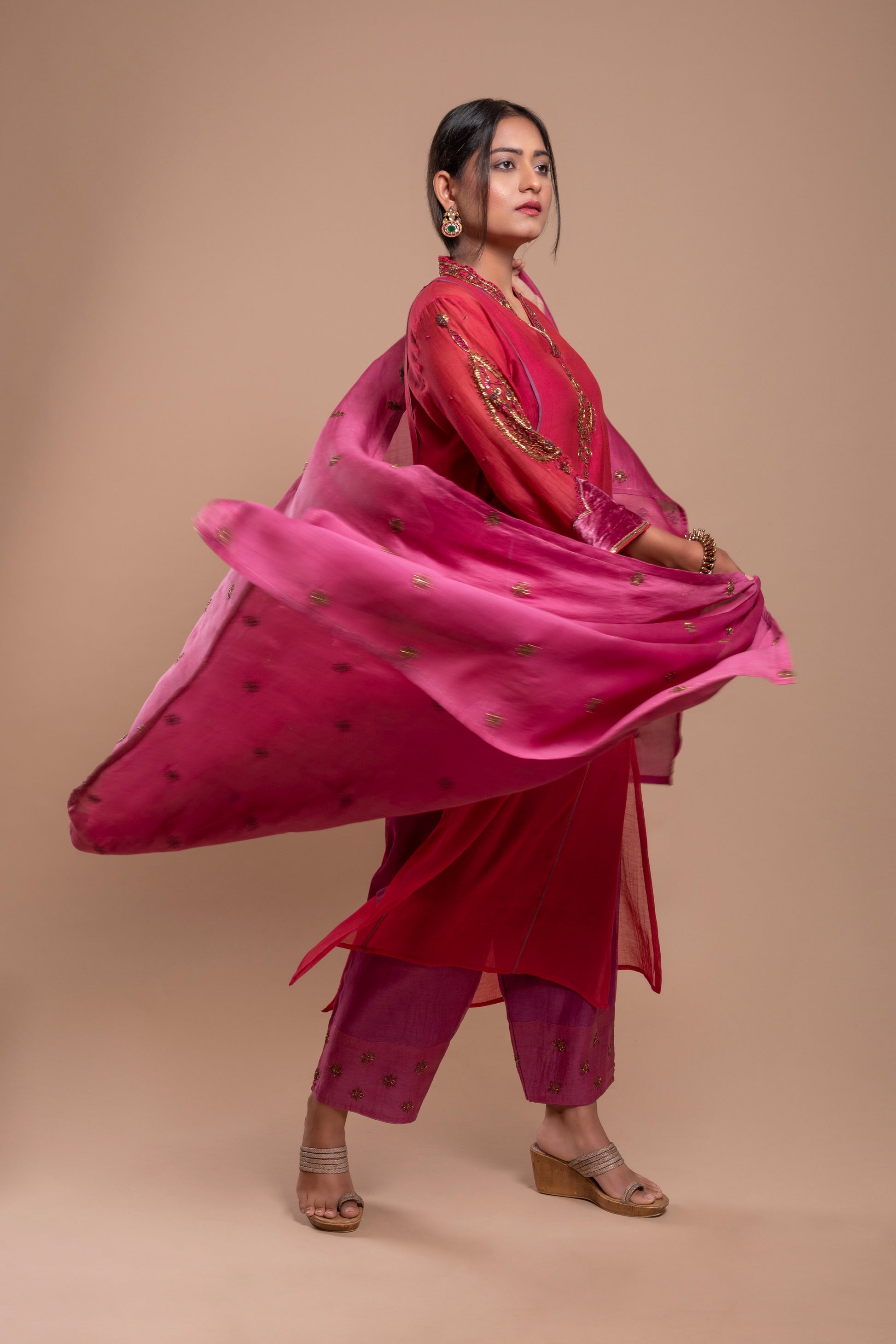 A-line chanderi silk kurta with zardozi embroidery on the neck and sleeves along with mulmul slip.