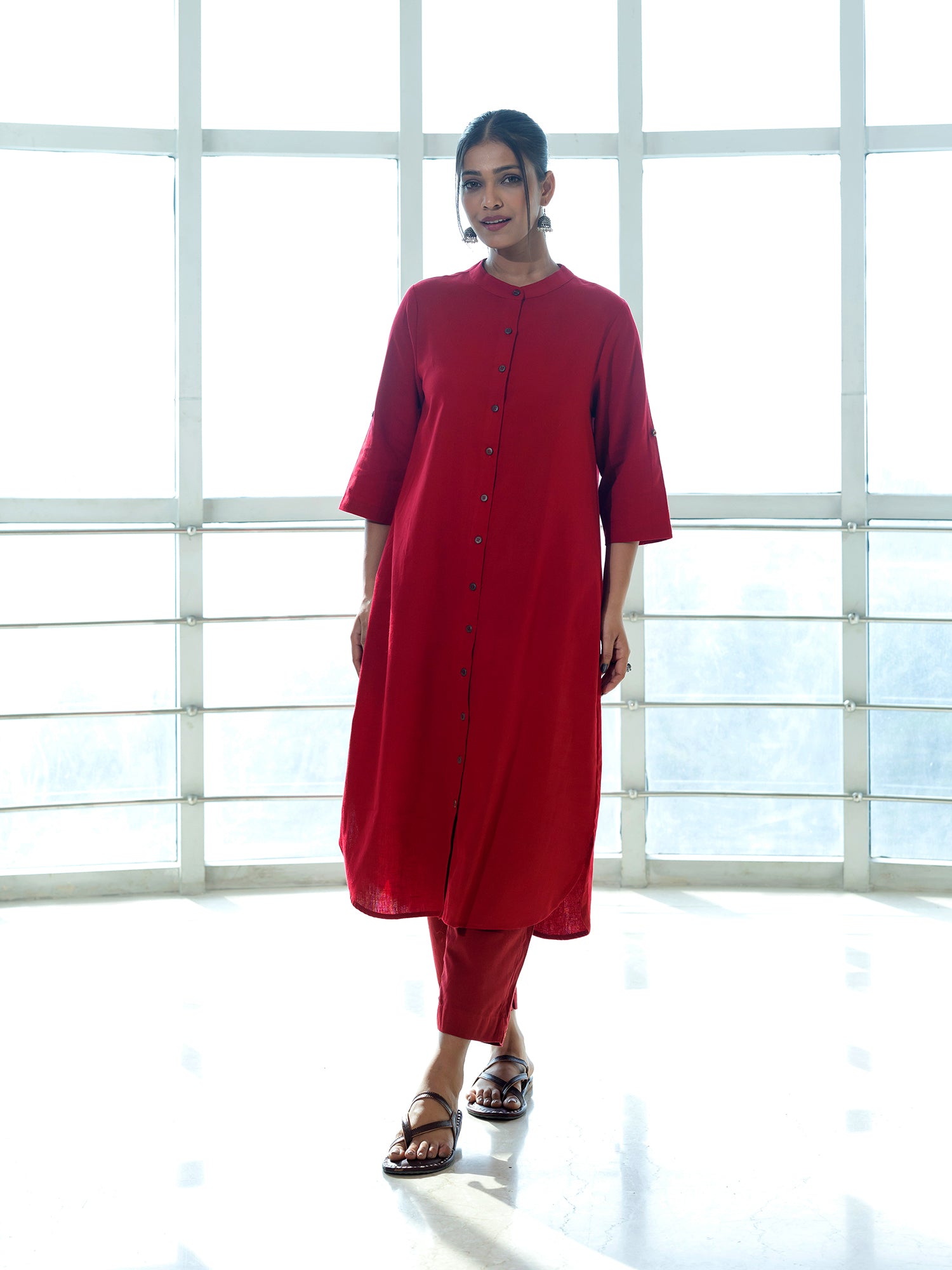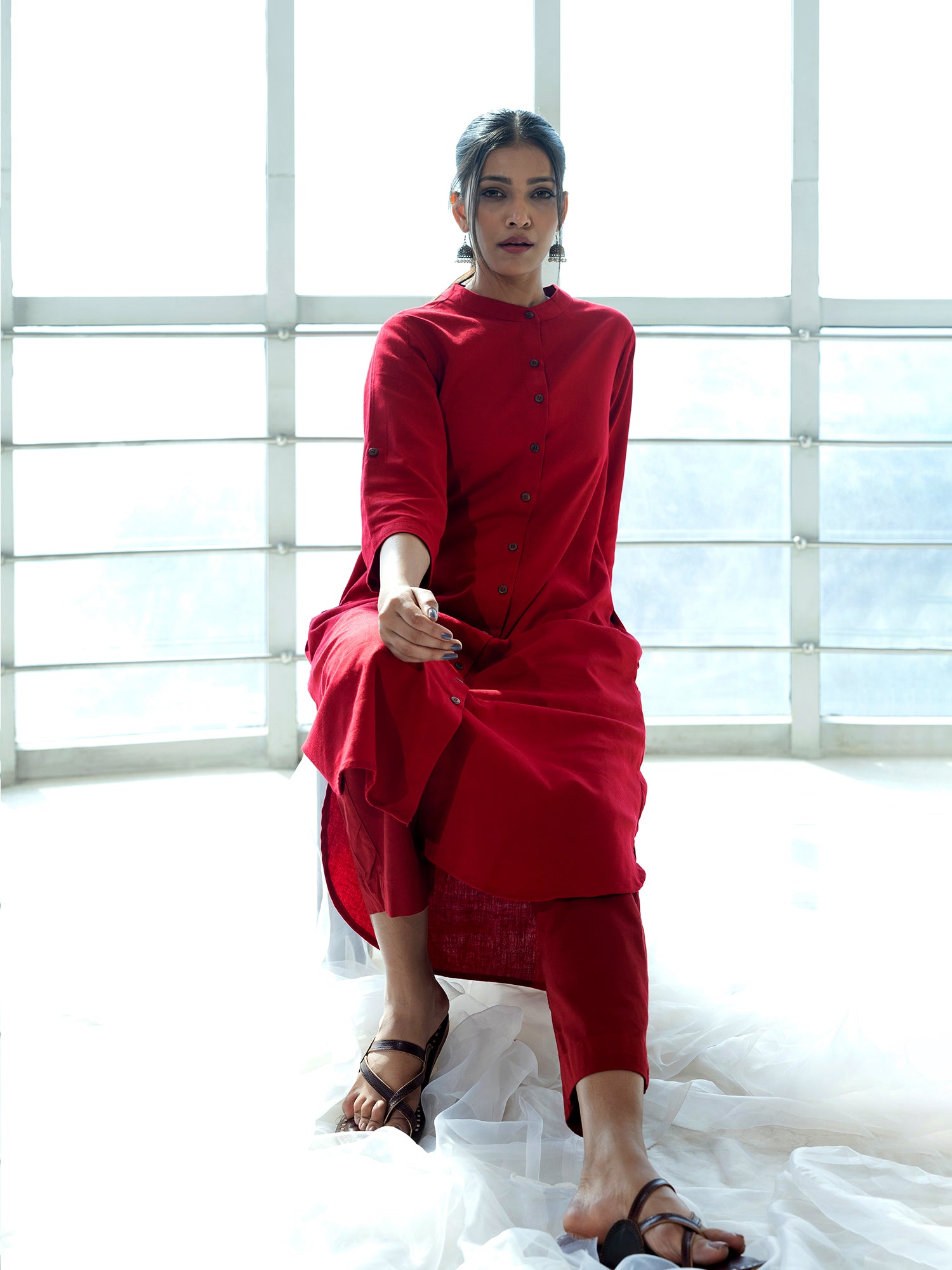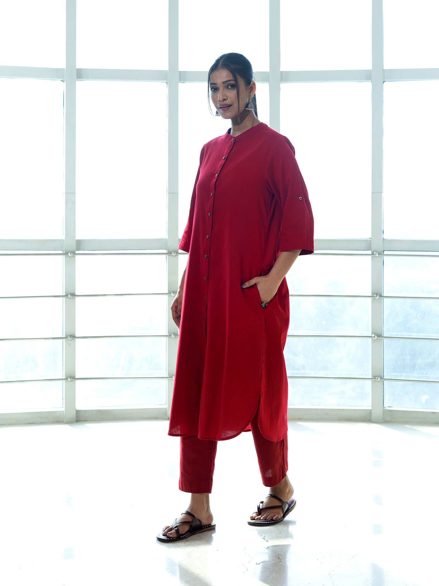 Red cotton linen a line kurta co-ord set