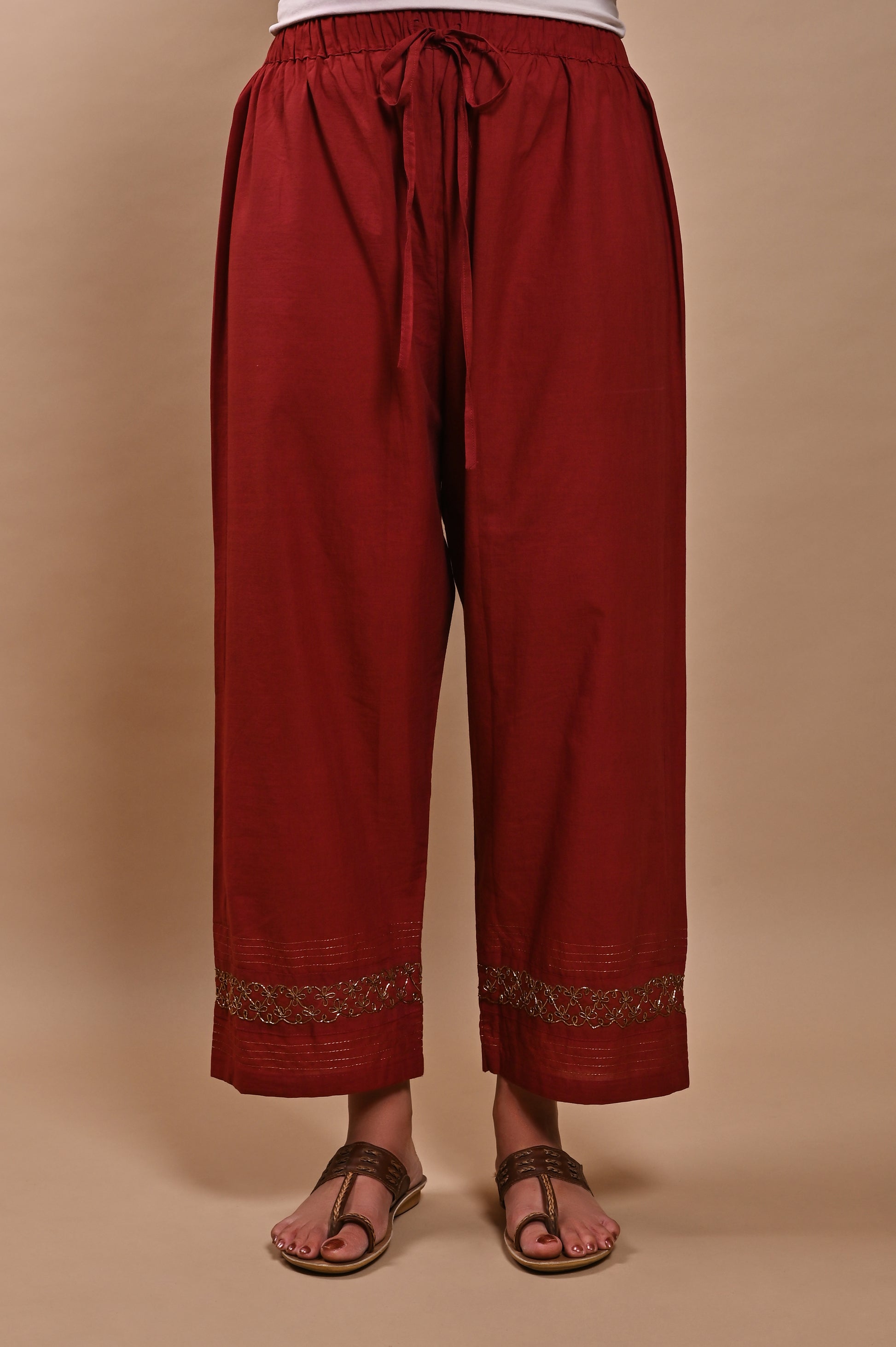- STYLING TIP: You can style these Red Zardozi Cotton Pants from Label Yati by pairing them with a matching kurta and a dupatta and accessorize them with a pair of choker and embroidered slip-ons.