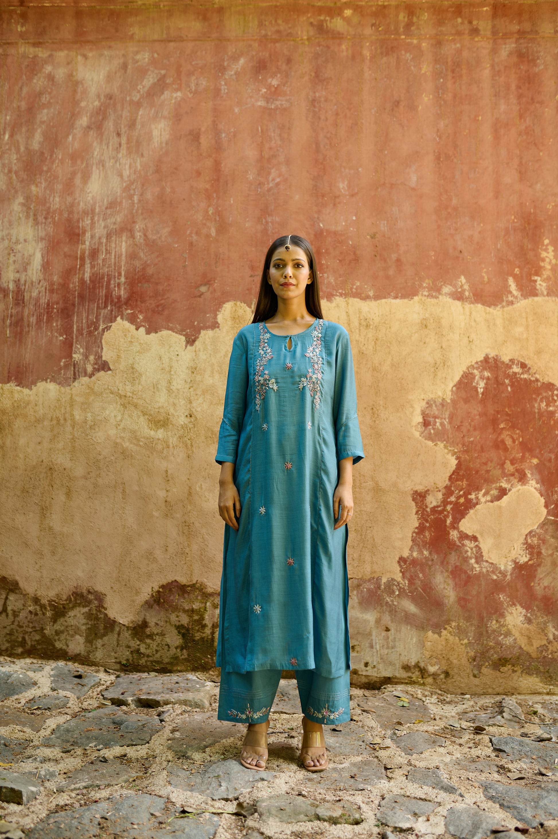Sea Blue Cotton Silk Zardozi Kurta Set