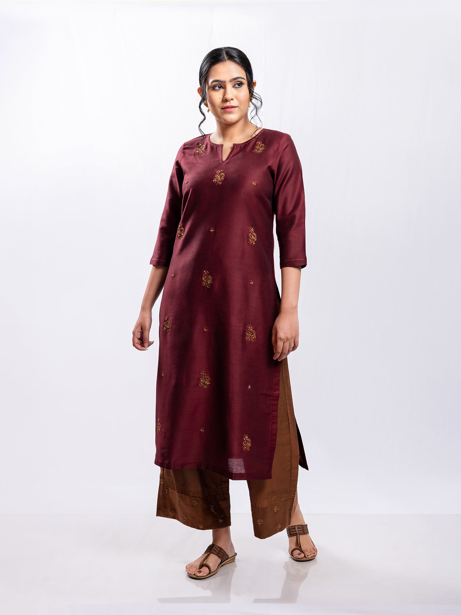 - DETAILS: Dabka, nakshi with beads and sequence aari work on collar and all over at the front, side slits for easy mobility.