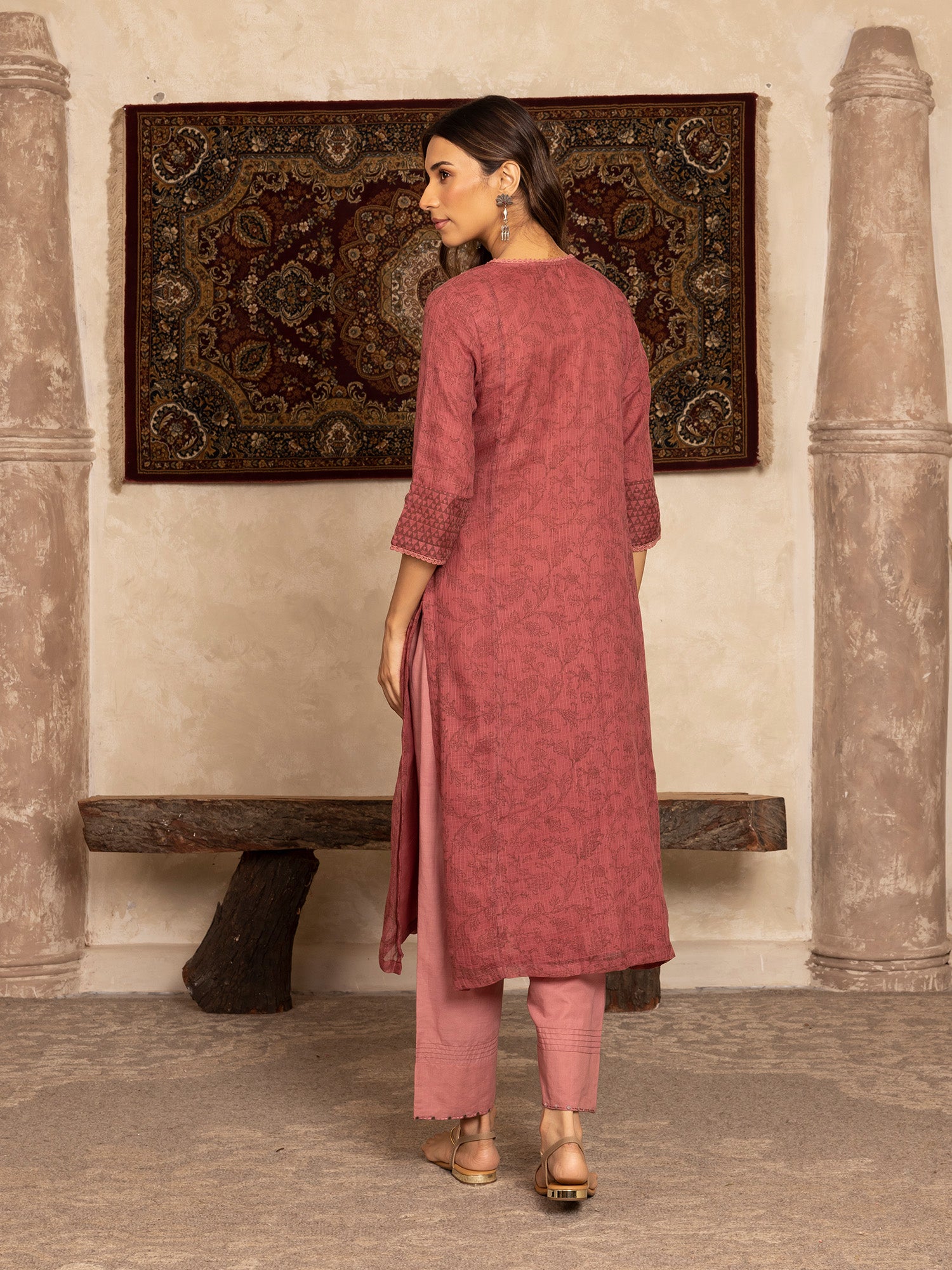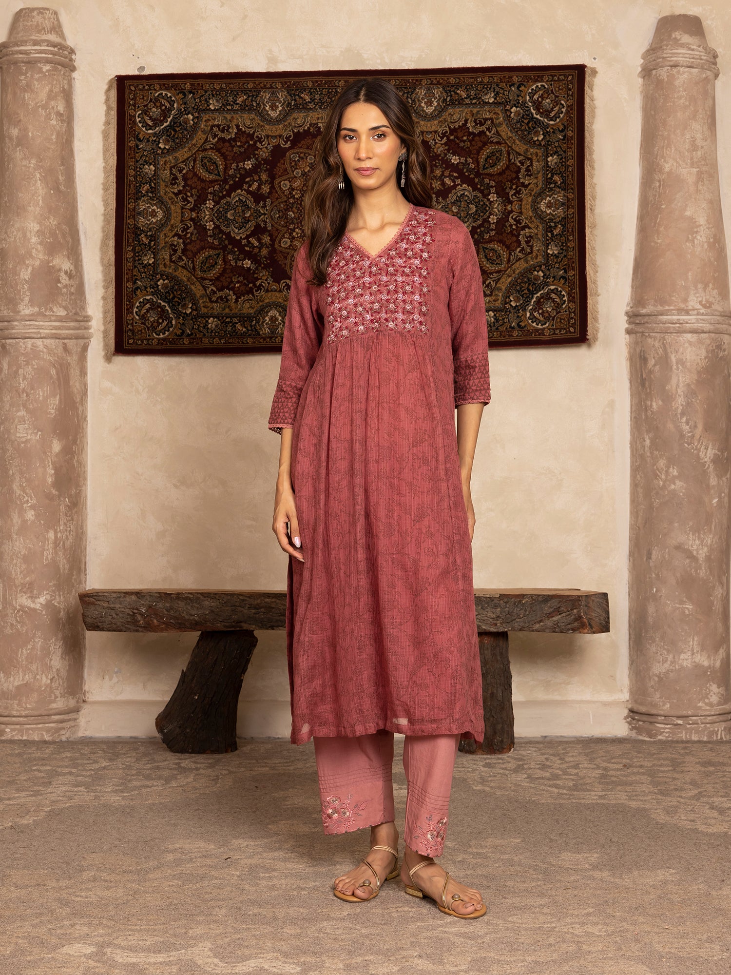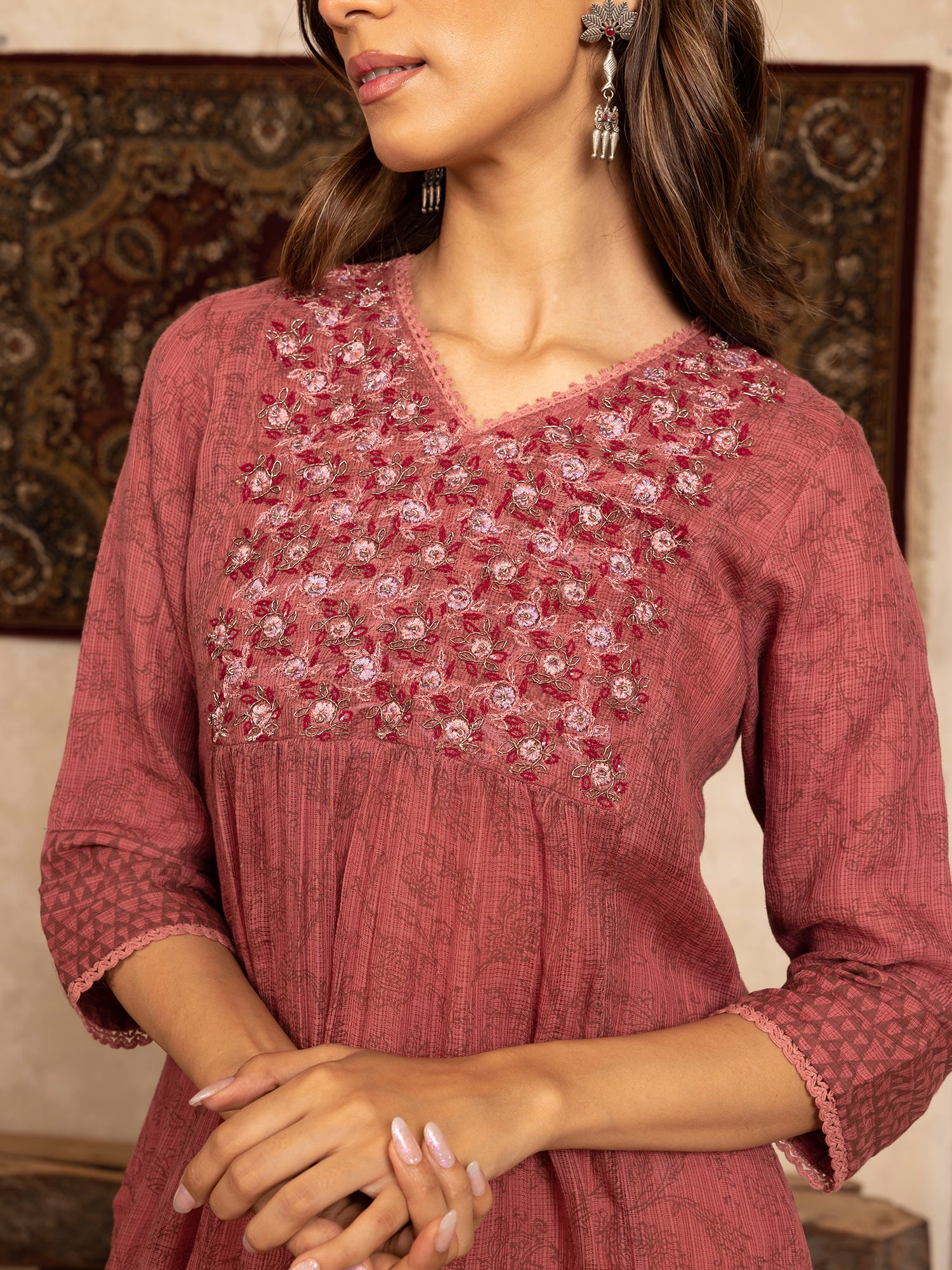 - DETAILS: hand block print with thread and dabka zardozi hand embroidery at the yoke with beautiful lace detailing, side slits for easy mobility.